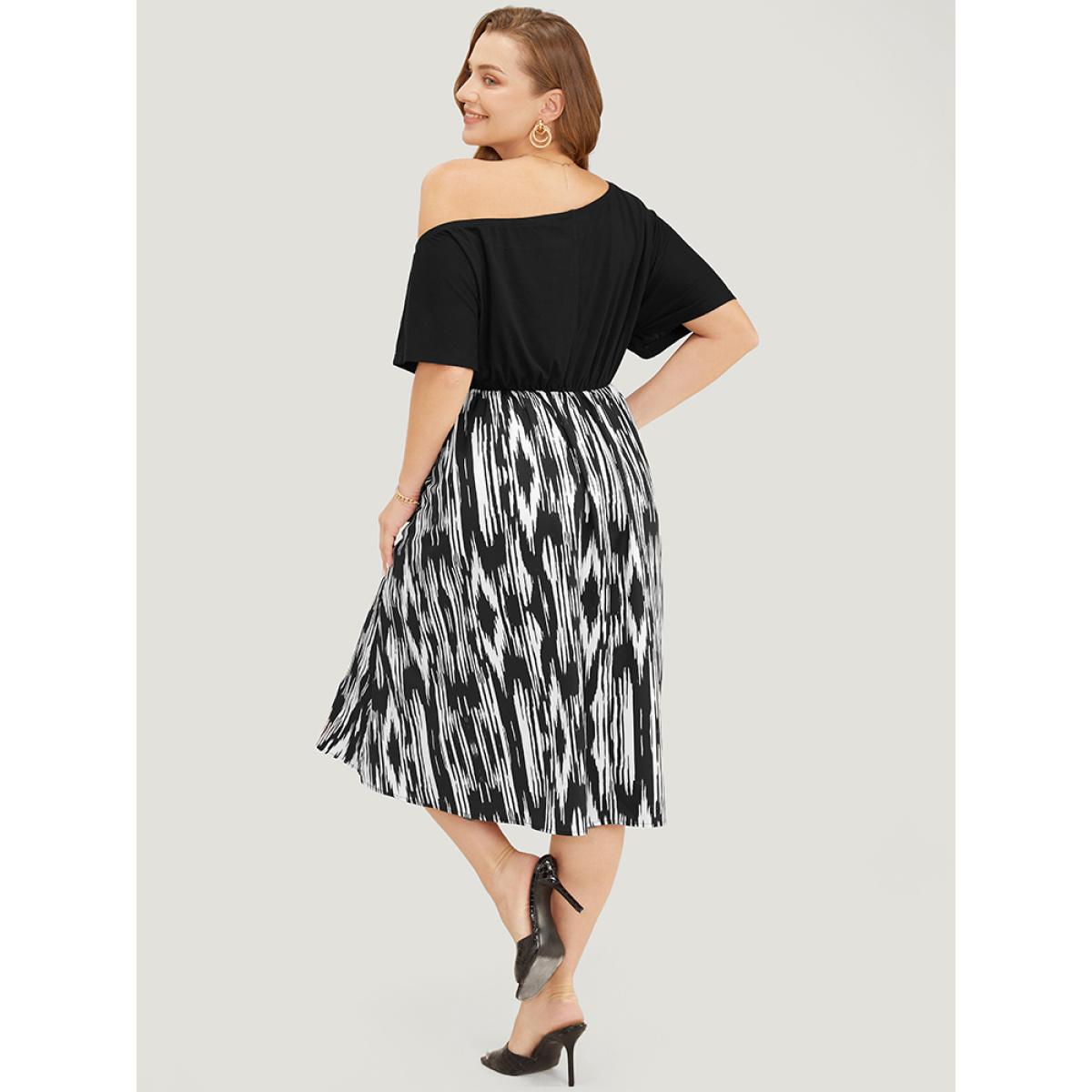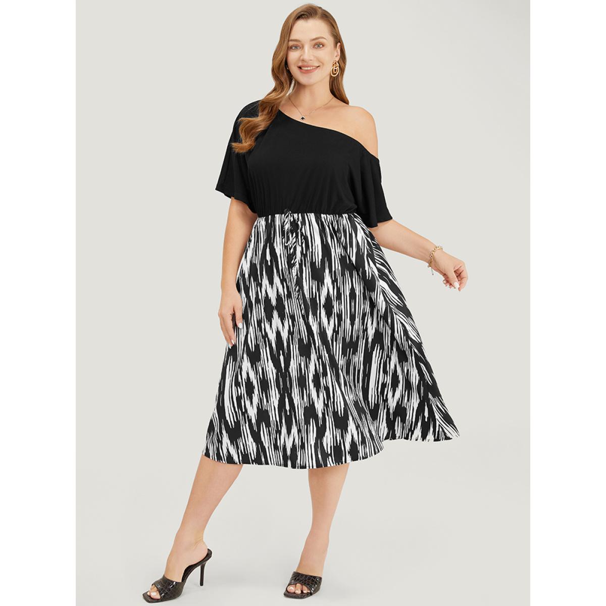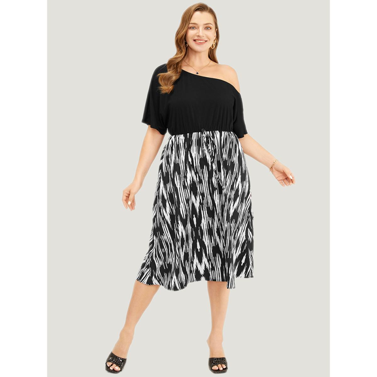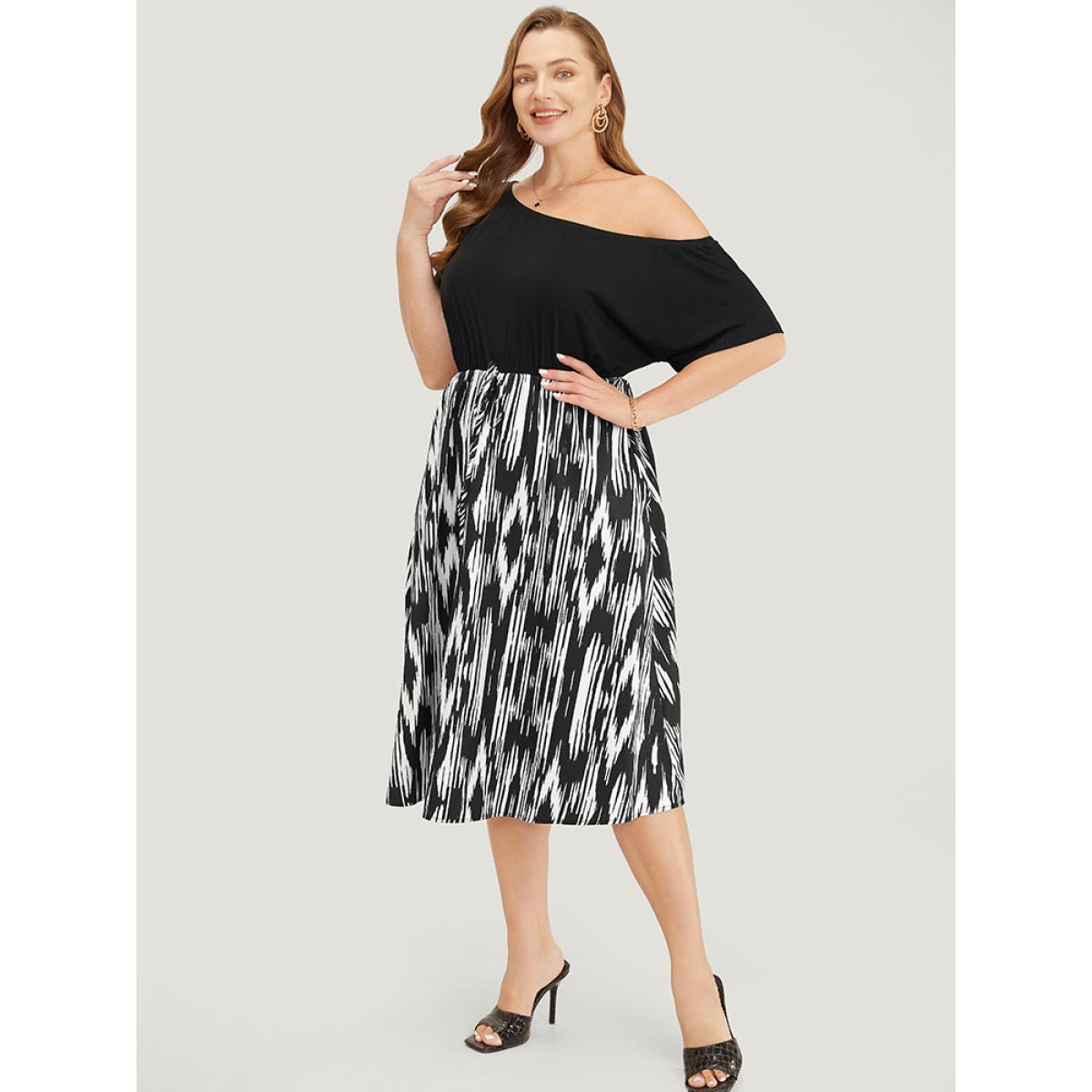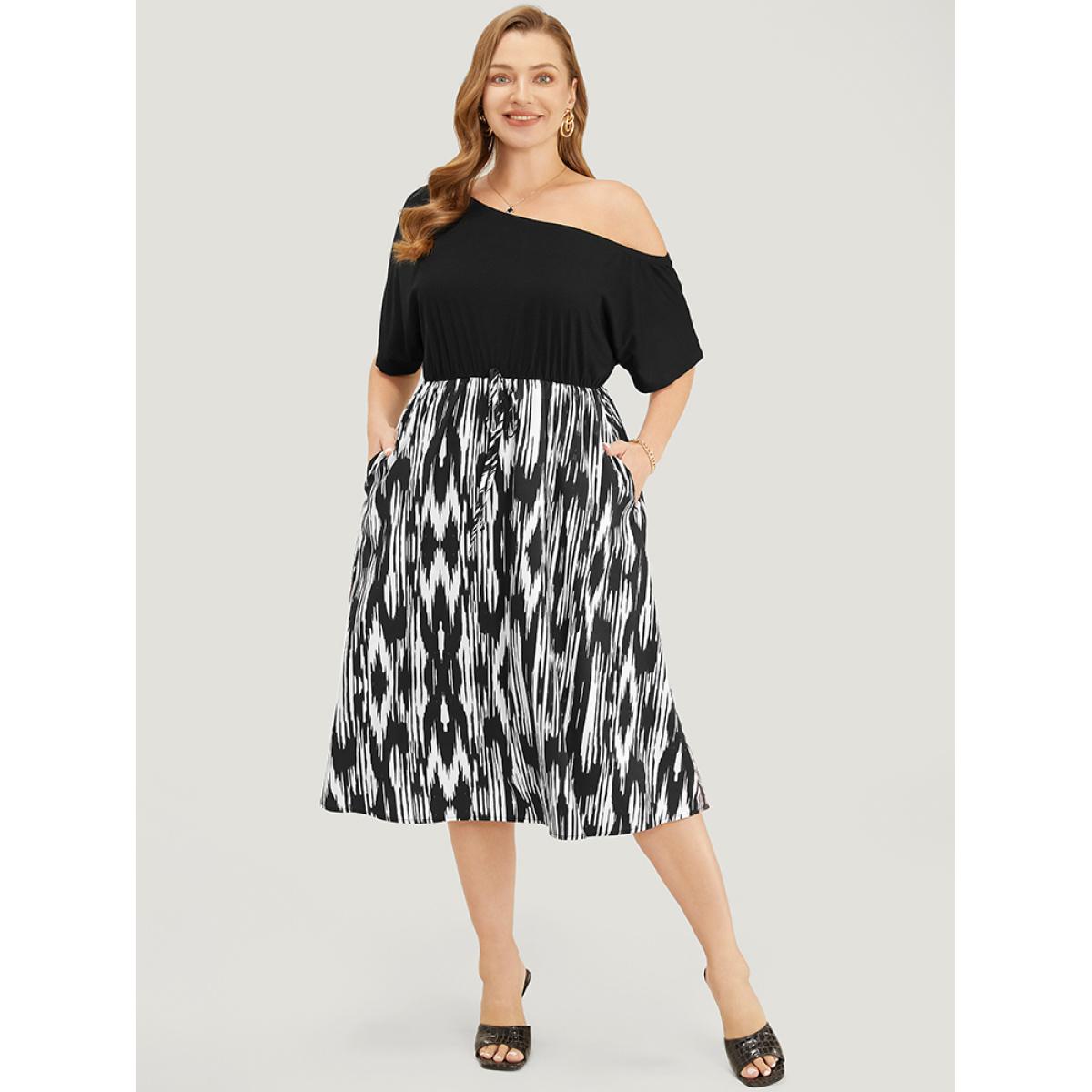 Plus Size Pixel Geometric Patchwork Pocket One Shoulder Dress Black Women Elegant Gathered One Shoulder Short sleeve Curvy Midi Dress BloomChic 14-16/1X