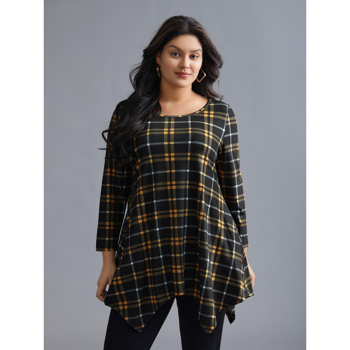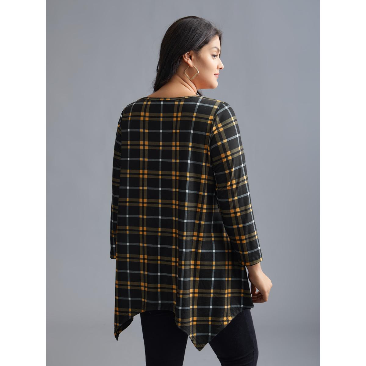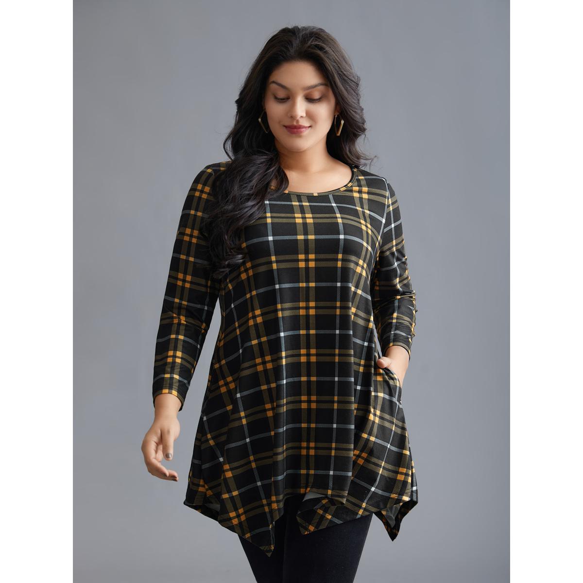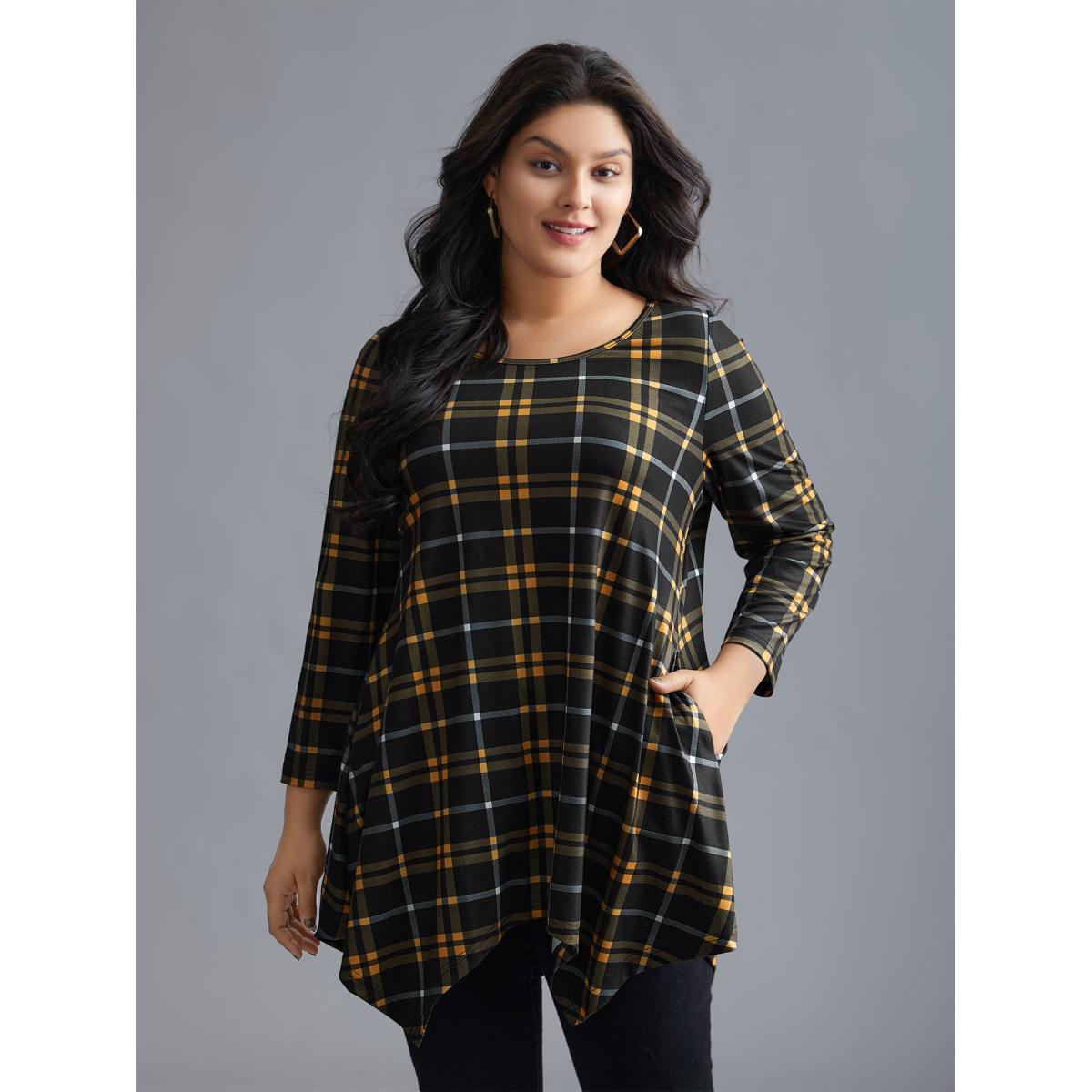 Plus Size Plaid Asymmetrical Hem Pocket T-shirt Lightyellow Women Casual Asymmetrical Round Neck Loose Everyday T-shirts BloomChic 26/4X