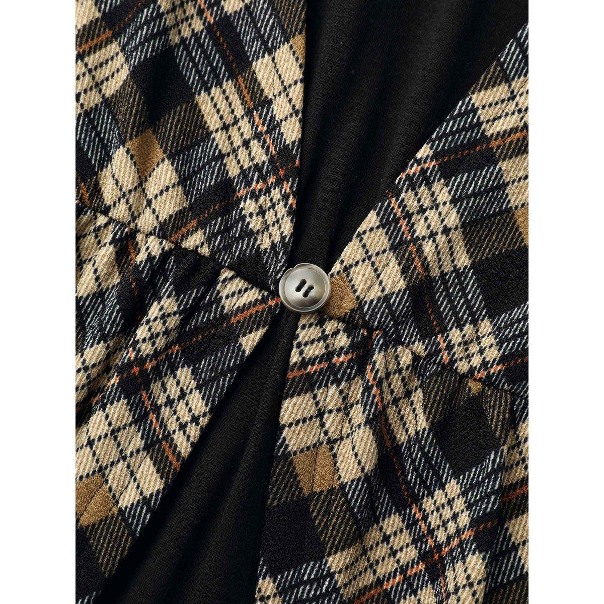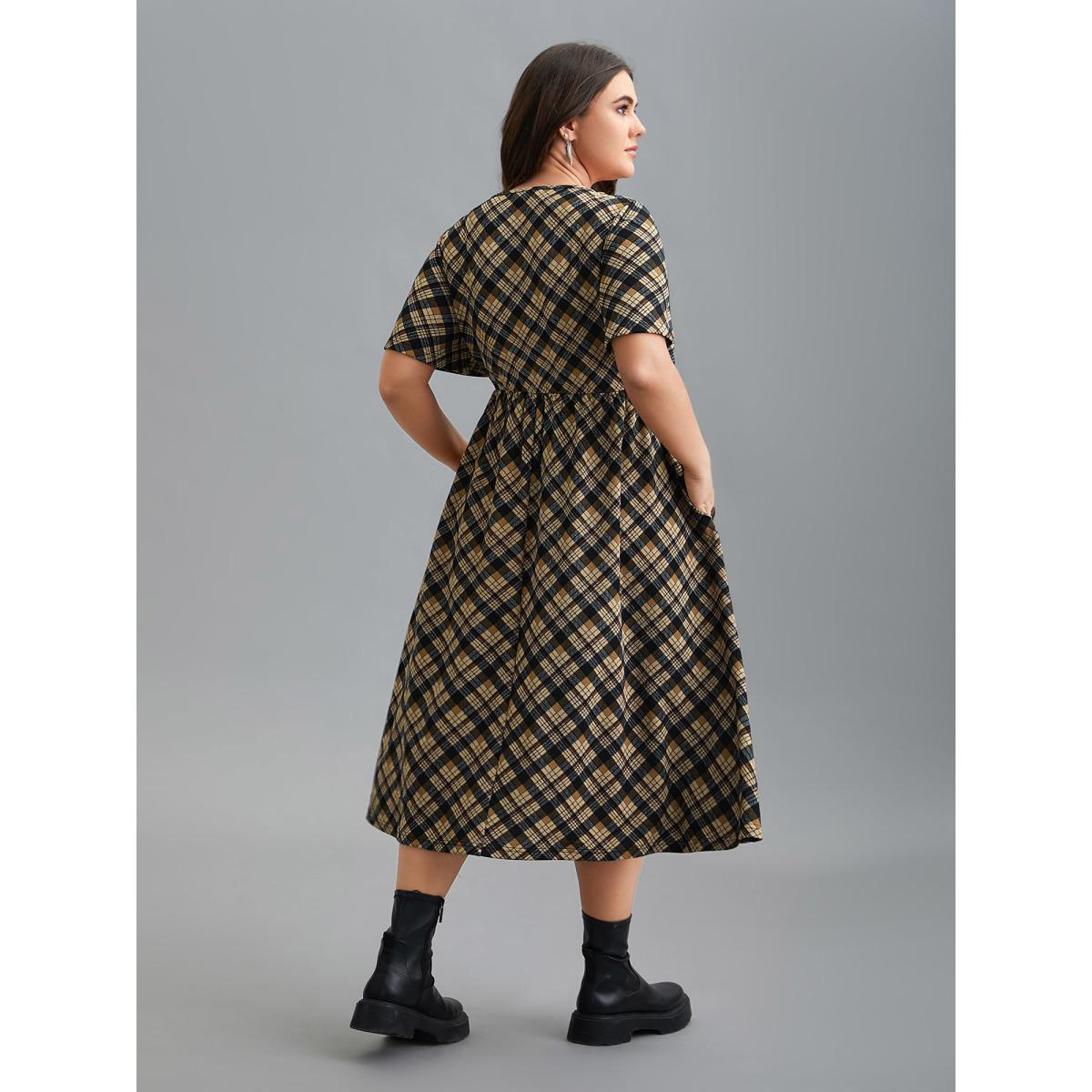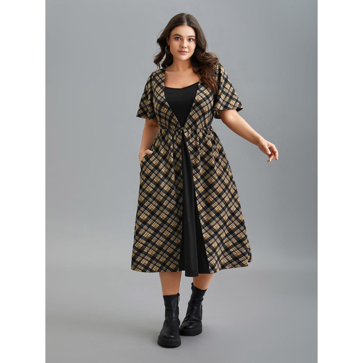 Plus Size Plaid Color-Block Ruched Open Midi Dress Tan Women Casual Patchwork Heart neckline Short sleeve Curvy BloomChic 22-24/3X