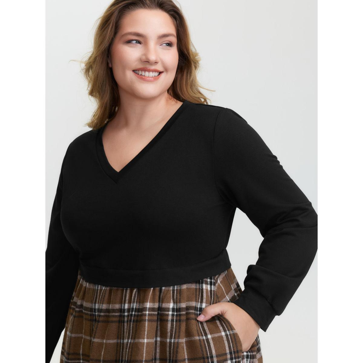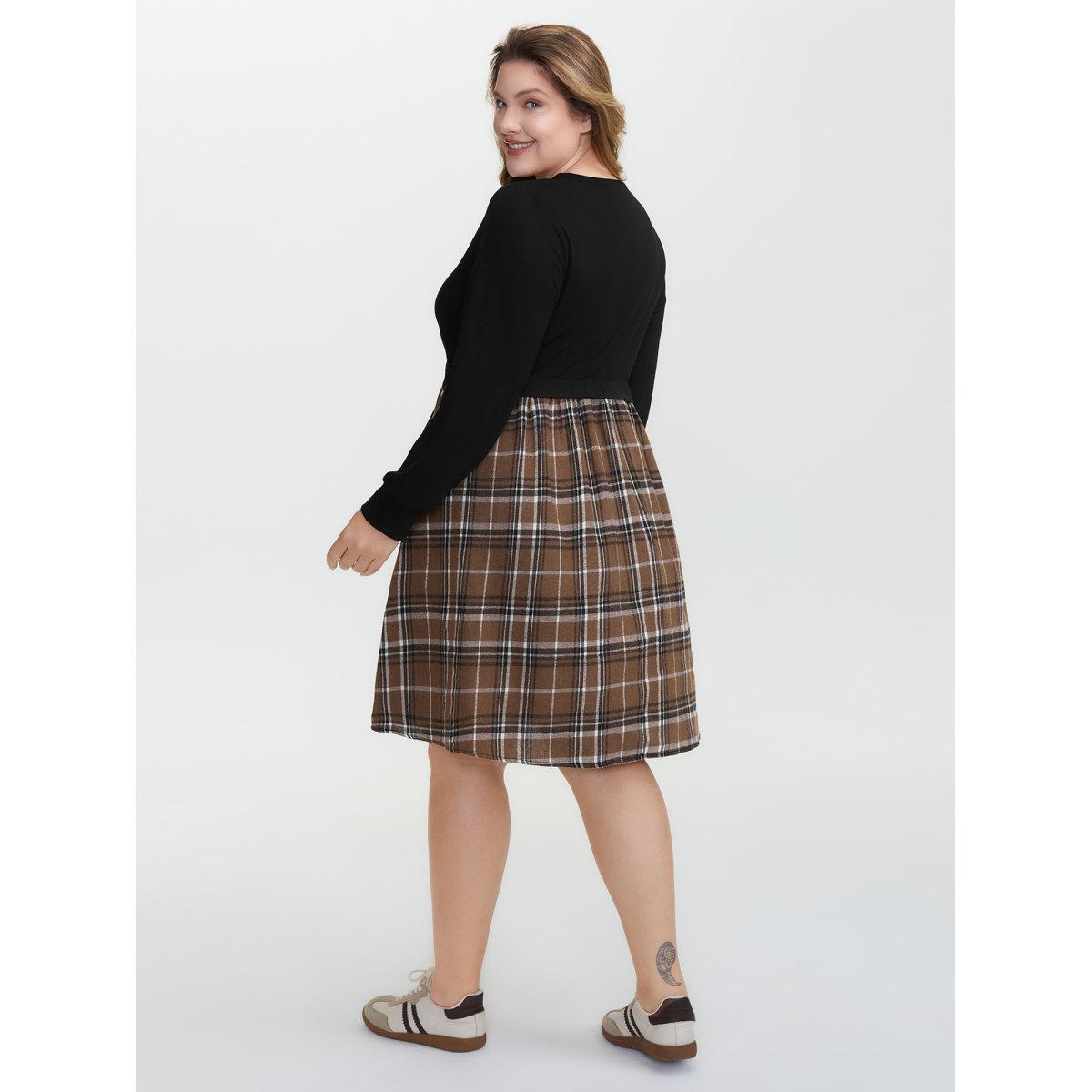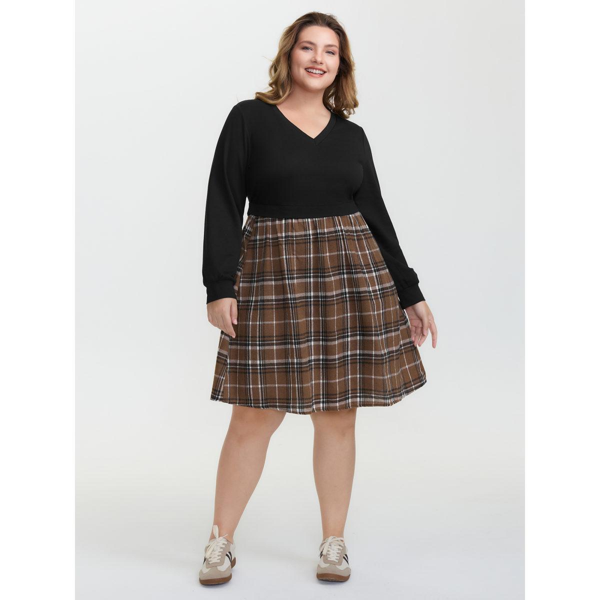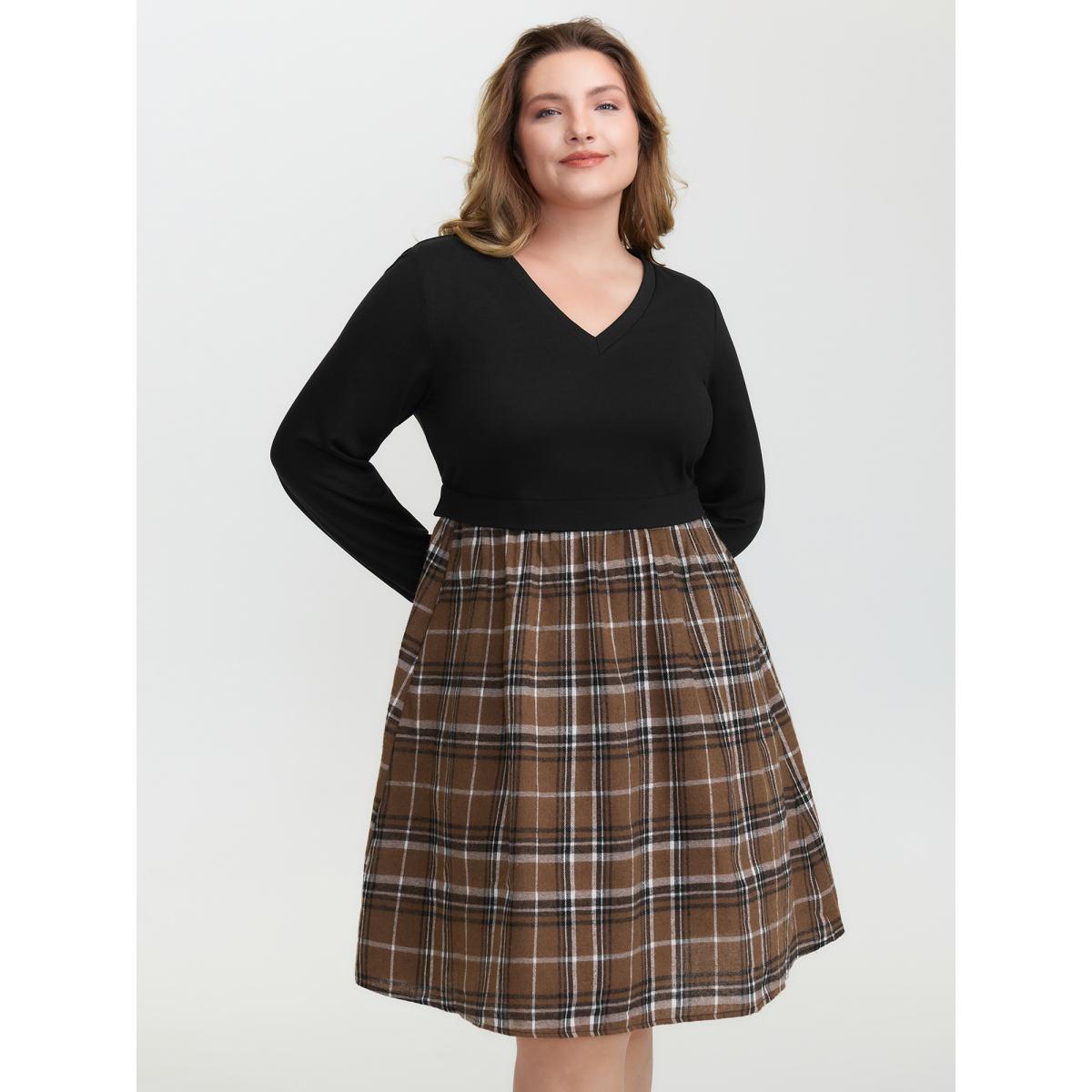 Plus Size Plaid Color Contrast Stretchy Knee-Length Dress Black Women Leisure Contrast V-neck Extra Long Sleeve Curvy BloomChic 28/5X