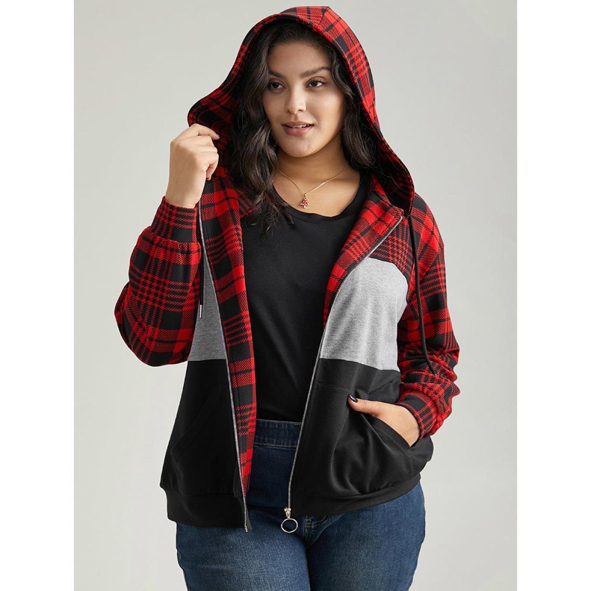 Plus Size Plaid Contrast Patchwork Drawstring Zipper Jacket Women Raspberry Contrast Pocket Dailywear Jackets BloomChic 22-24/3X