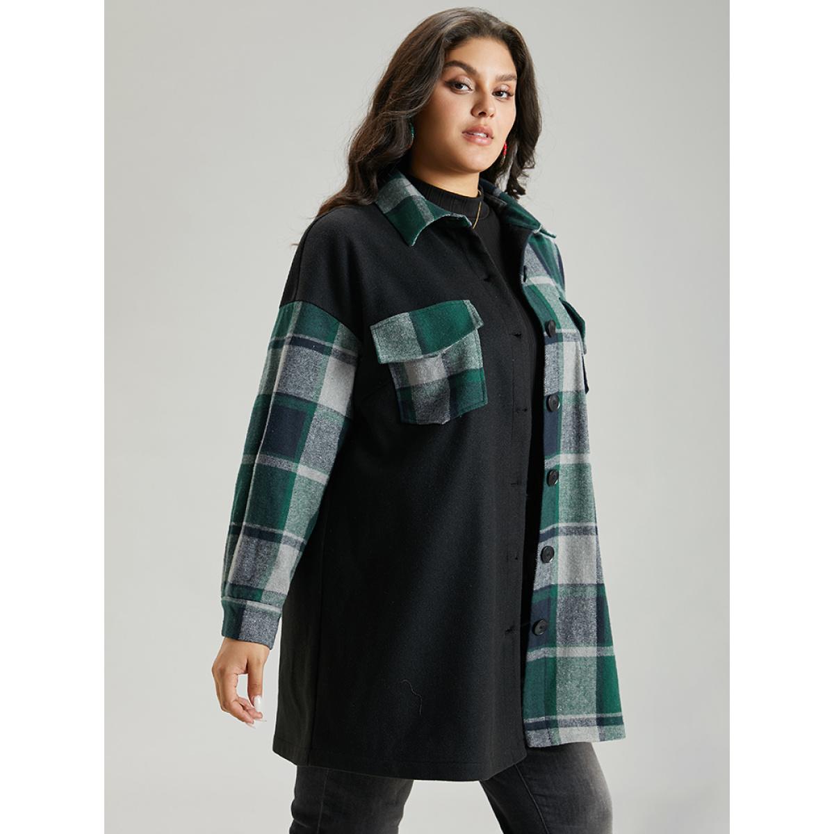 Plus Size Plaid Contrast Patchwork Pocket Button Up Shacket Women Green Contrast Pocket Dailywear Jackets BloomChic 10/M