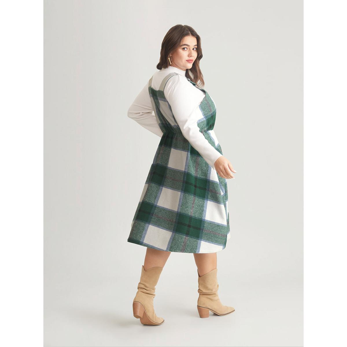 Plus Size Plaid Elastic Waist Button Detail Adjustable Straps Dress DarkGreen Women Casual Adjustable Straps Spaghetti Strap Sleeveless Curvy Midi Dress BloomChic 12/L