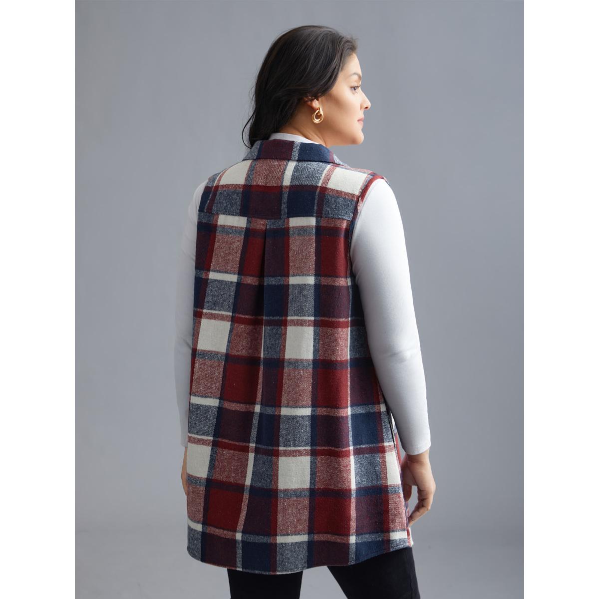 Plus Size Plaid Flap Detail Sleeveless Jacket Women Burgundy Button Side seam pocket Casual Jackets BloomChic 30/6X Product Image