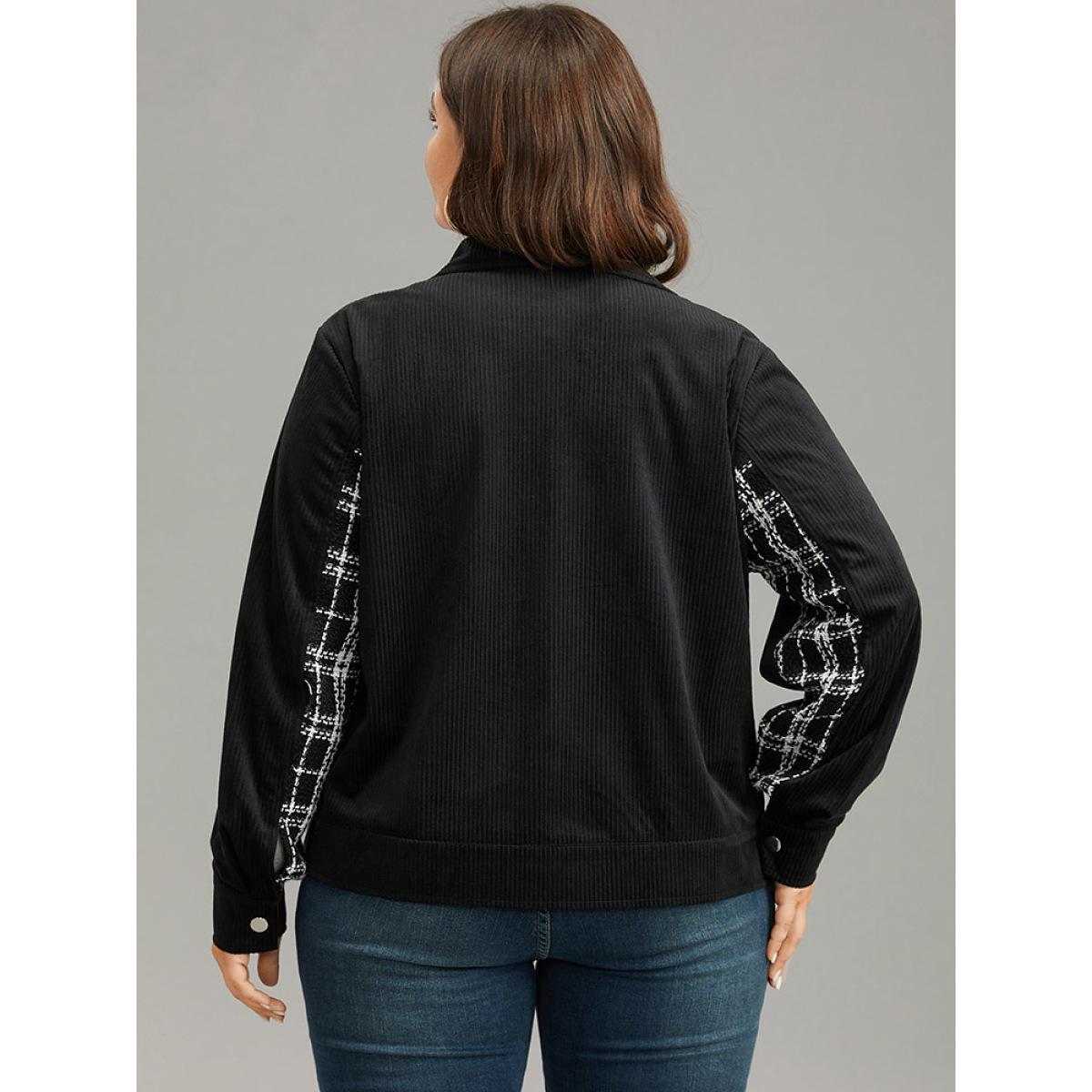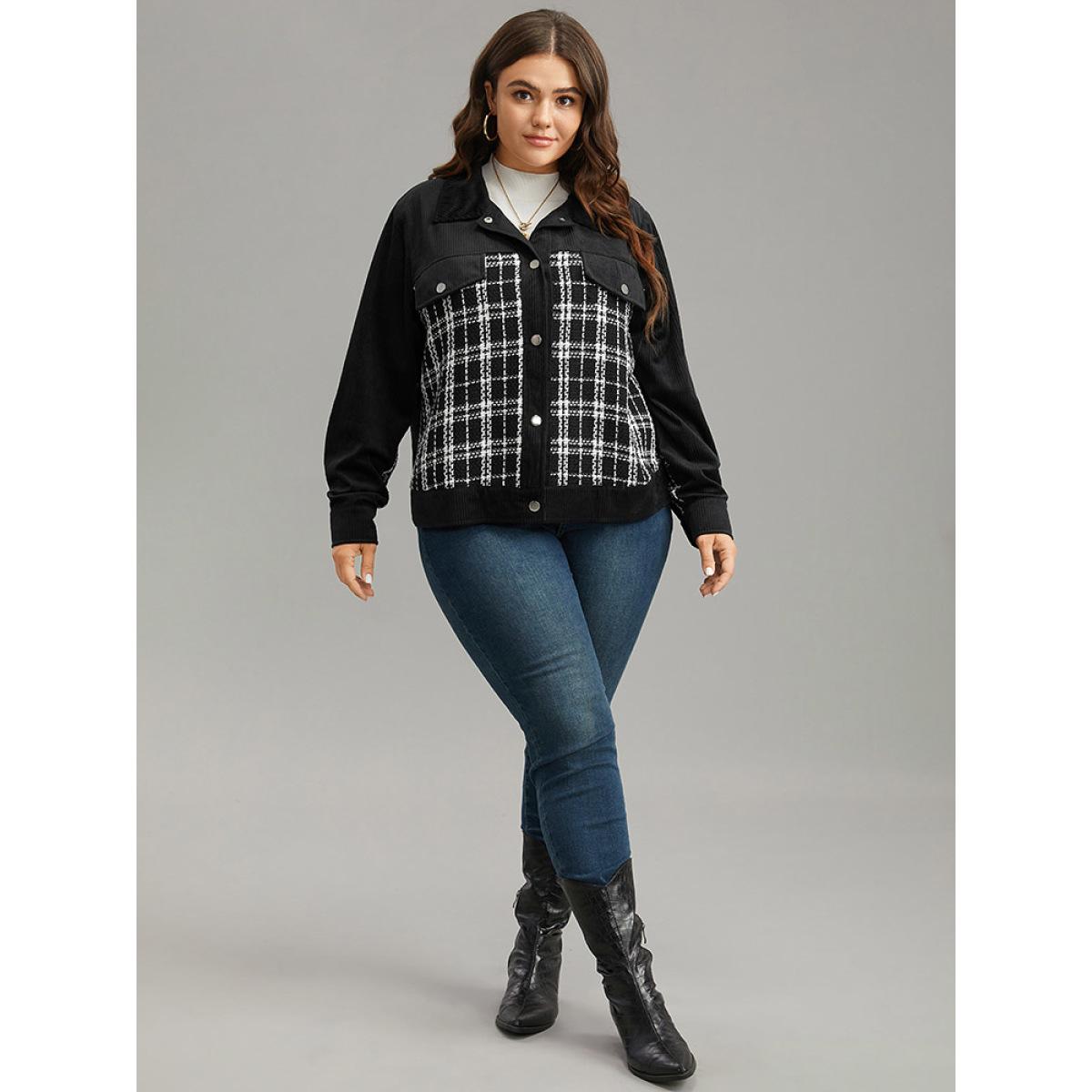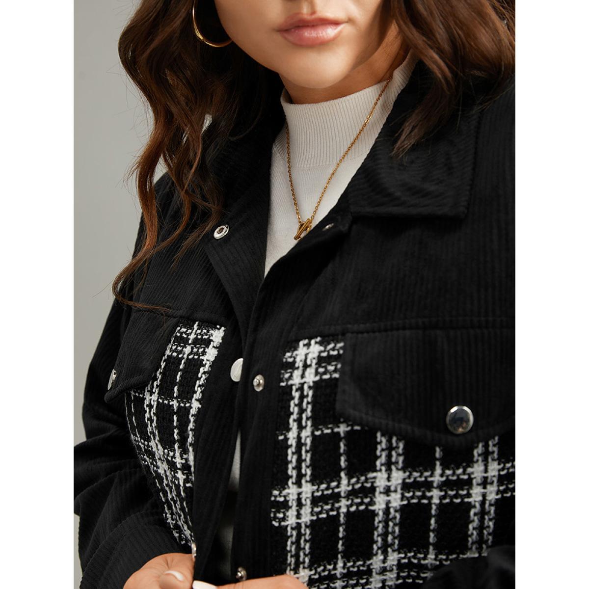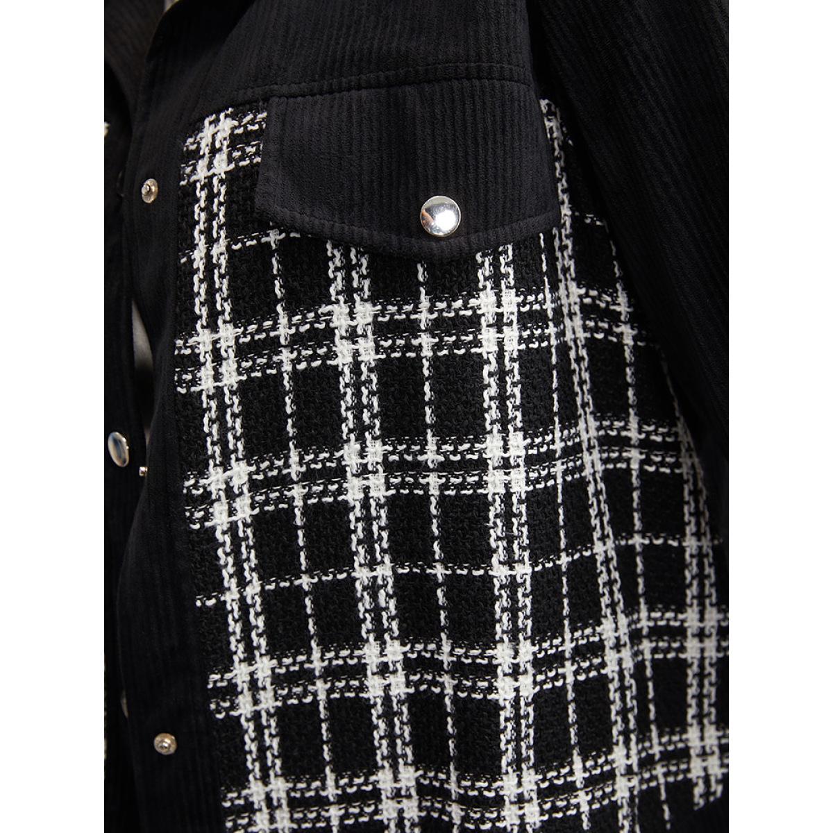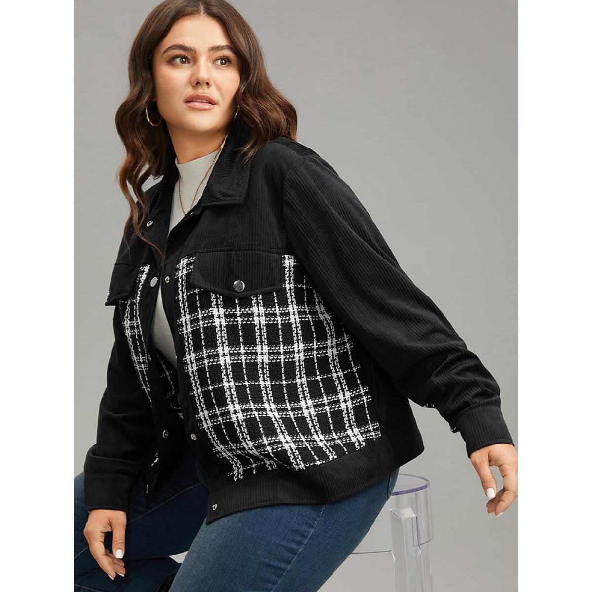 Plus Size Plaid Metal Detail Patchwork Shacket Women Black Elegant Texture Ladies Everyday Winter Coats BloomChic 10/M