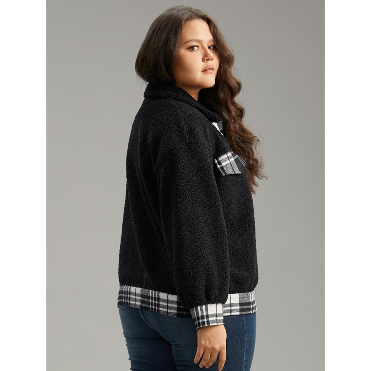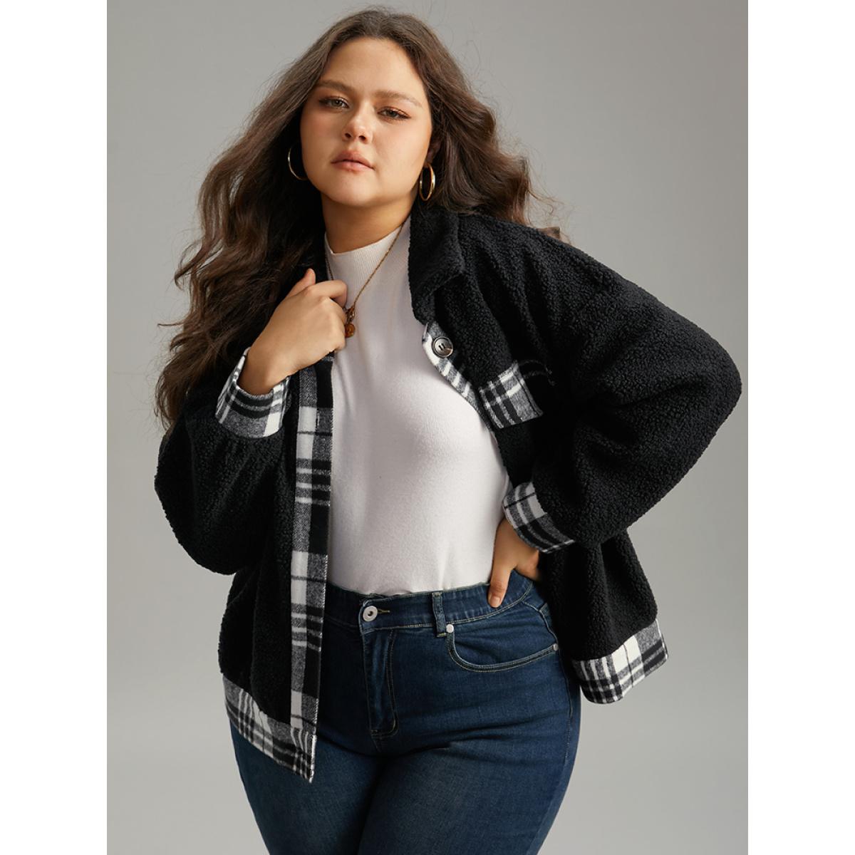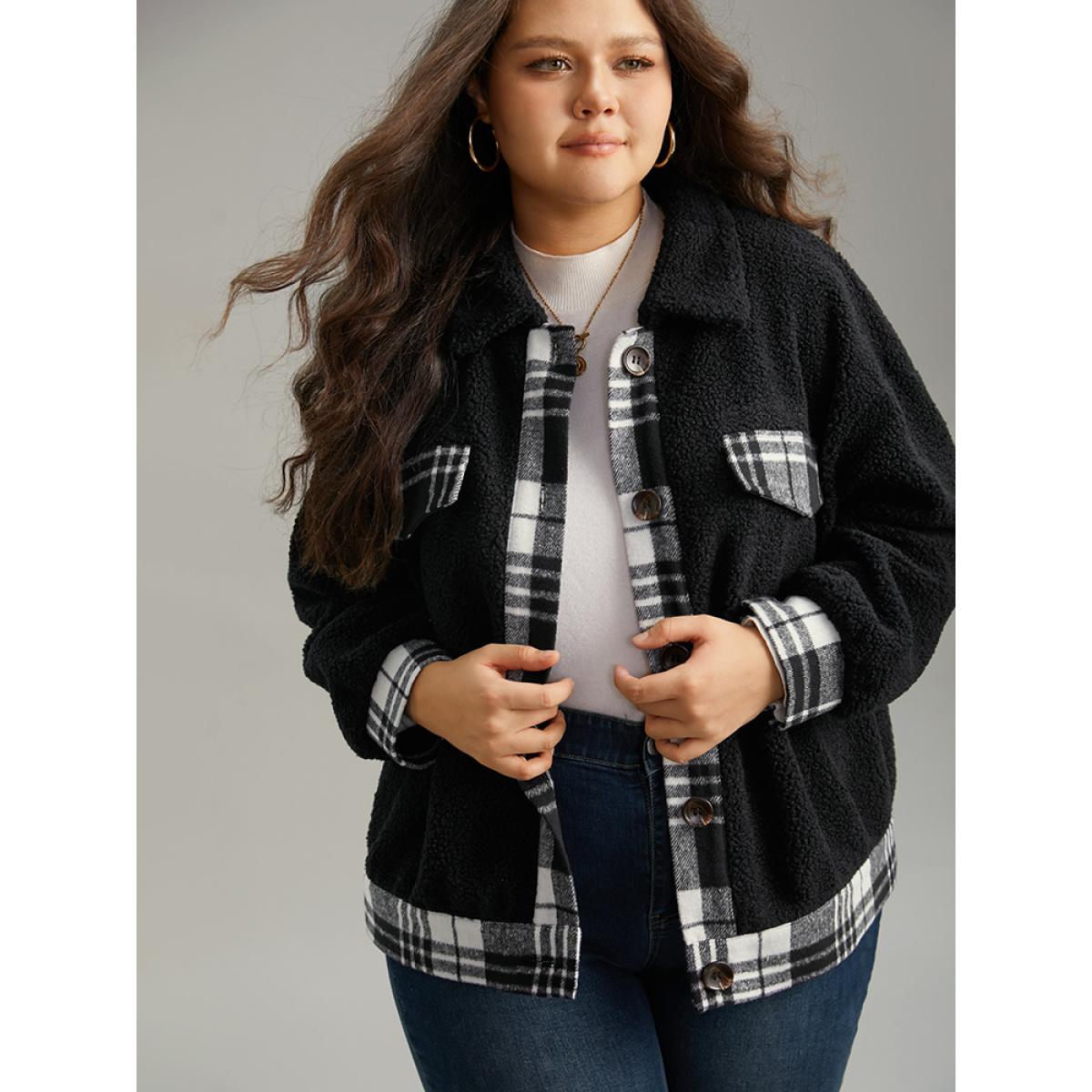 Plus Size Plaid Patchwork Button Up Teddy Shacket Women Black Contrast Dailywear Jackets BloomChic 14-16/1X