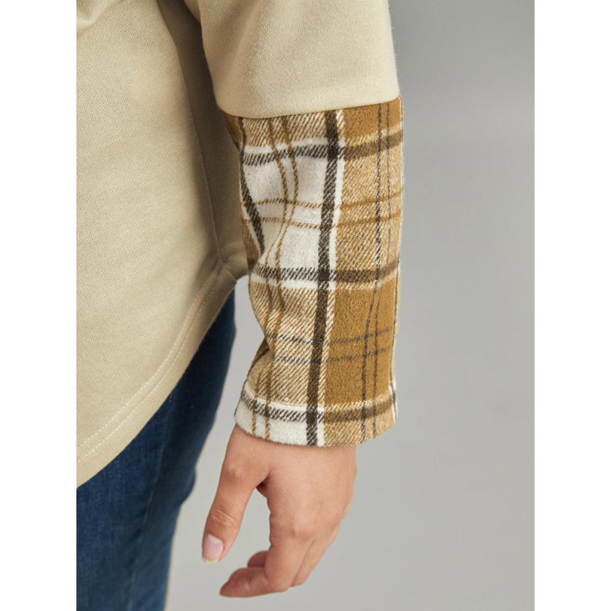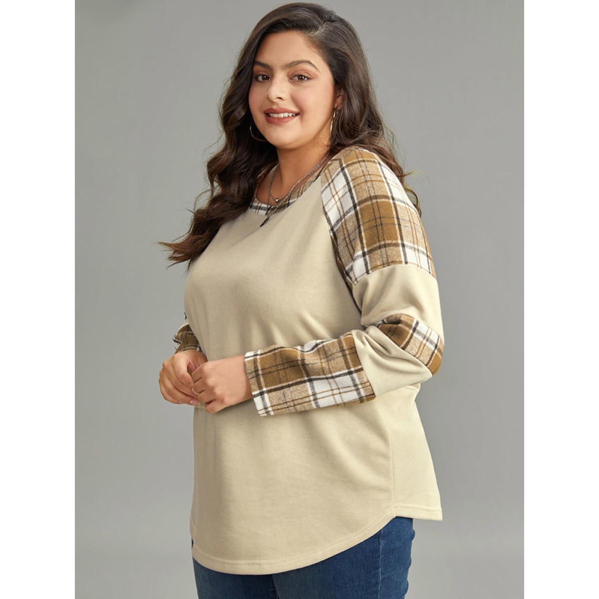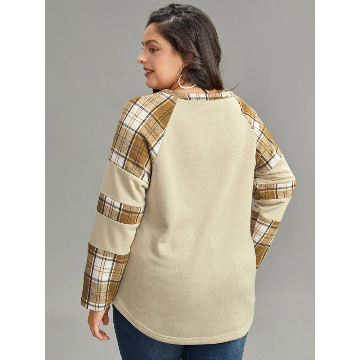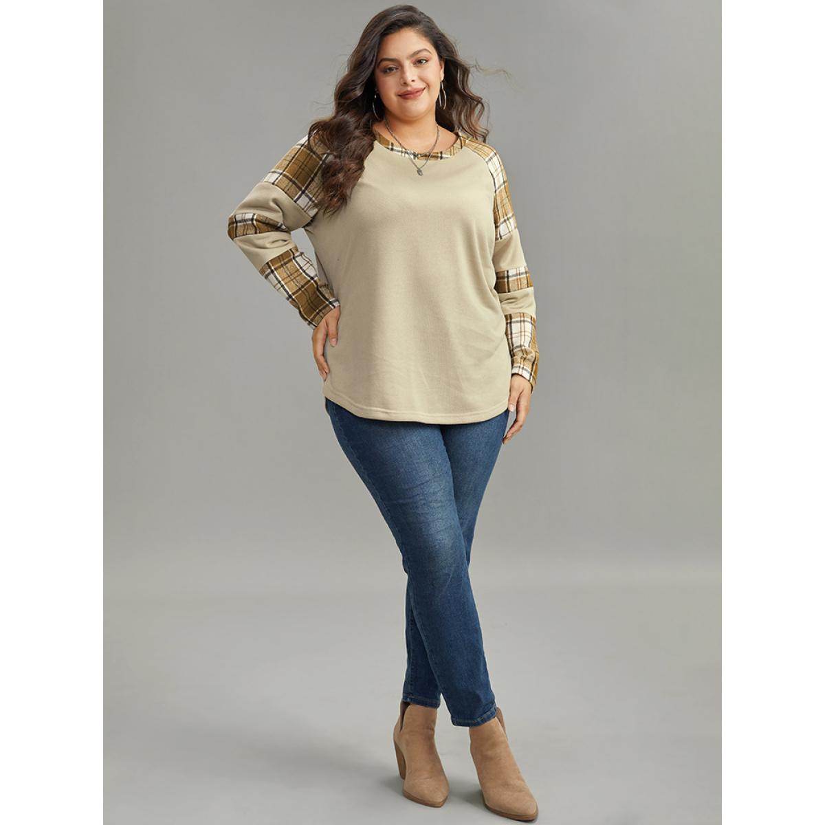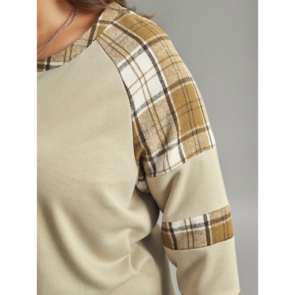 Plus Size Plaid Patchwork Raglan Sleeve Sweatshirt Women Champagne Casual Thick Round Neck Dailywear Sweatshirts BloomChic 10/M