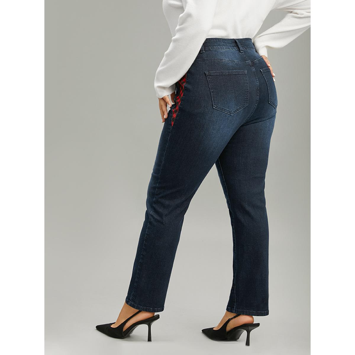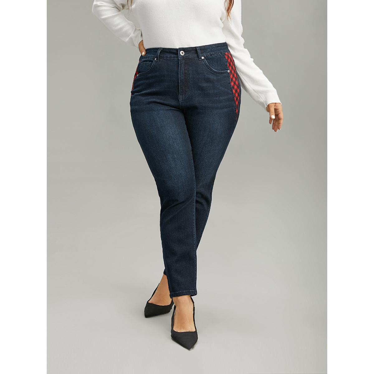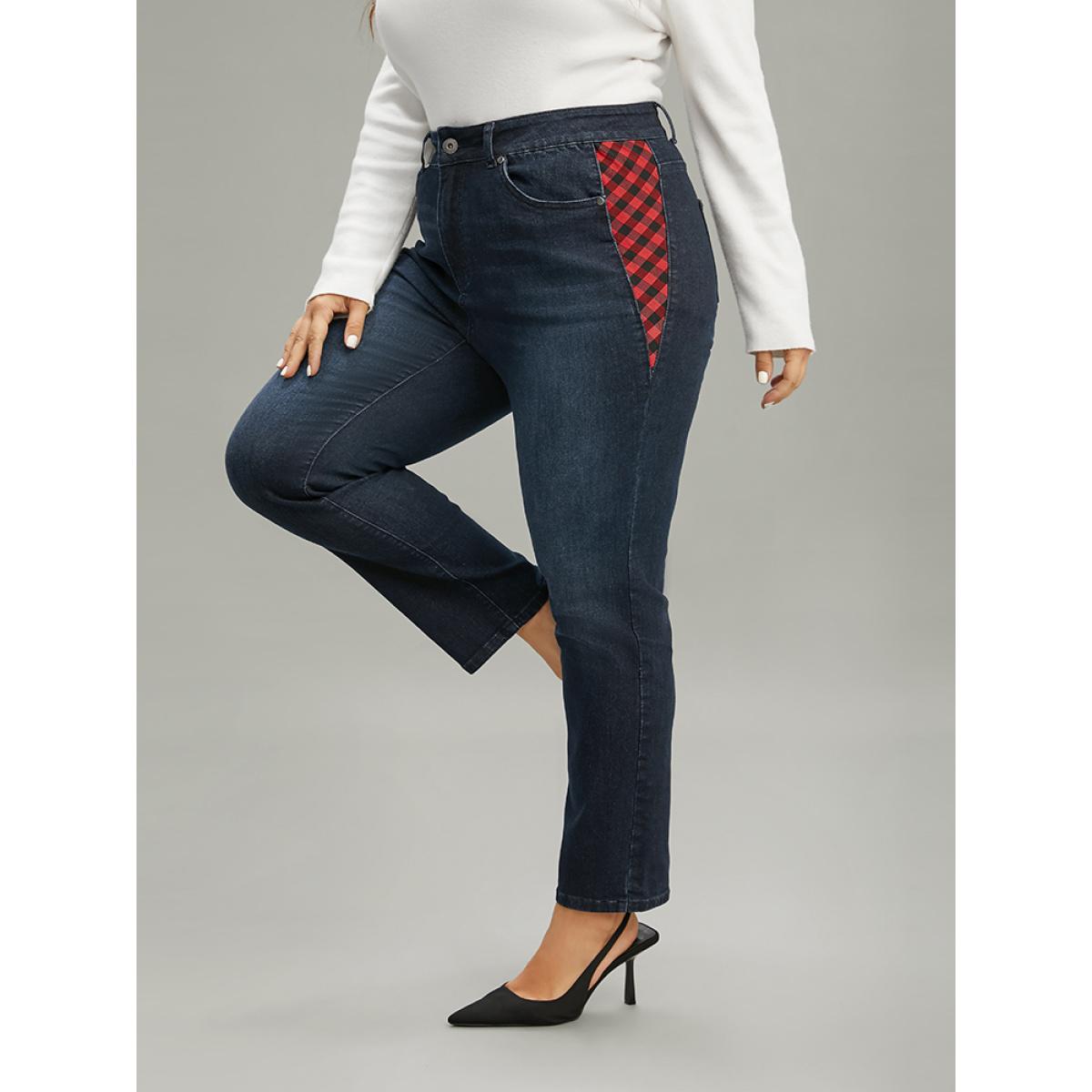 Plus Size Plaid Patchwork Straight Leg Dark Wash Jeans Women Midnight Casual Gingham Contrast High stretch Pocket Jeans BloomChic 26/4X