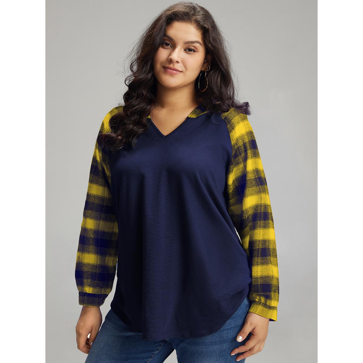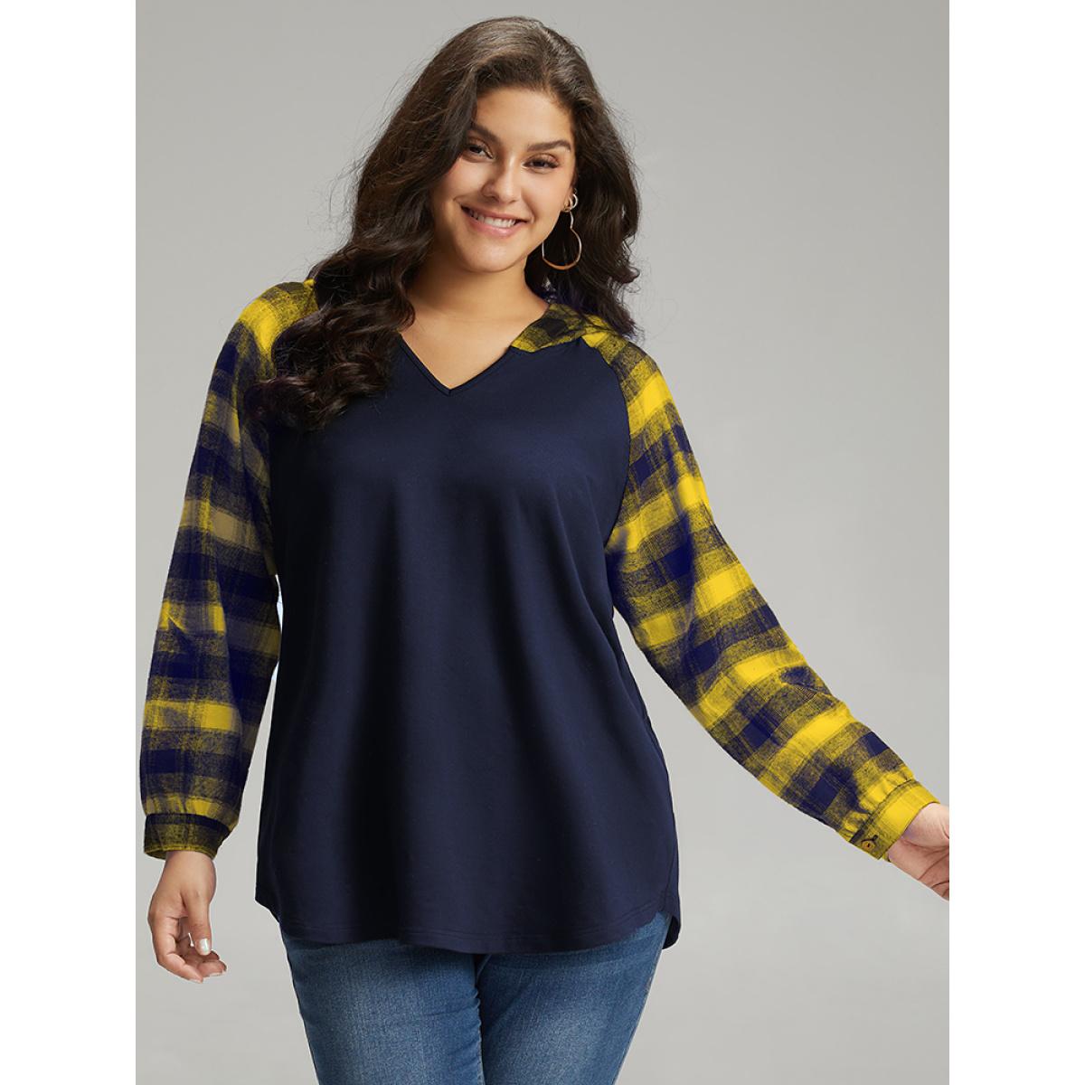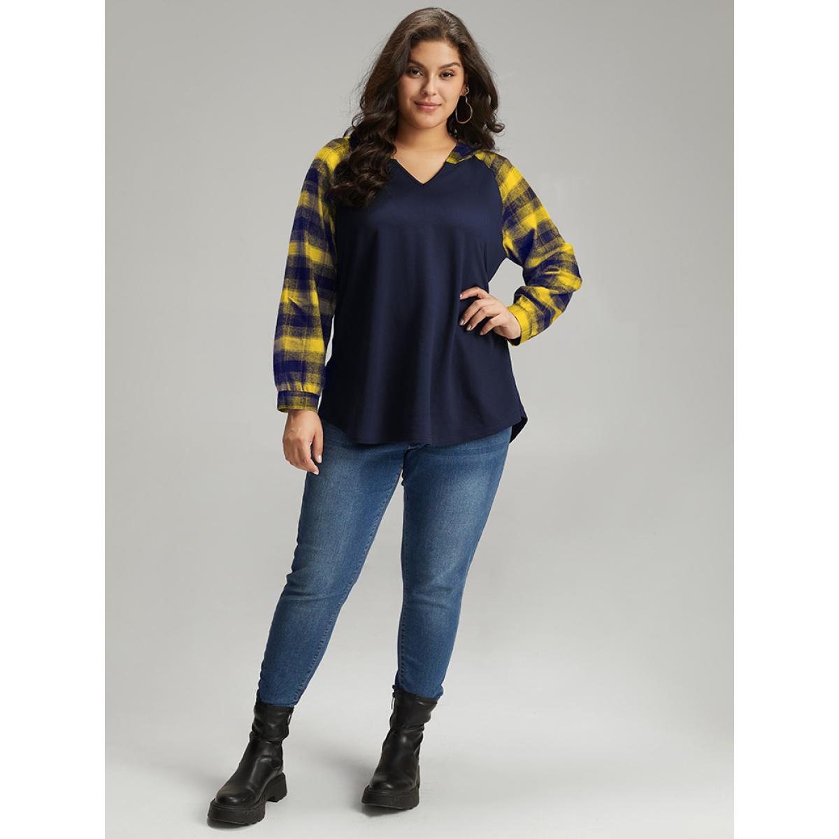 Plus Size Plaid Print Hooded Patchwork Sweatshirt Women Yellow Leisure Patchwork Hooded Casual Sweatshirts BloomChic 28/5X
