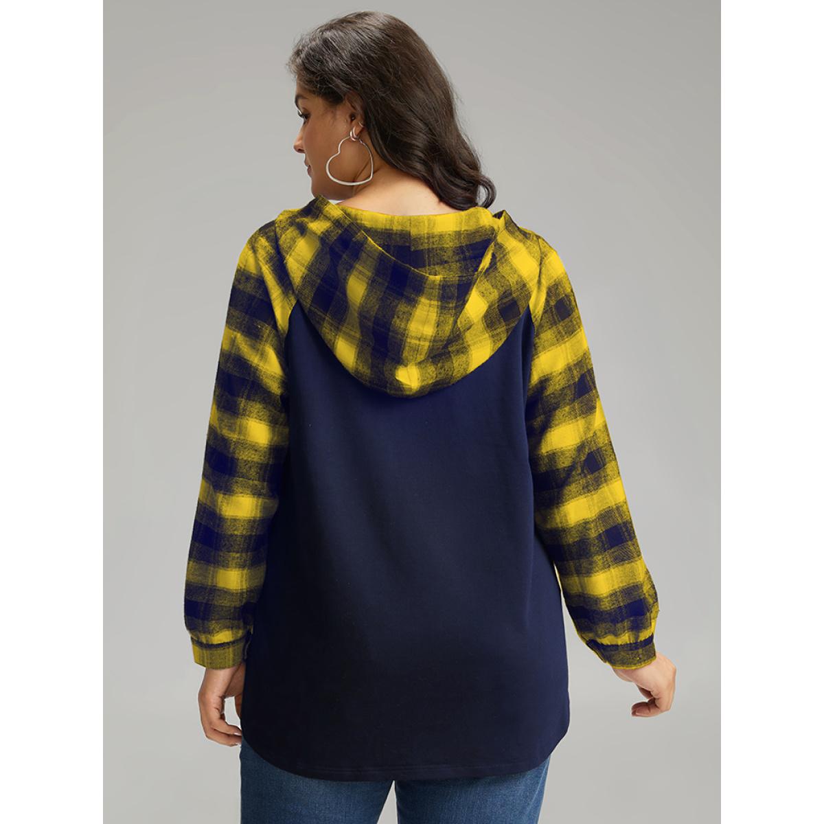 Plus Size Plaid Print Hooded Patchwork Sweatshirt Women Yellow Leisure Patchwork Hooded Casual Sweatshirts BloomChic 28/5X Product Image
