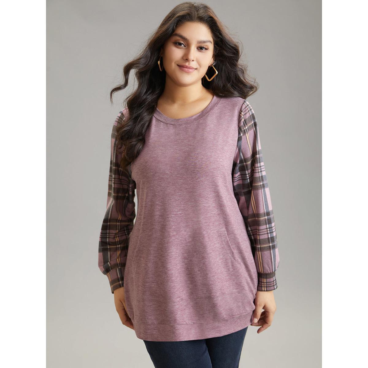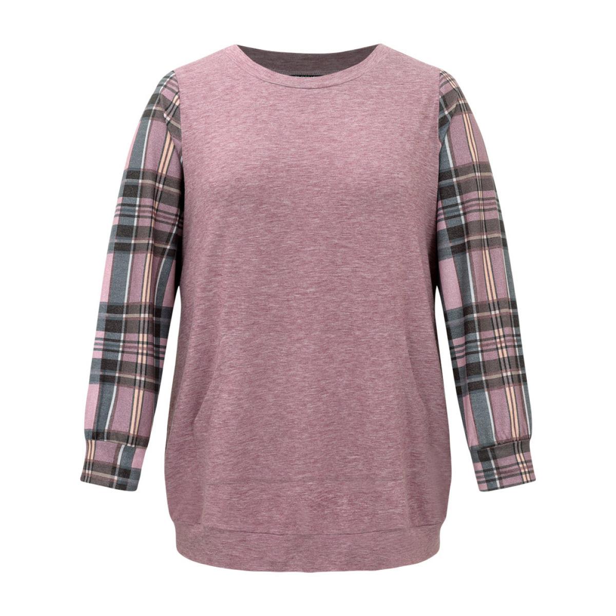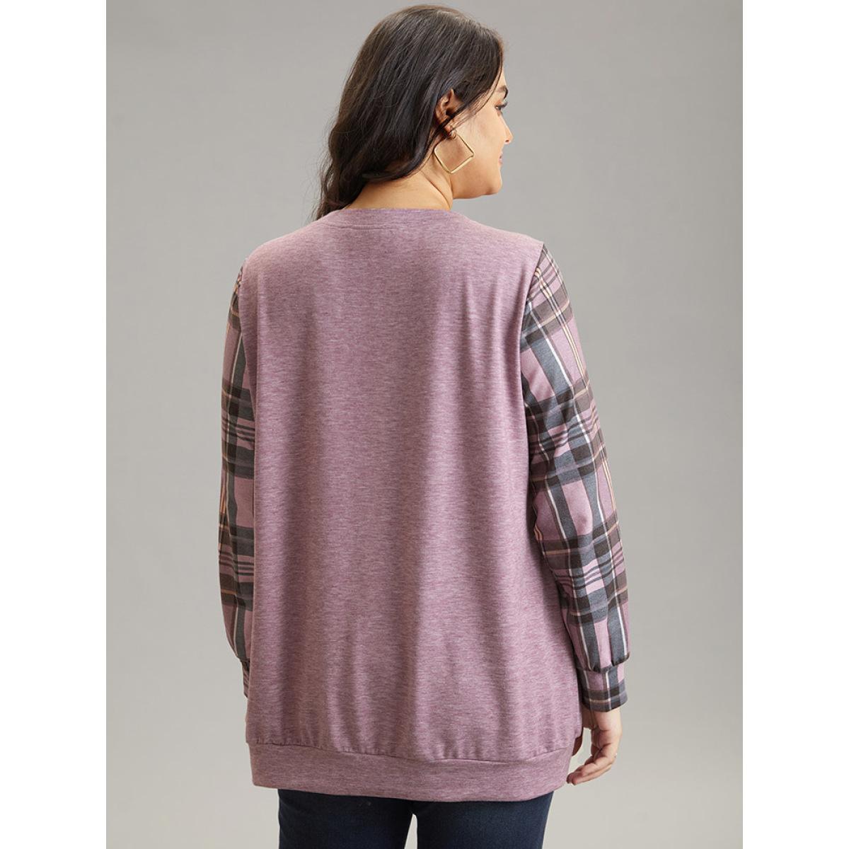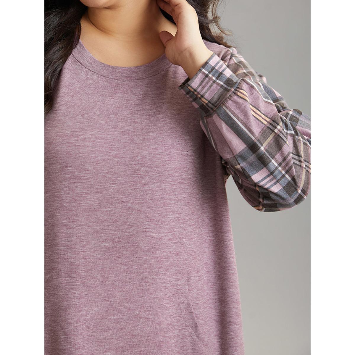 Plus Size Plaid Print Patchwork Kangaroo Pocket Sweatshirt Women Purple Casual Patchwork Round Neck Dailywear Sweatshirts BloomChic 14-16/1X