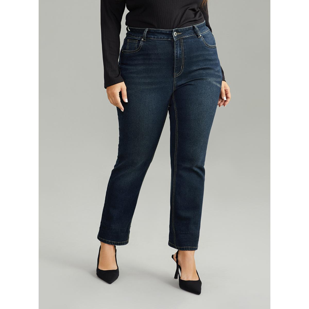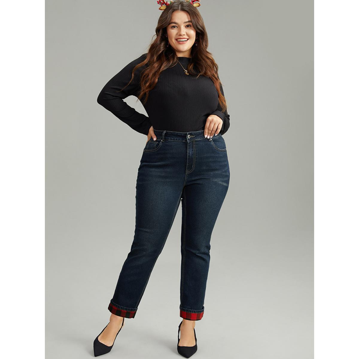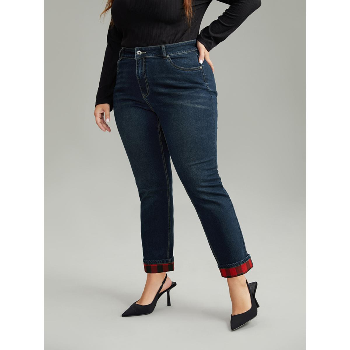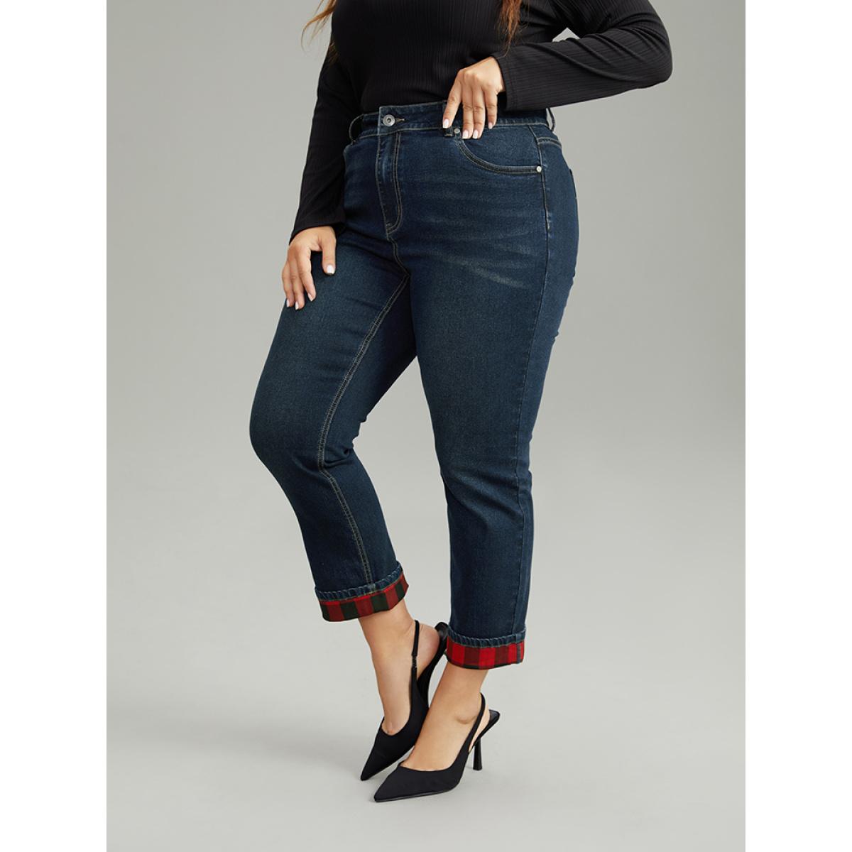 Plus Size Plaid Roll Hem Straight Leg Jeans Women Midnight Casual Plaid Roll Hem High stretch Pocket Jeans BloomChic 24/3X