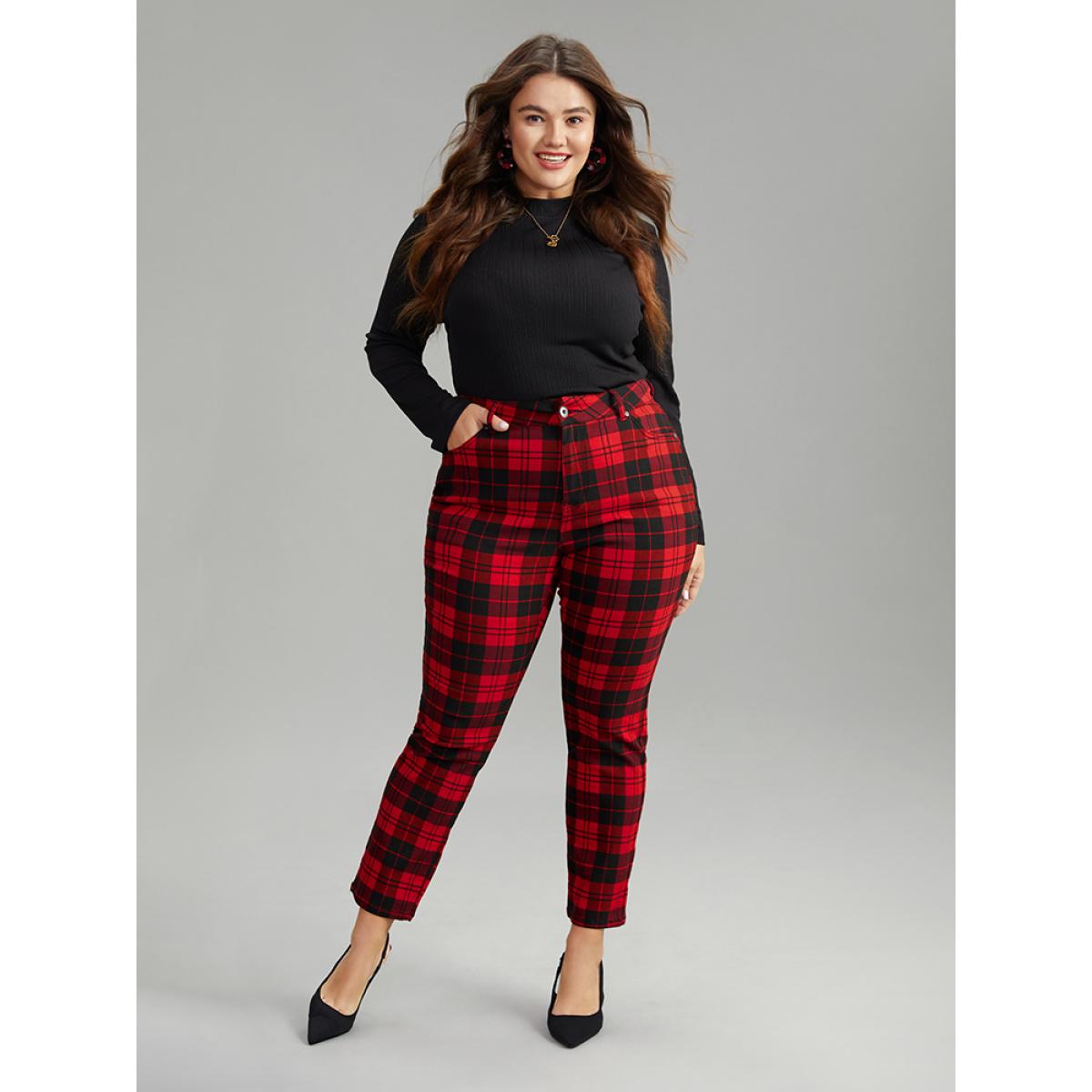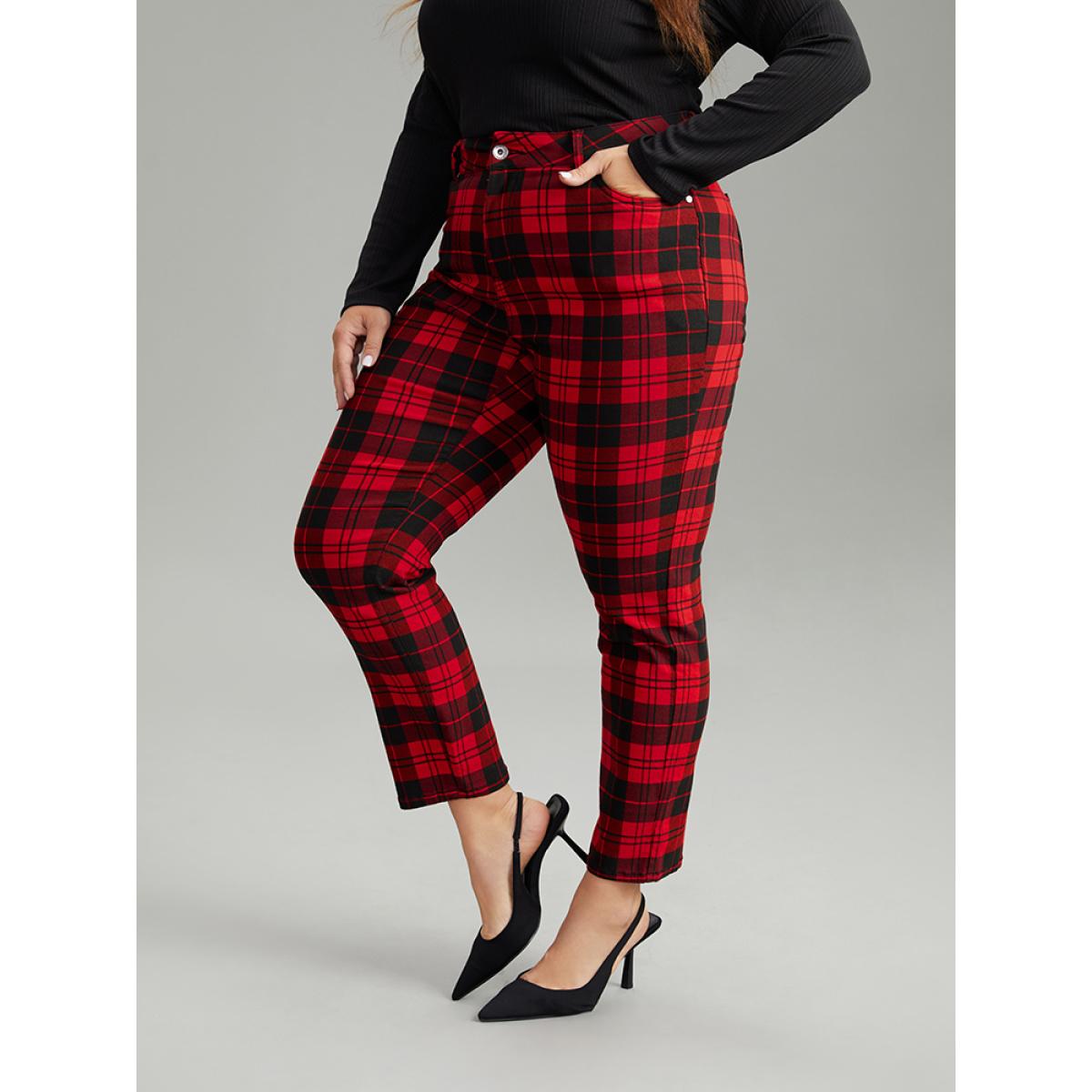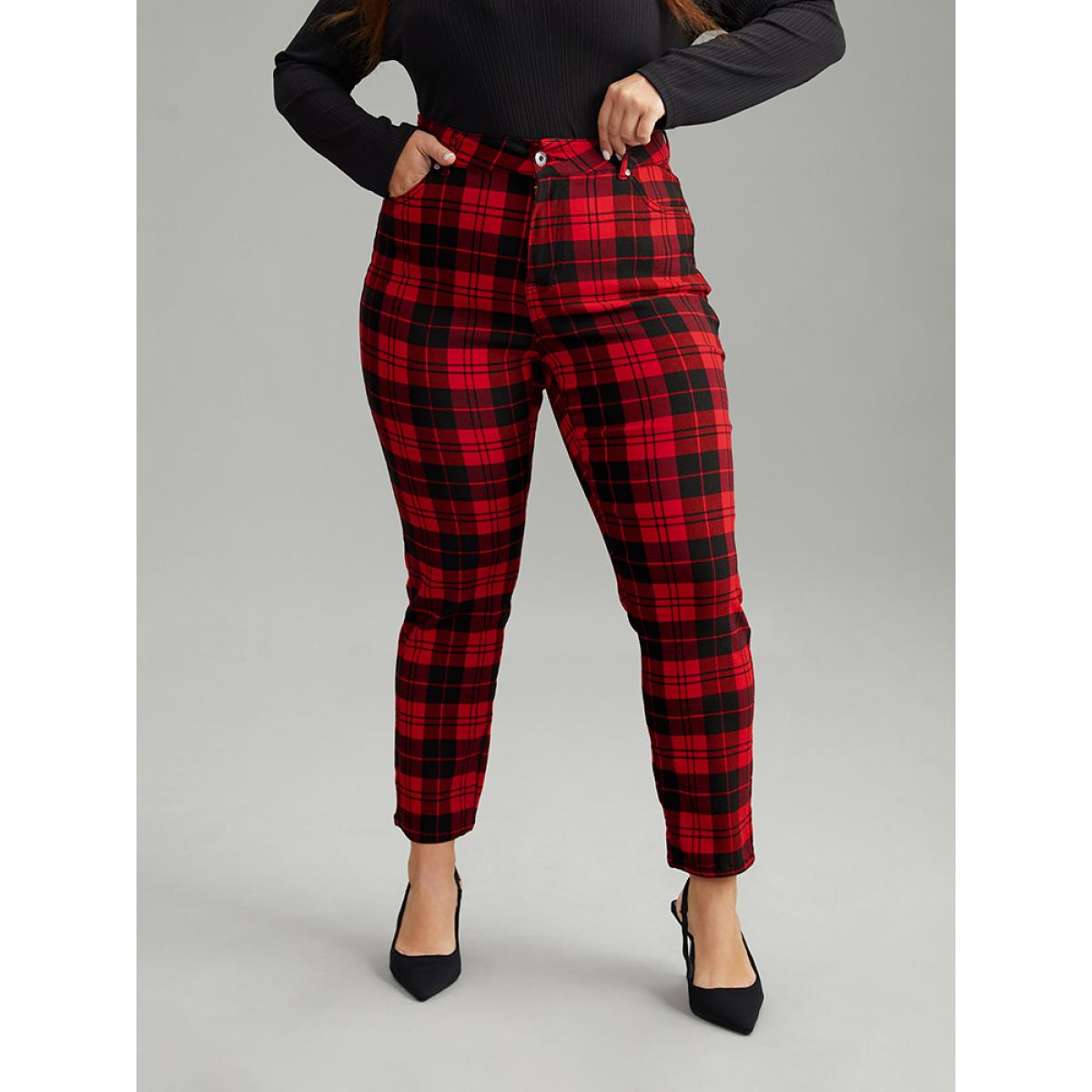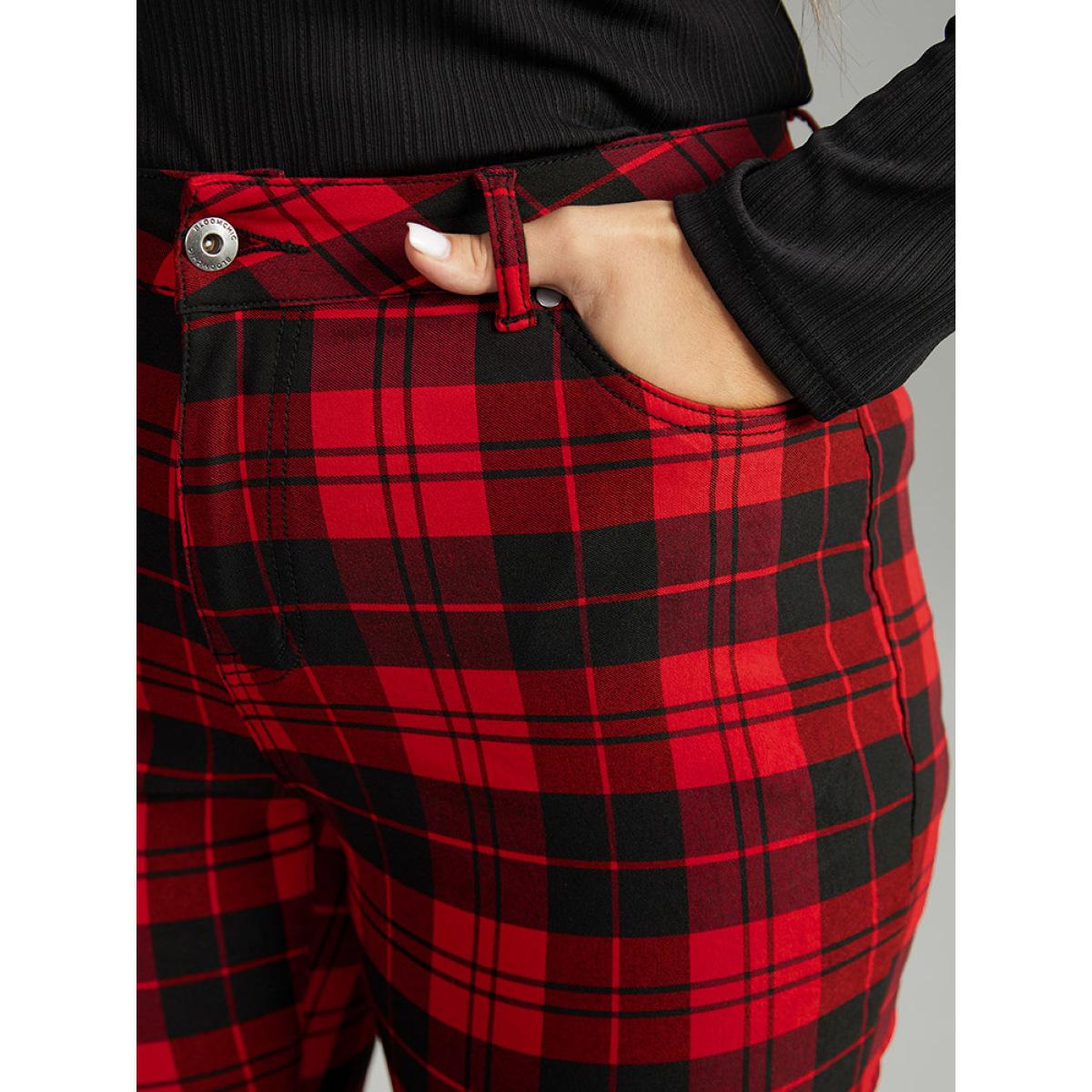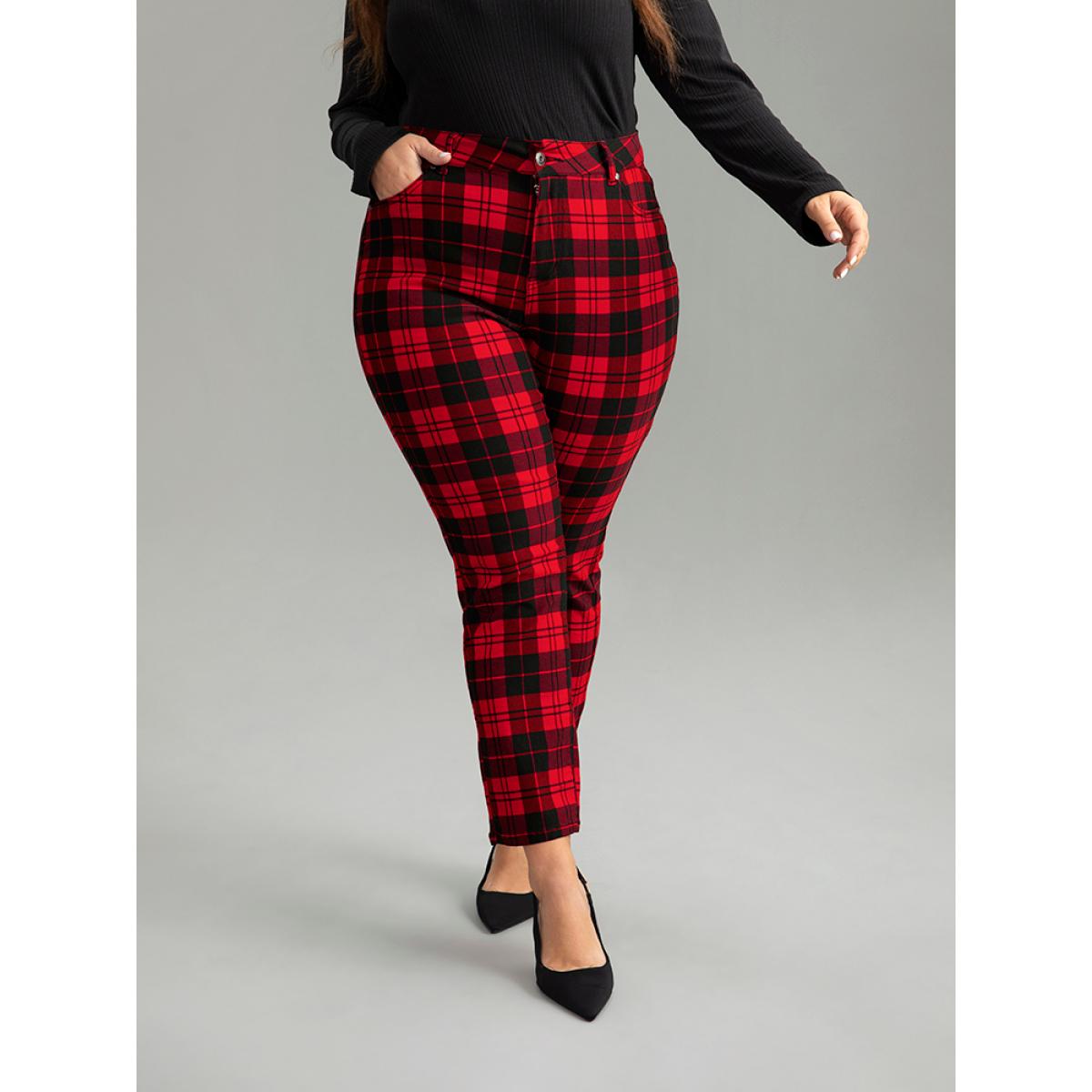 Plus Size Plaid Very Stretchy Full Length Jeans Women Red Casual Plaid Contrast High stretch Pocket Jeans BloomChic 22/3X