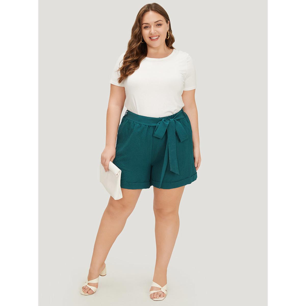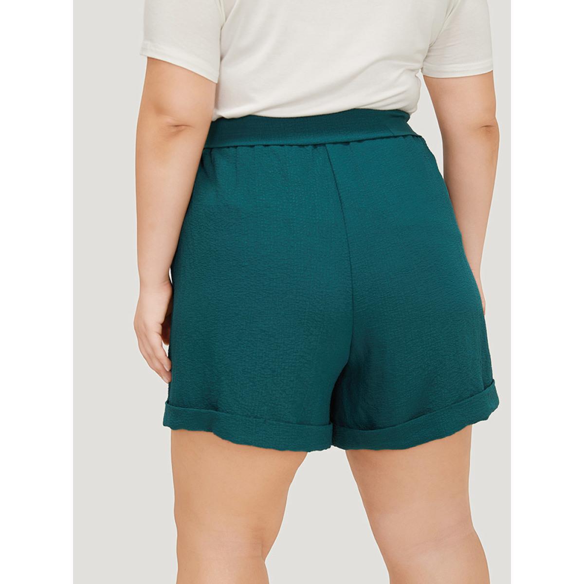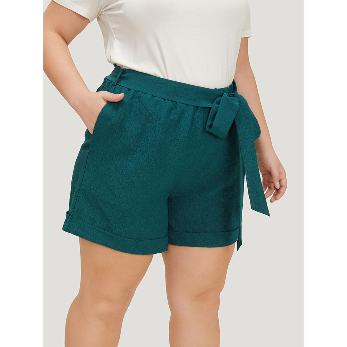 Plus Size Plain Belted Pocket Roll Hem Shorts Women DarkGreen Office Plain Office Shorts BloomChic 28/5X