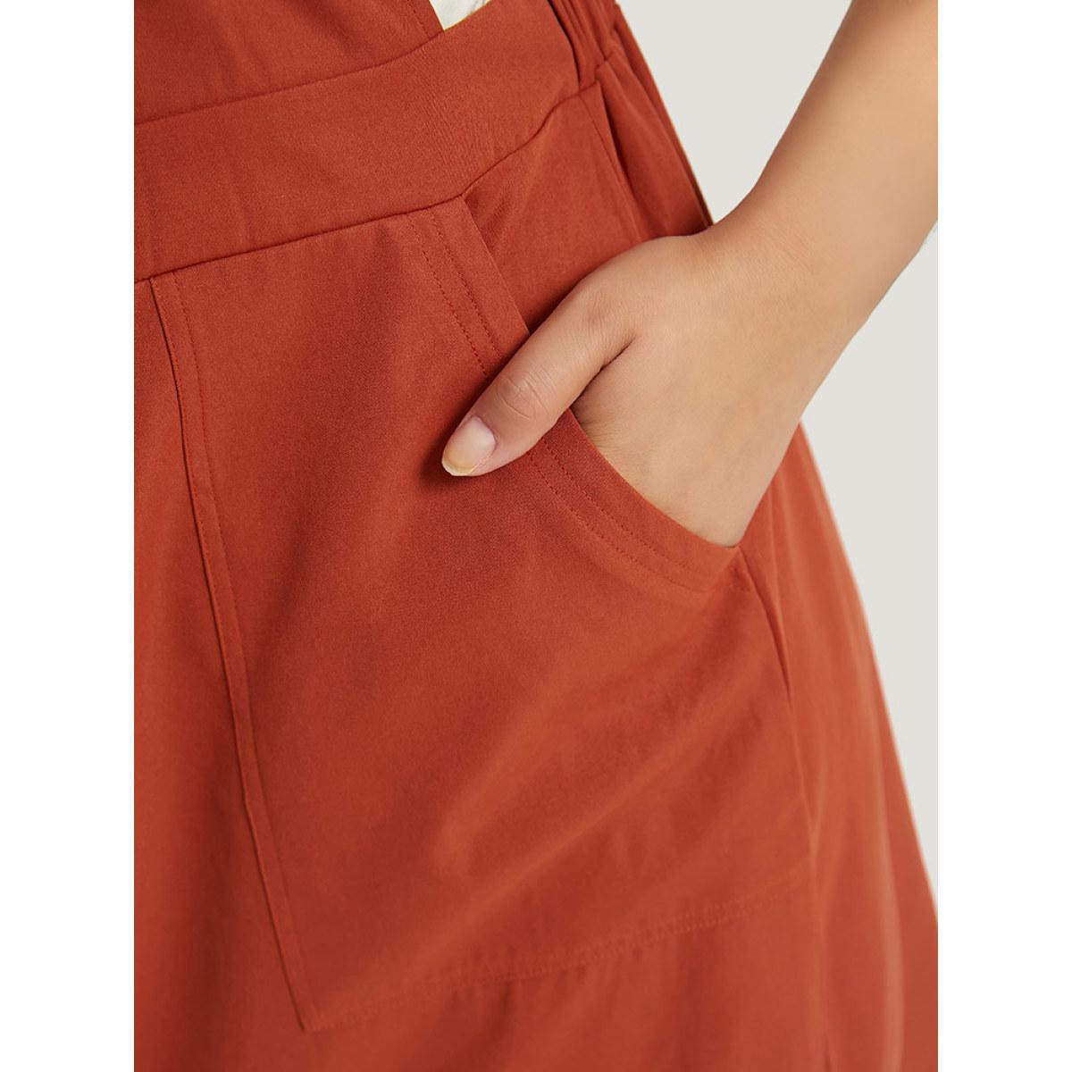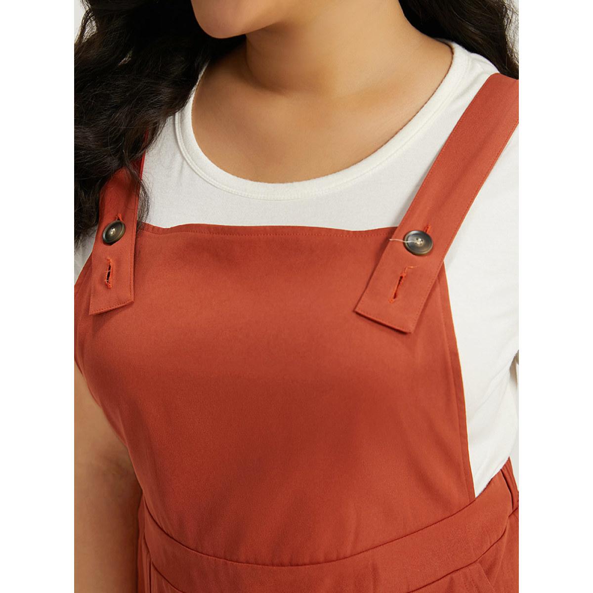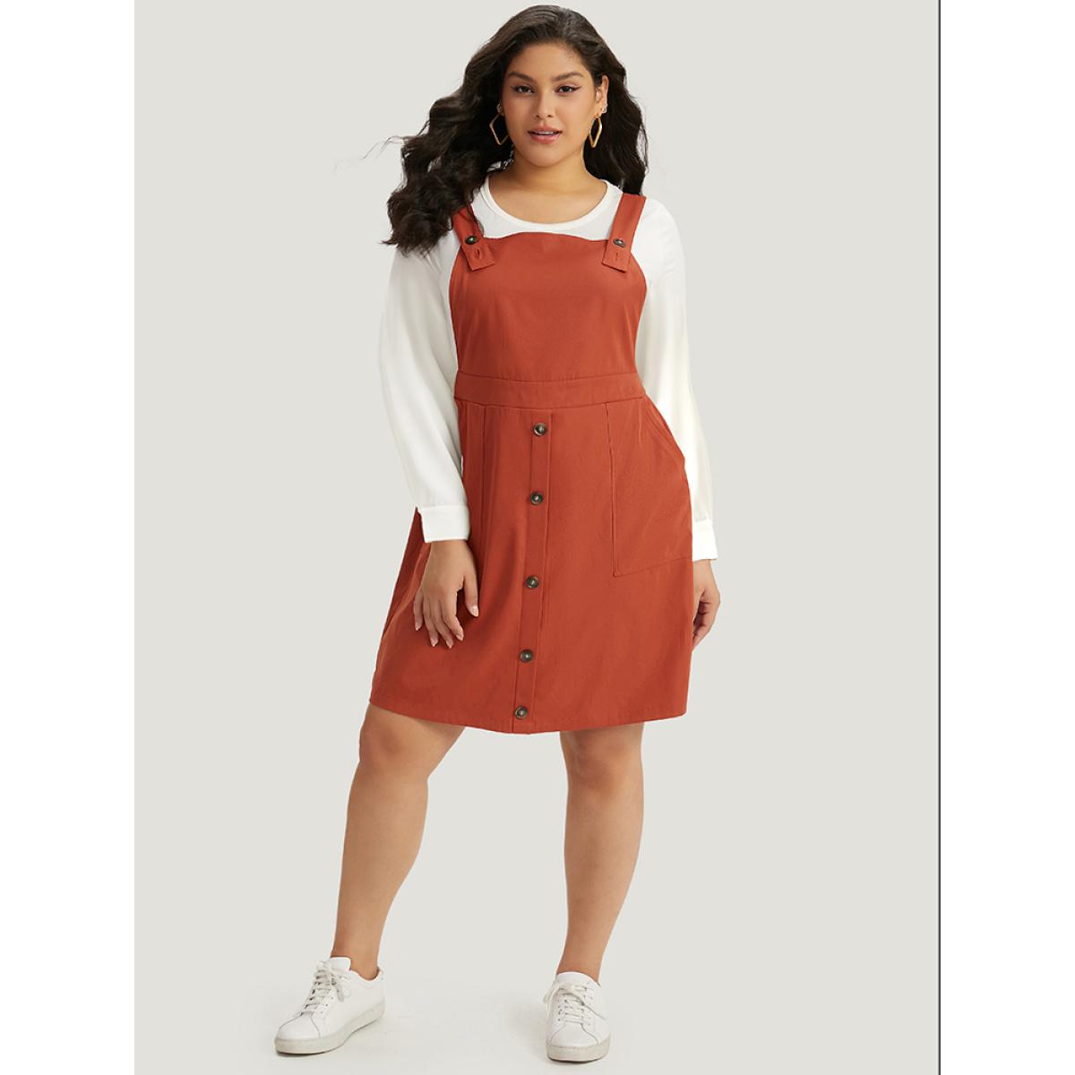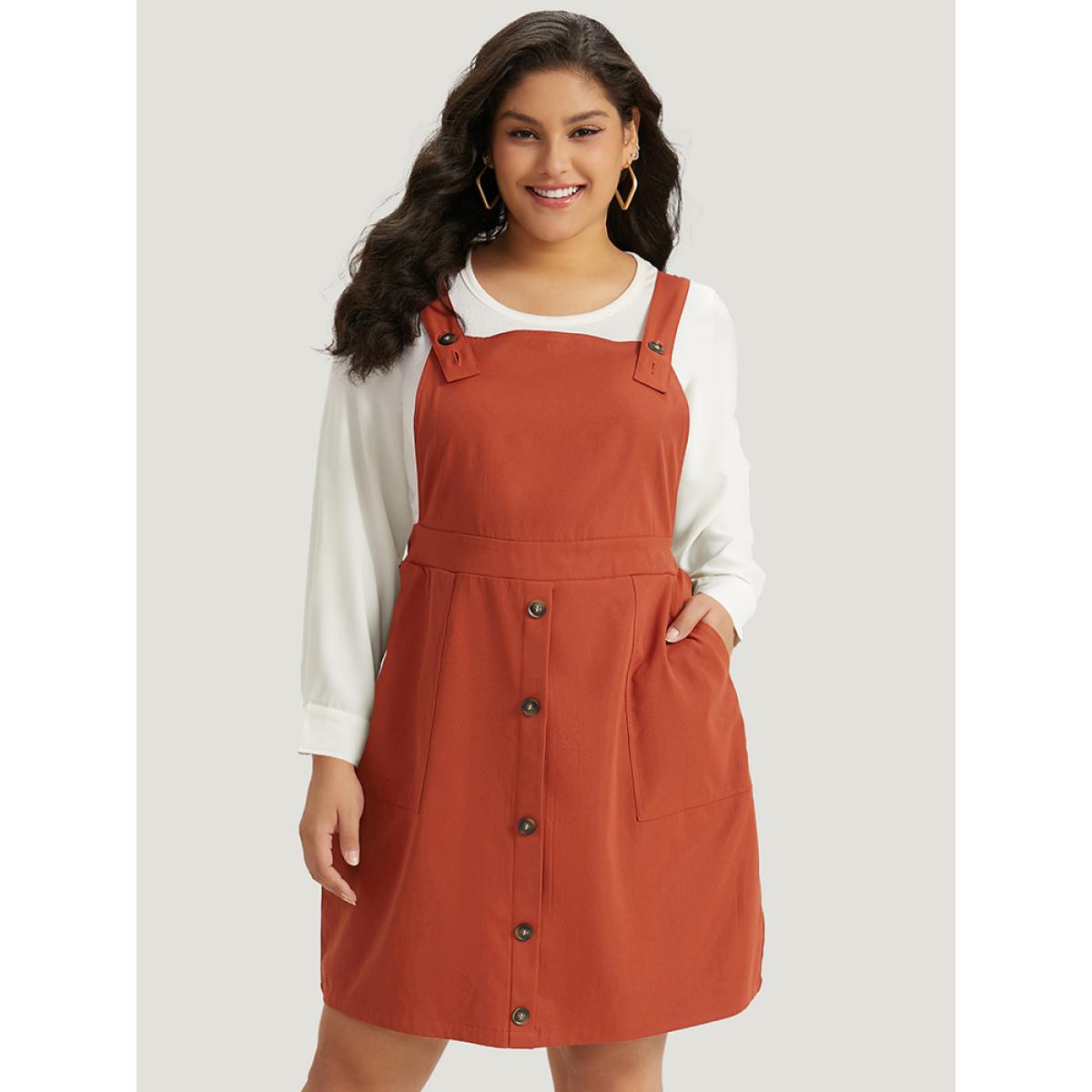 Plus Size Plain Button Up Pocket Suspender Skirt Brown Women Casual Adjustable Straps Spaghetti Strap Sleeveless Curvy Knee Dress BloomChic 10/M