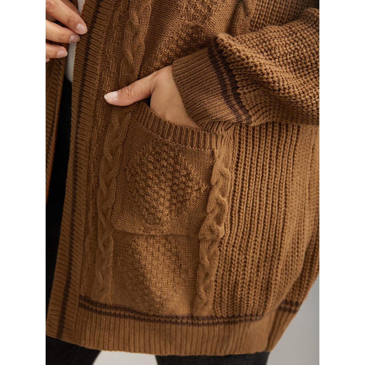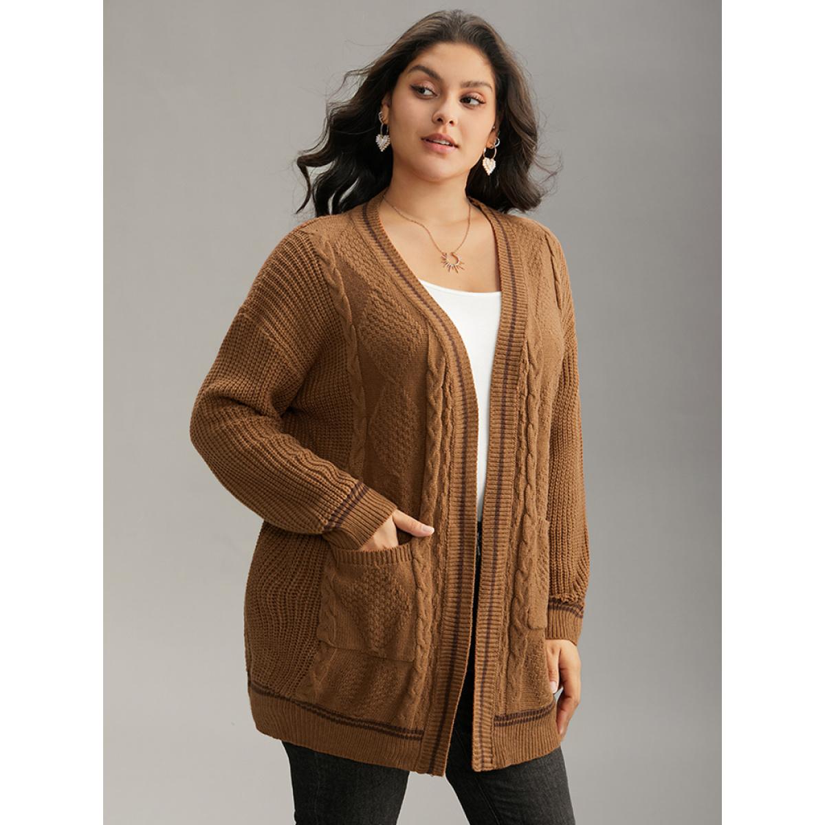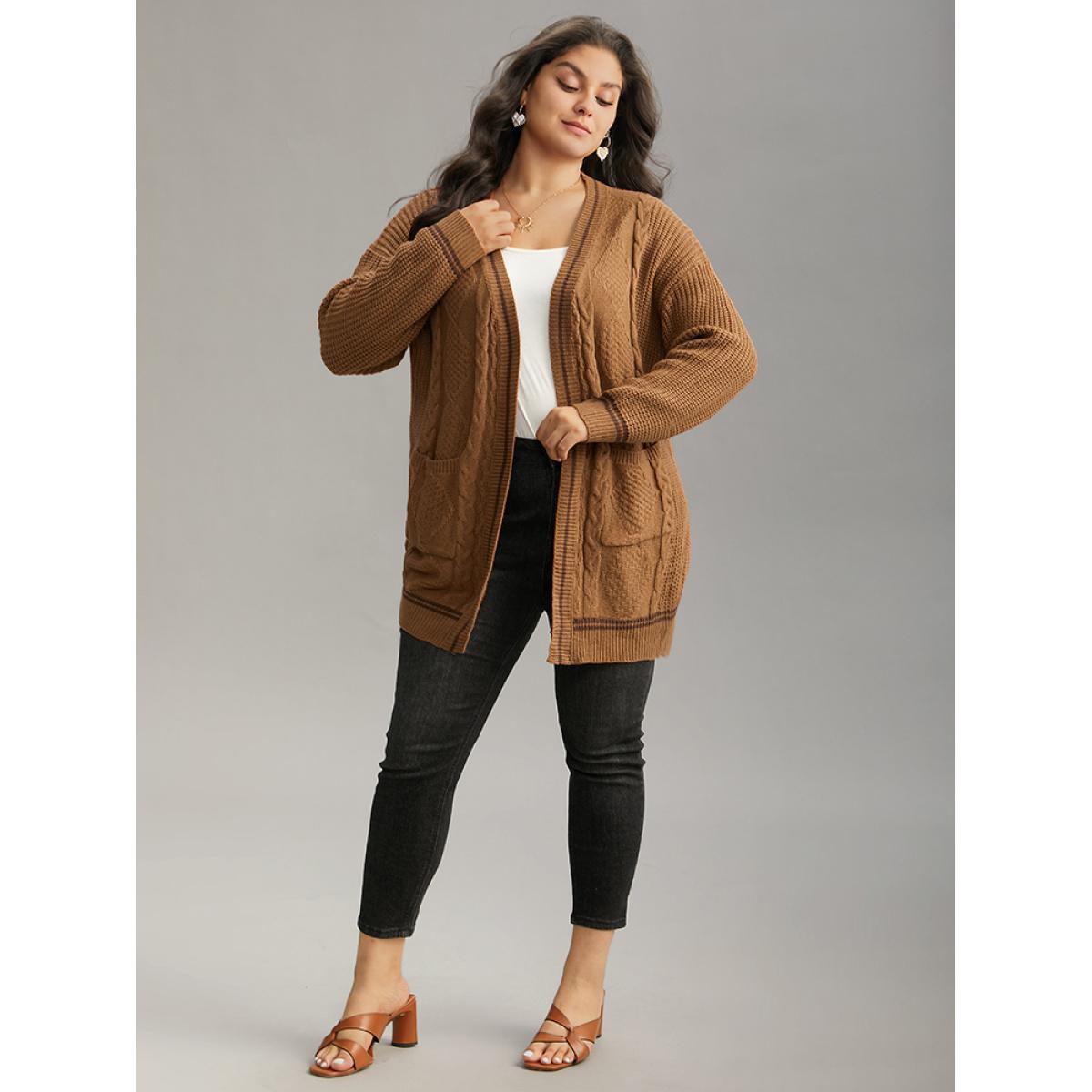 Plus Size Plain Cable Knit Pocket Open Front Cardigan Bronze Women Casual Loose Long Sleeve Dailywear Cardigans BloomChic 22-24/3X