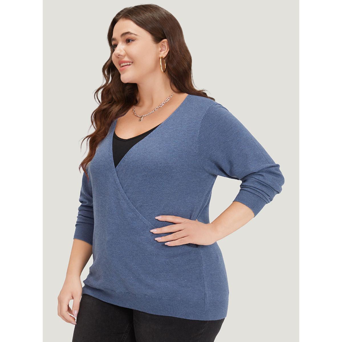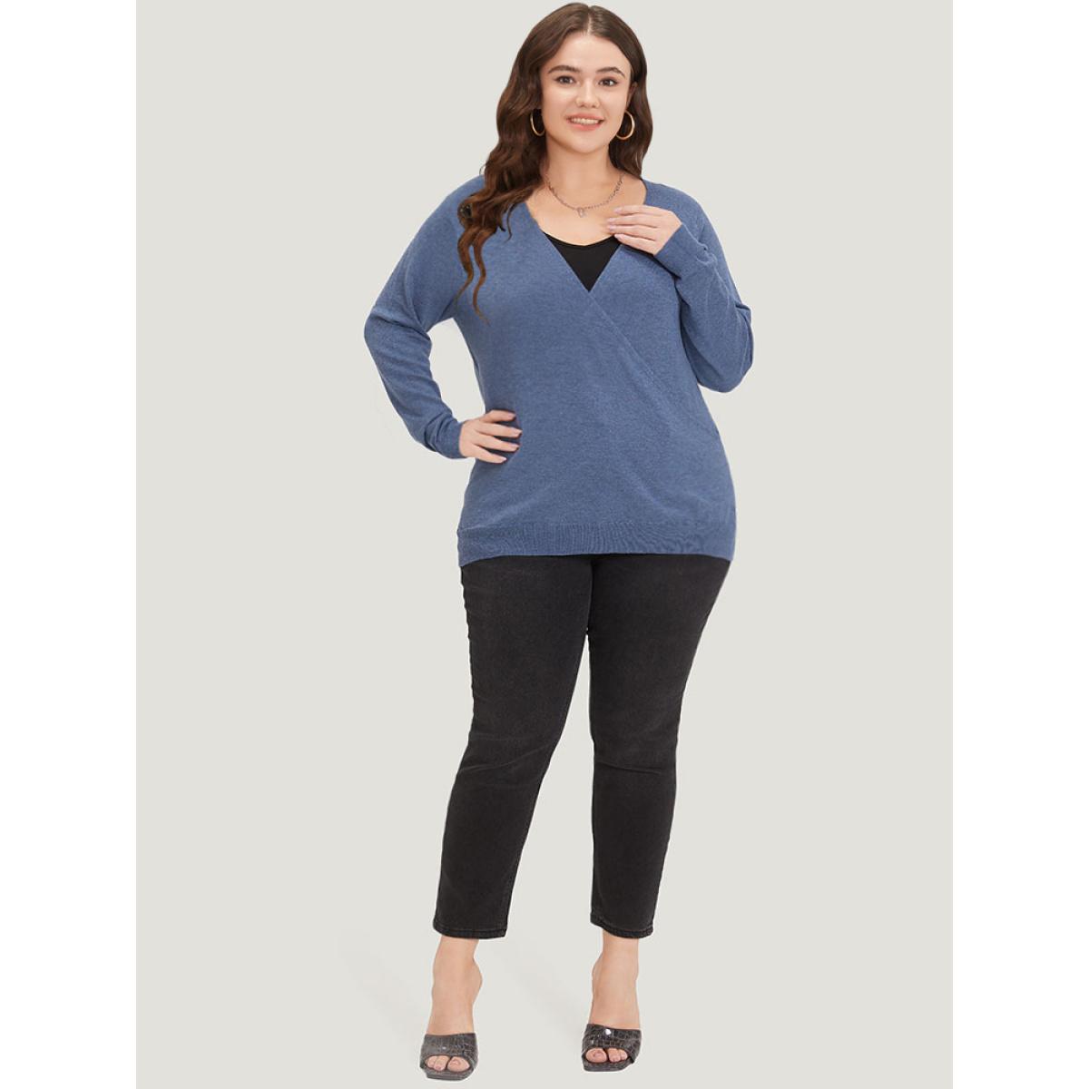 Plus Size Supersoft Essentials Plain Crossover Ties Elastic Cuffs Pullover Mint Women Casual Loose Long Sleeve V-neck Dailywear Pullovers BloomChic 28/5X