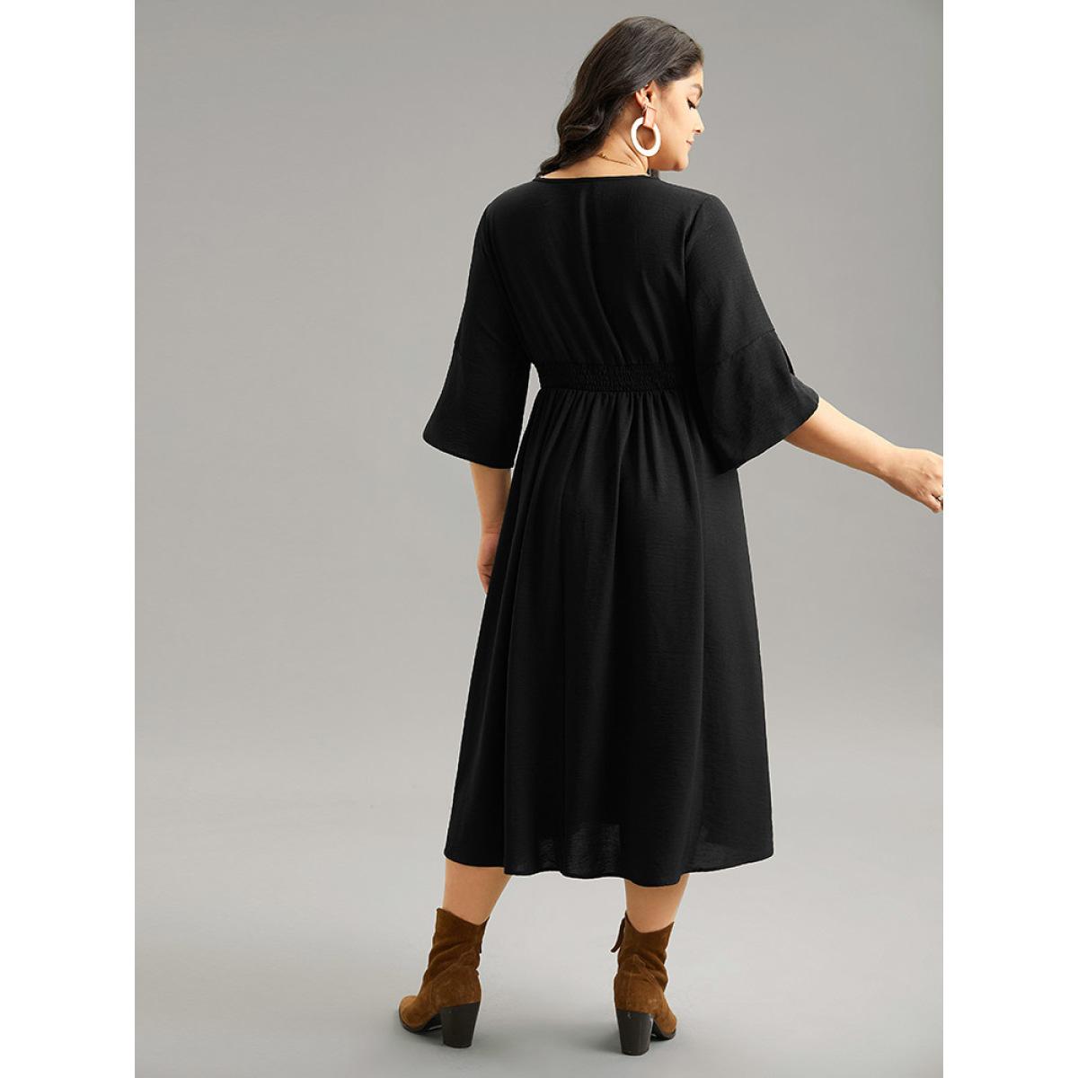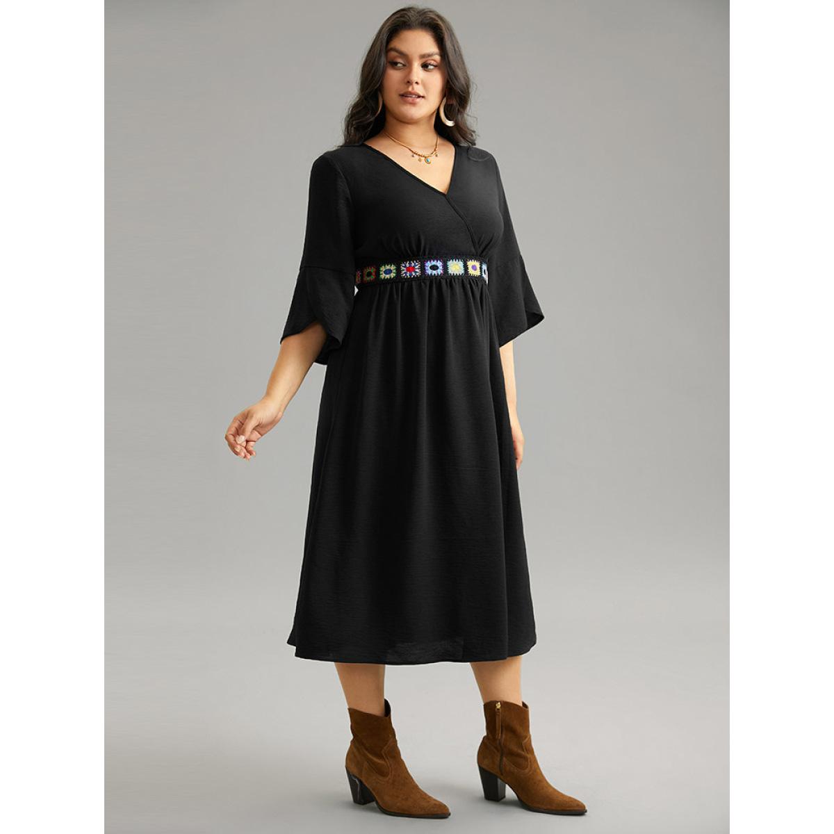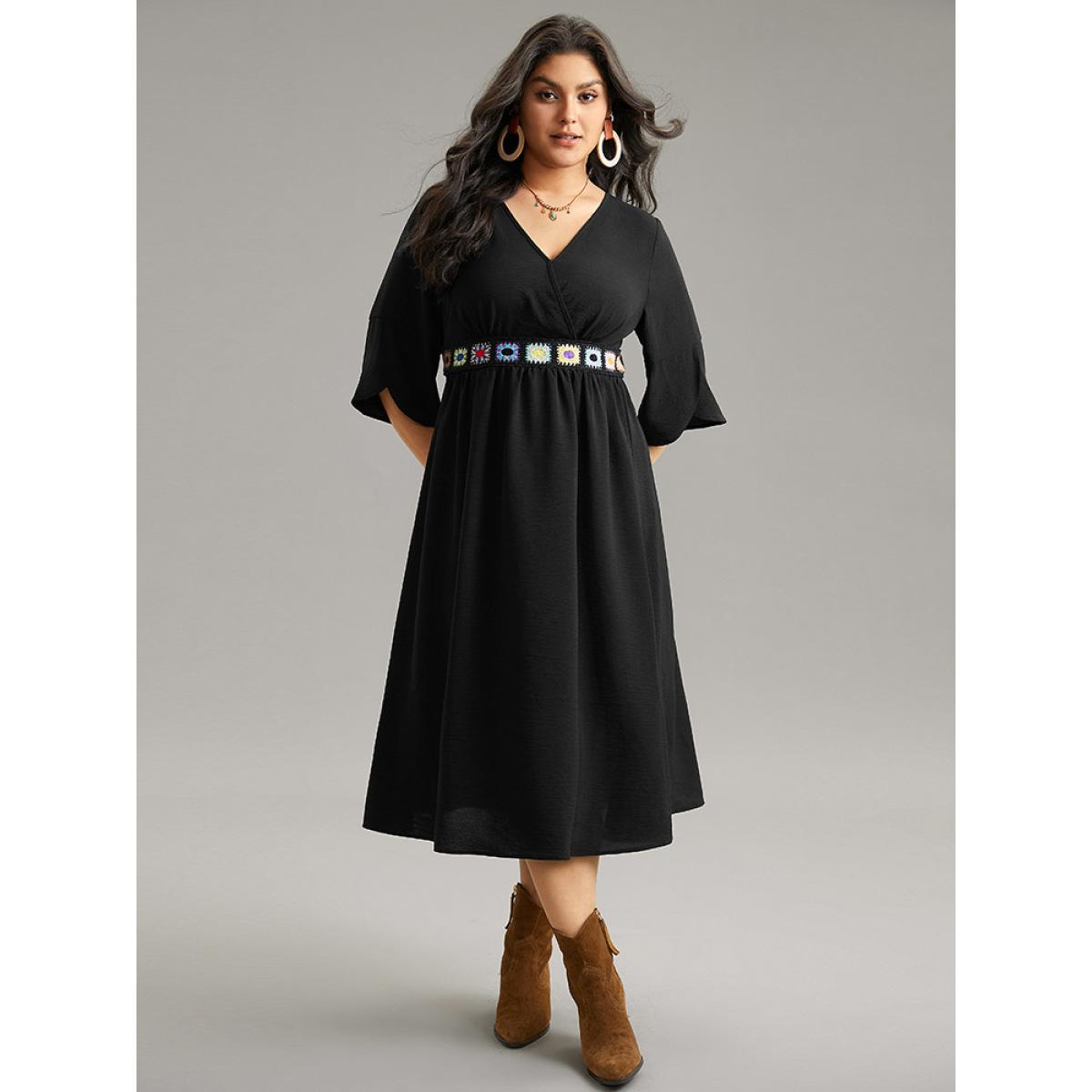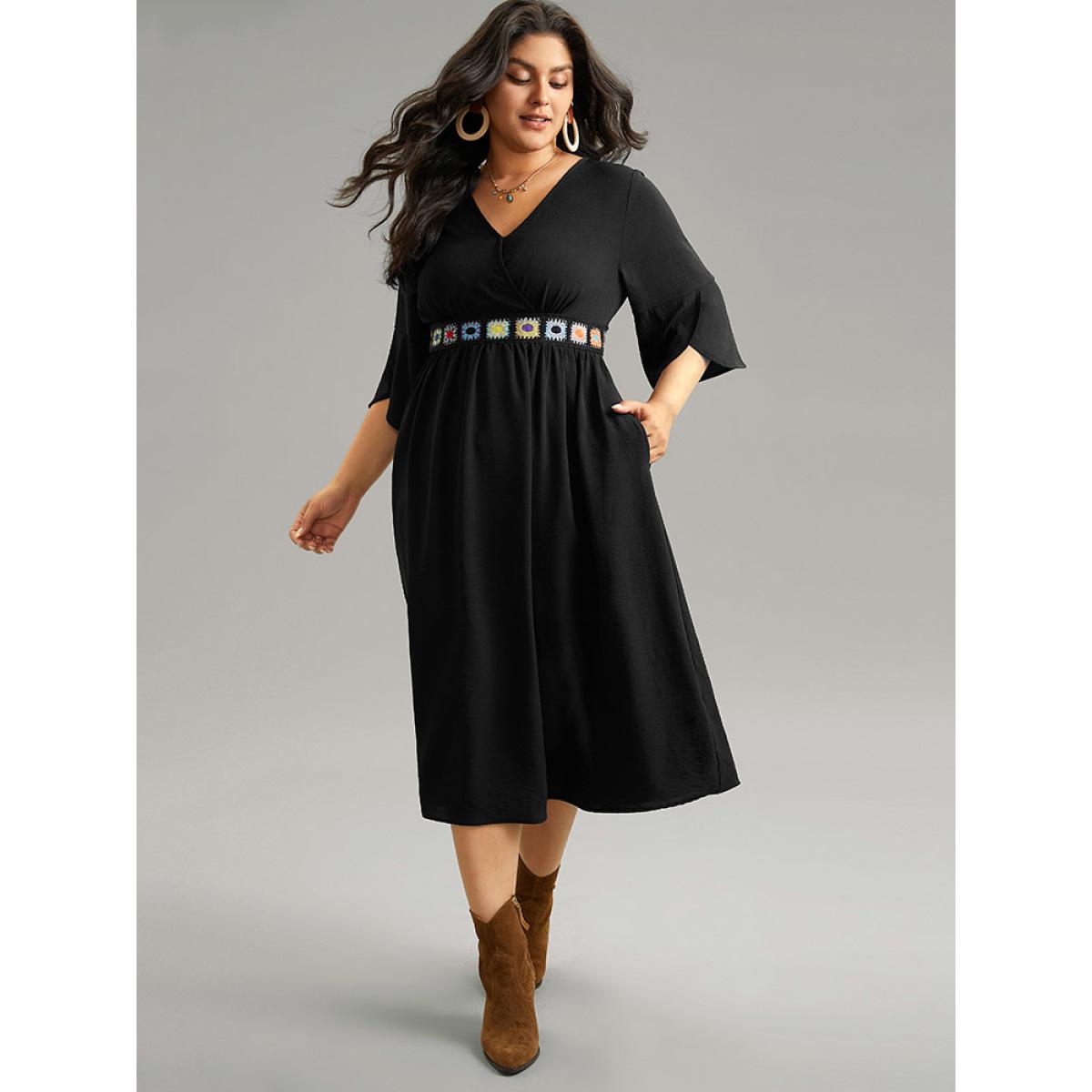 Plus Size Plain Elastic Waist Embroidered Wrap Dress Black Women Vacation Wrap Overlap Collar Elbow-length sleeve Curvy Midi Dress BloomChic 18-20/2X