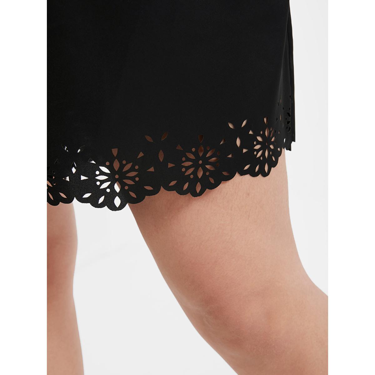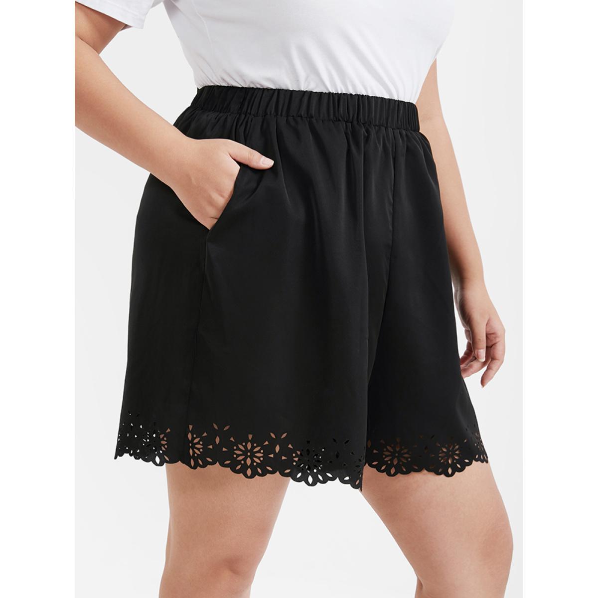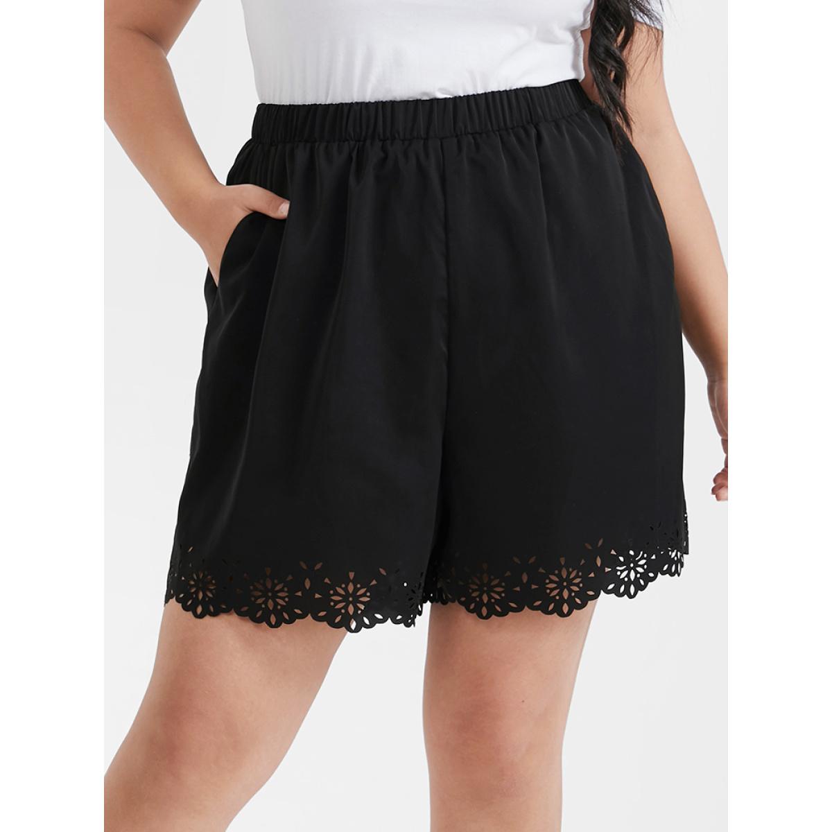 Plus Size Laser Cut Elastic Waist Scalloped Trim Shorts Women Black Elegant Non Loose Everyday Shorts BloomChic 26/4X
