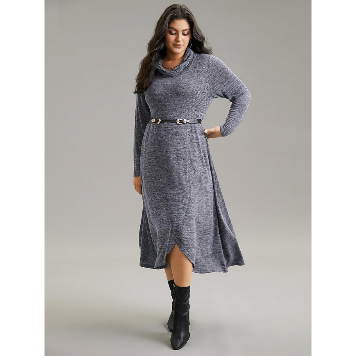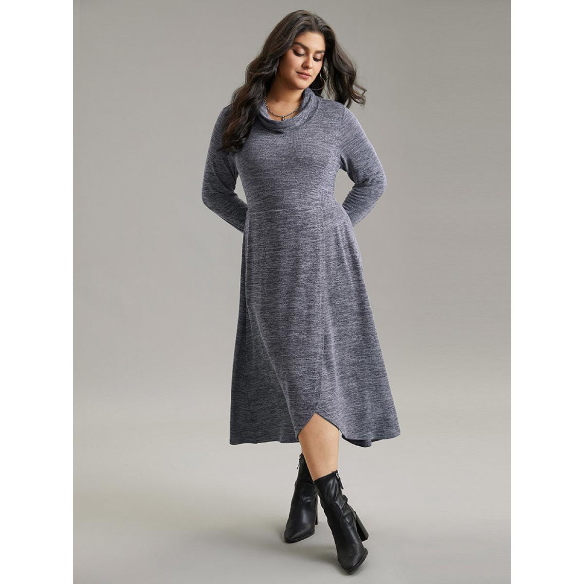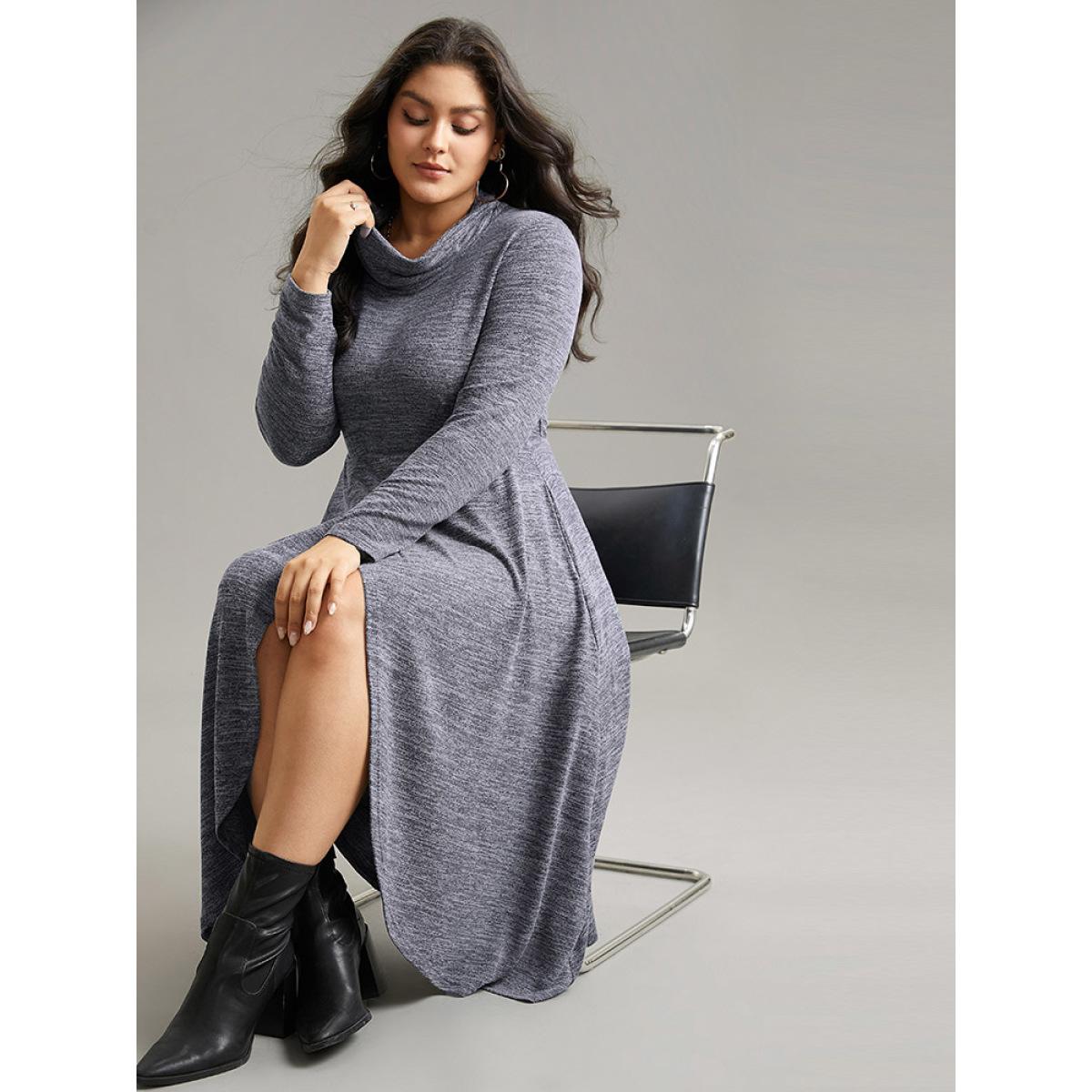 Plus Size Plain Funnel Neck Heather Arc Hem Dress Midnight Women Casual Plain Turtleneck Long Sleeve Curvy Midi Dress BloomChic 14-16/1X