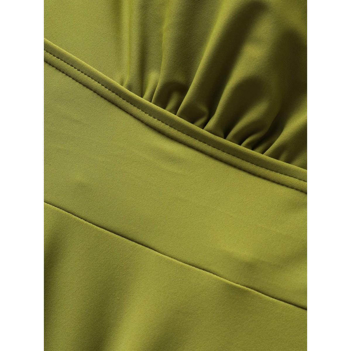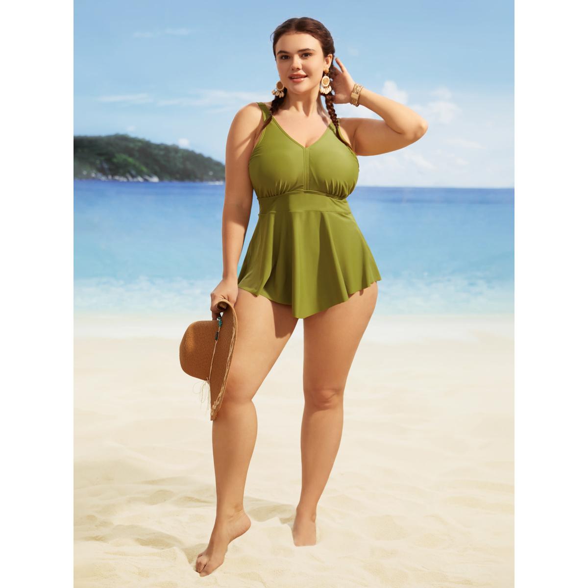 Plus Size Plain Gathered Asymmetrical Hem Swim Top Women's Swimwear Olive Beach Asymmetrical High stretch Bodycon V-neck Curve Swim Tops BloomChic 30/6X