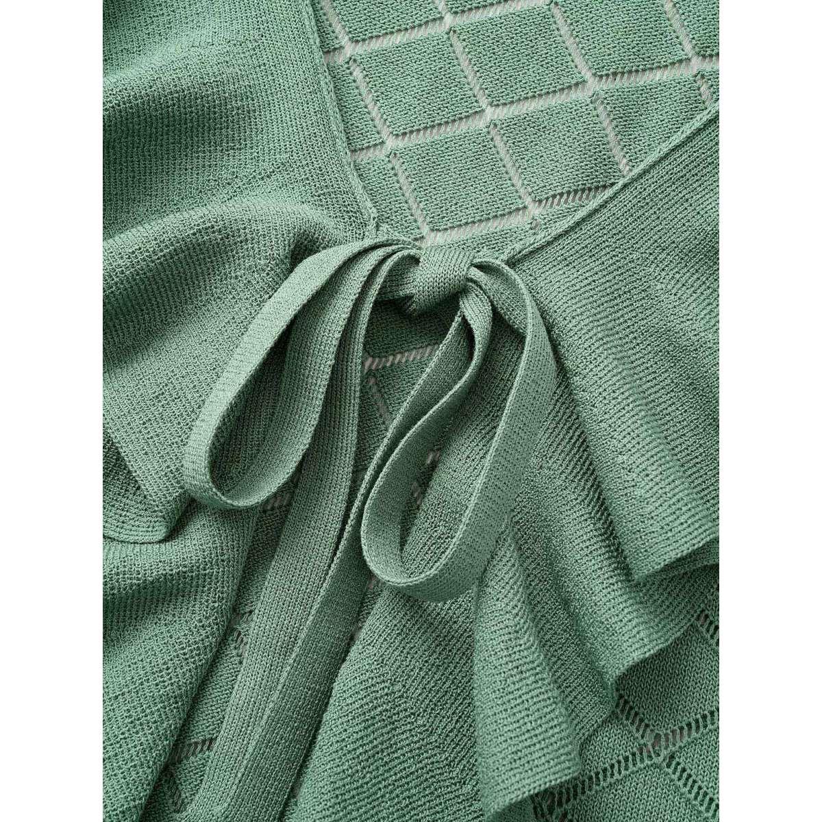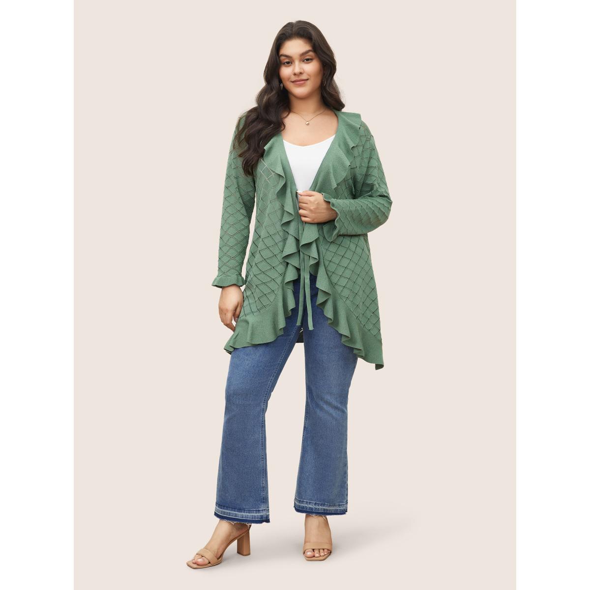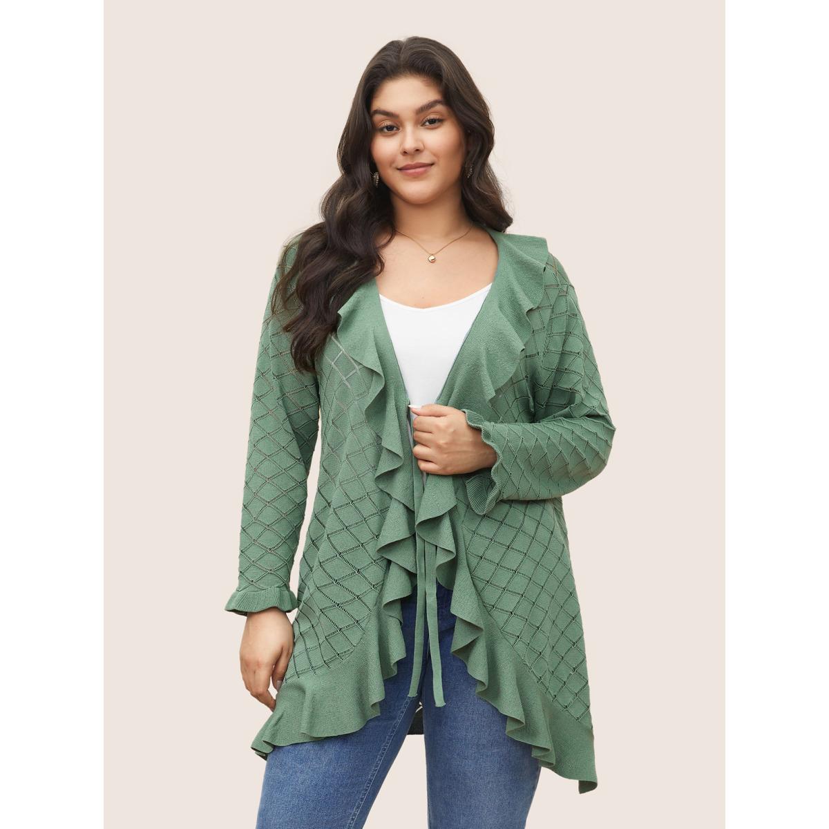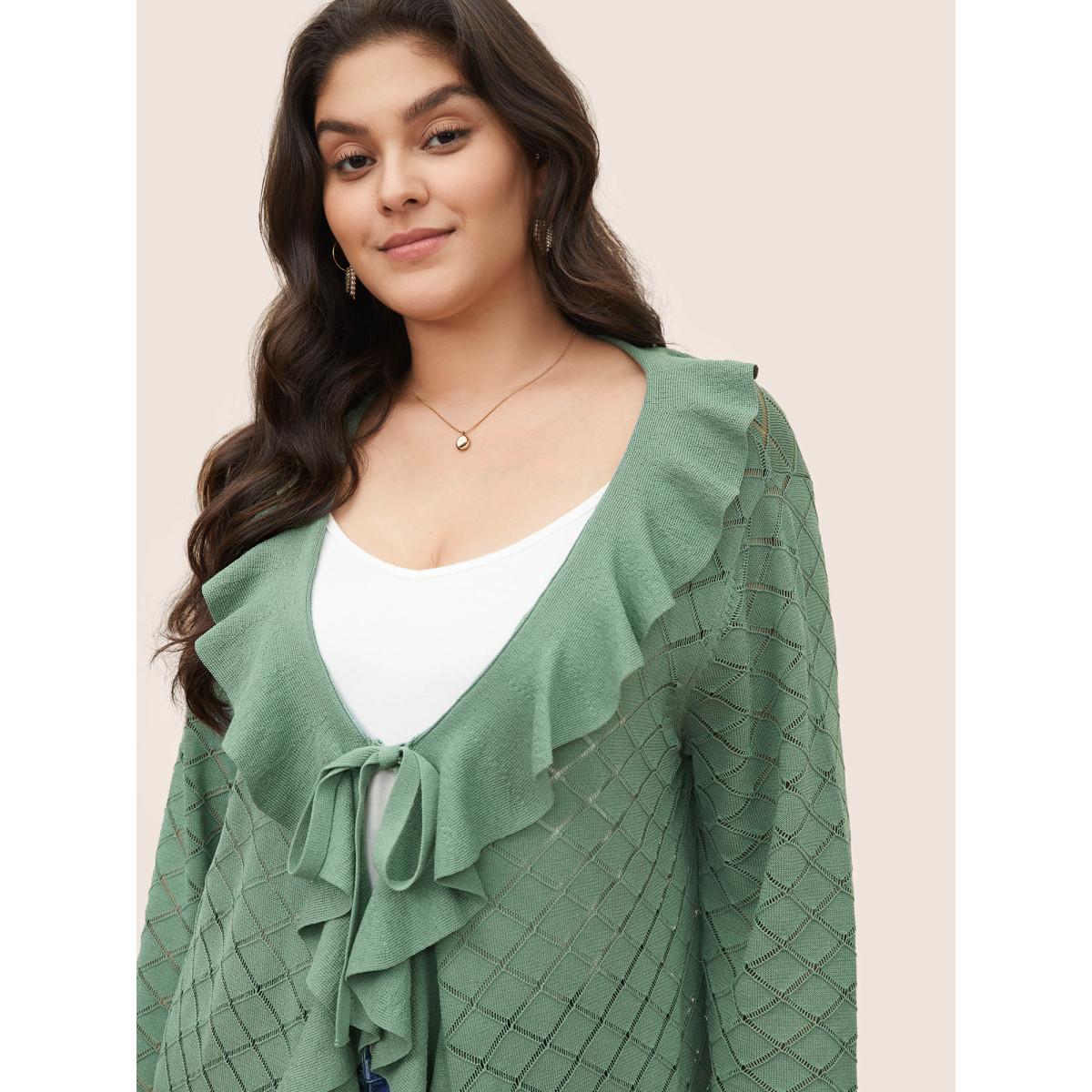 Plus Size Plain Geometric Cut Out Ruffles Ties Cardigan Emerald Women Everyday Elegant Cover Ups Bloomchic 18-20/2X