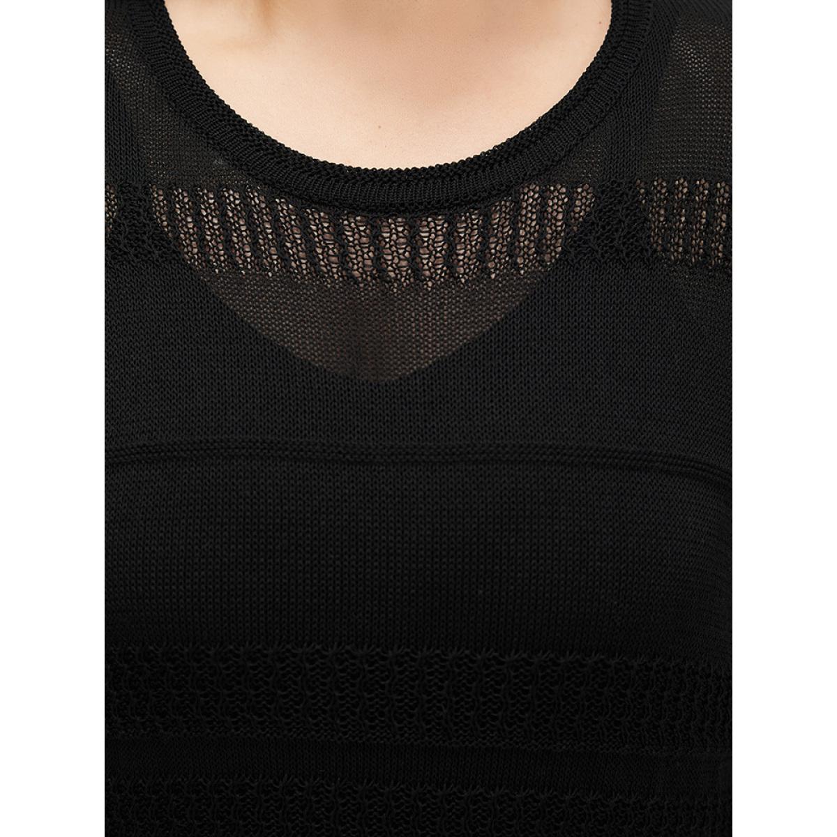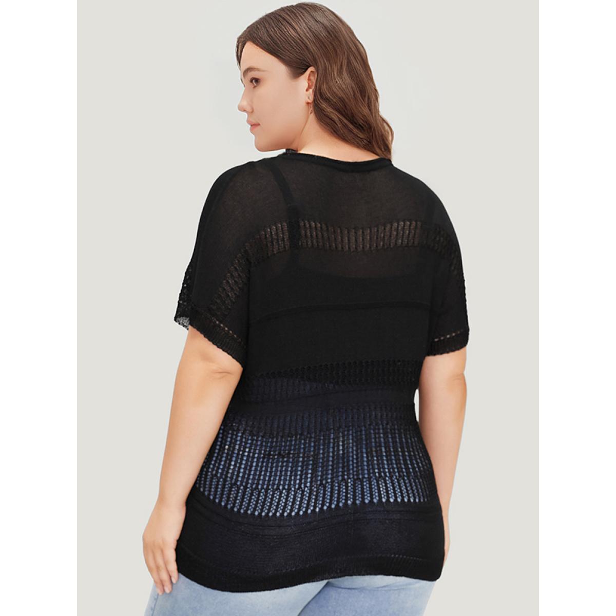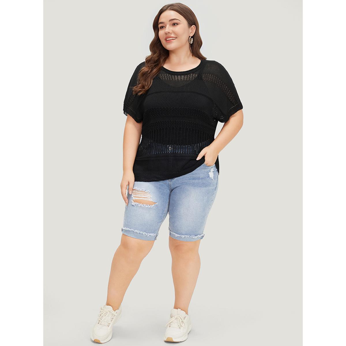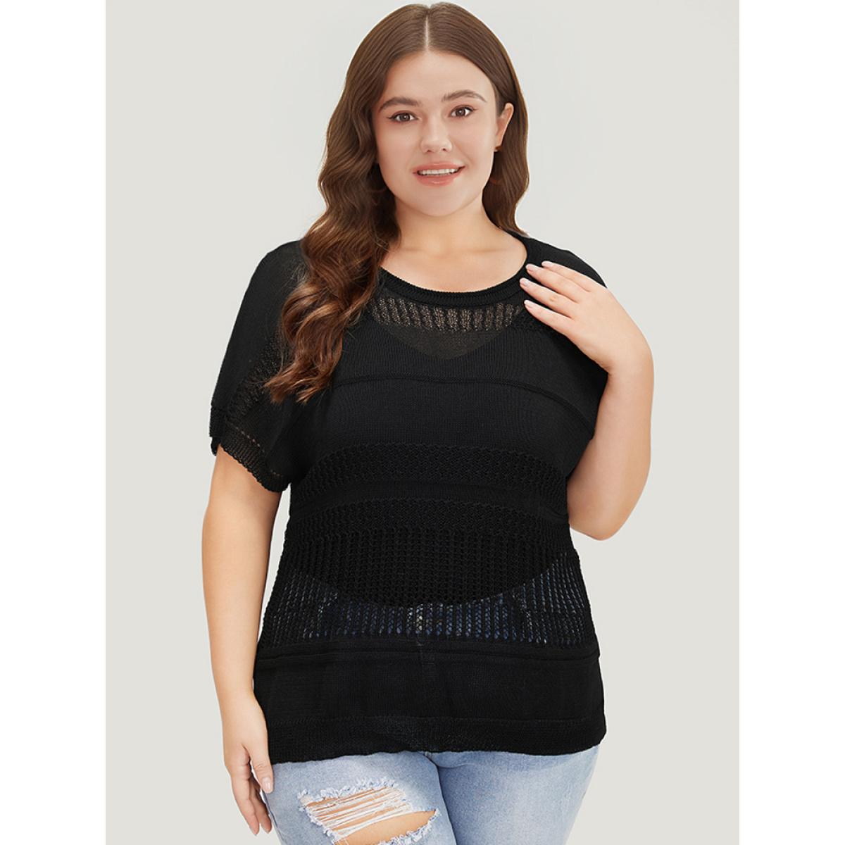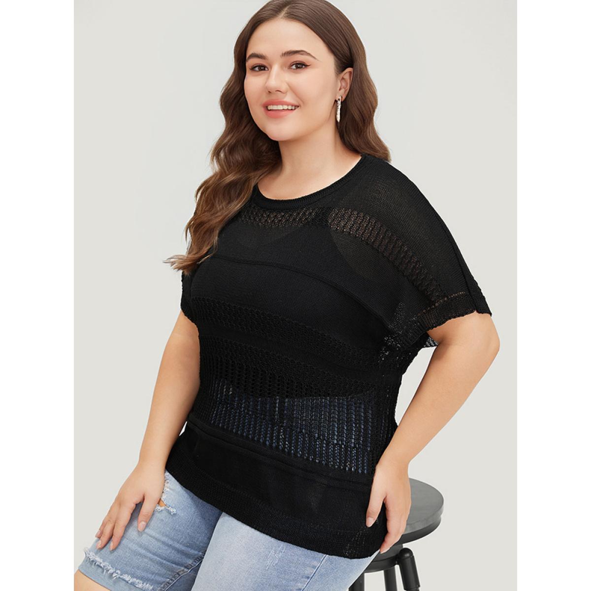 Plus Size Plain Geometric Eyelet Patchwork Batwing Sleeve Pullover Black Women Casual Loose Short sleeve Round Neck Dailywear Pullovers BloomChic 14-16/1X