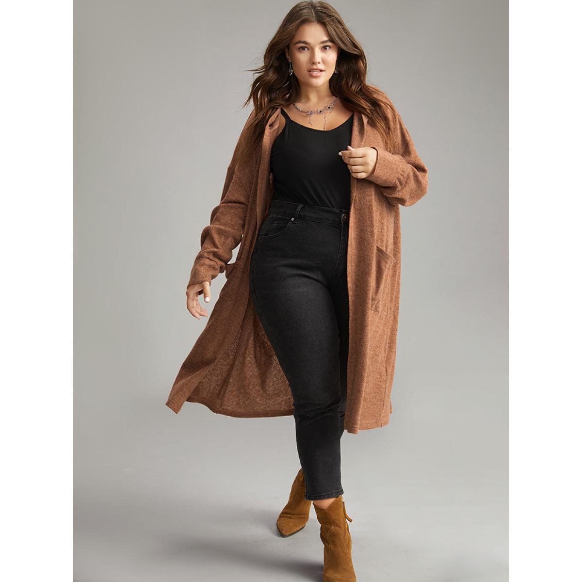 Plus Size Plain Hooded Pocket Open Front Kimono Women Rust Casual Texture Pocket Dailywear Kimonos BloomChic 26/4X