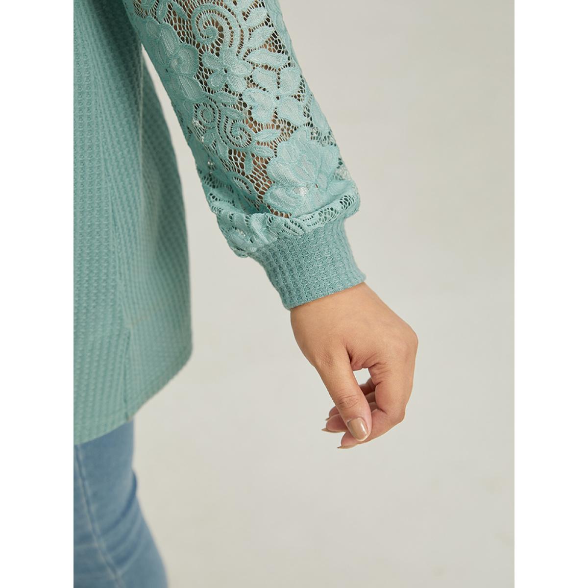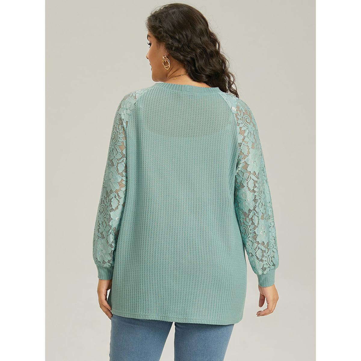 Plus Size Patchwork Lace Panel V Neck Waffle Knit Sweatshirt Women Blue Elegant Rib Knit V-neck Dailywear Sweatshirts BloomChic 14-16/1X
