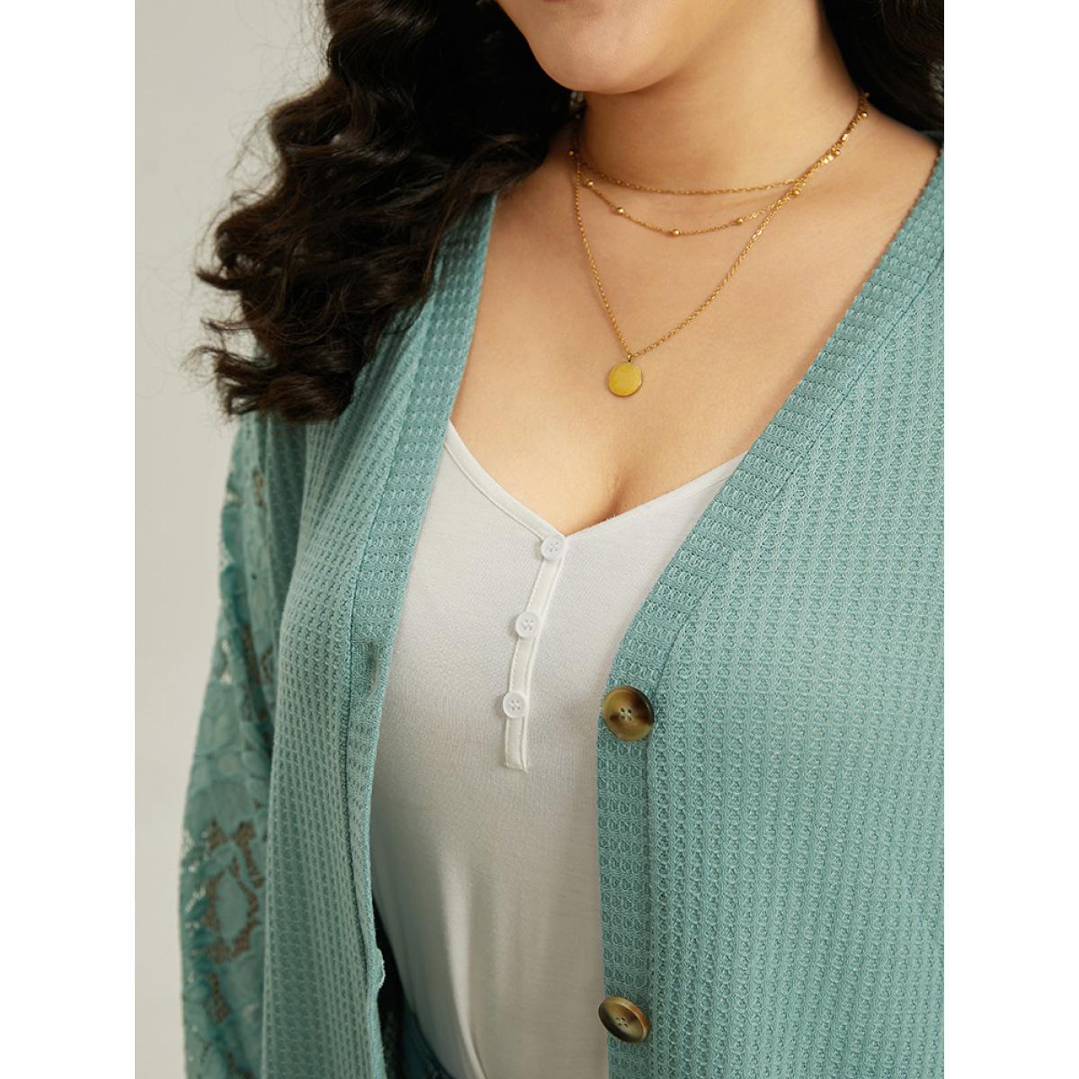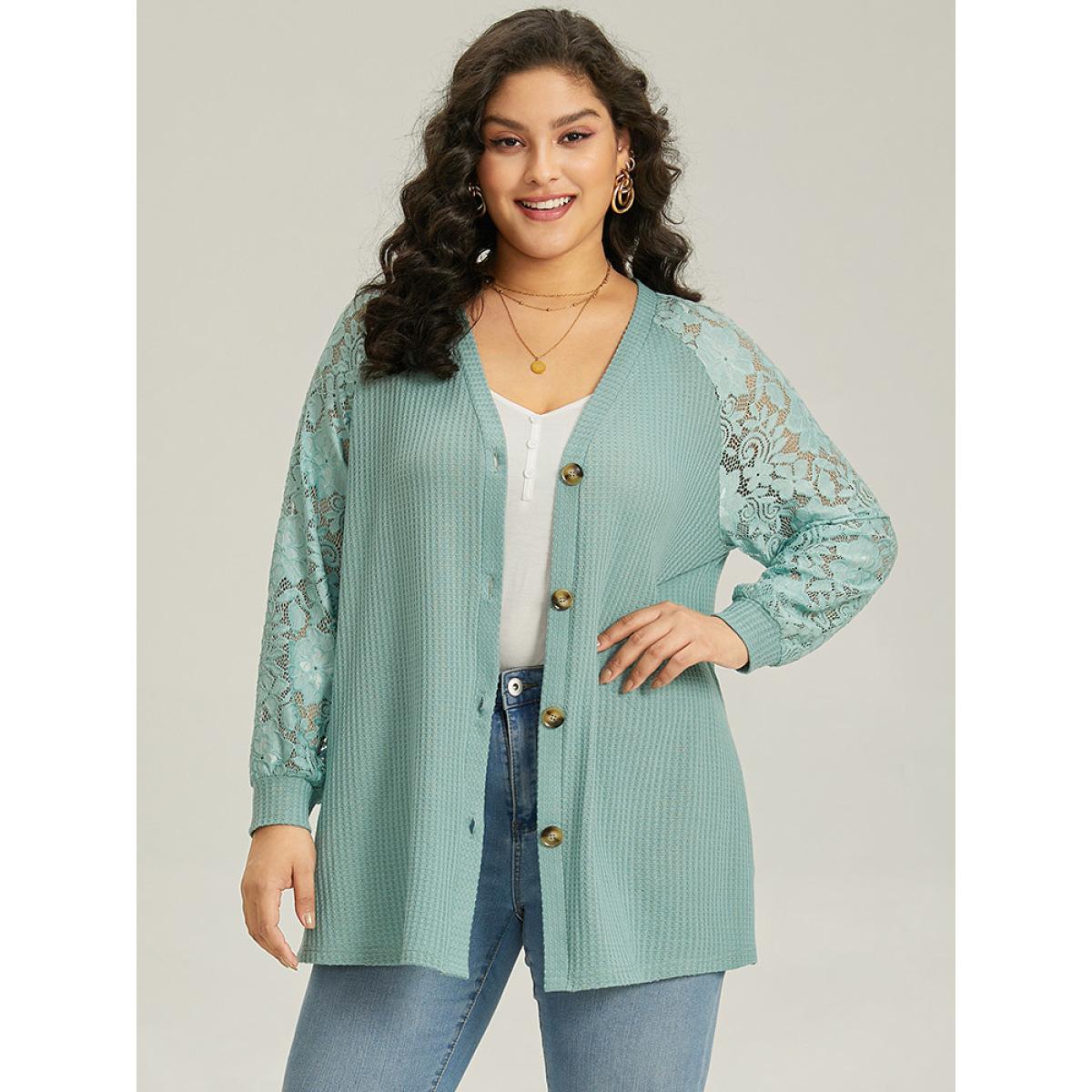 Plus Size Plain Lace Patchwork Texture Raglan Sleeve Coat Women Turquoise Casual Texture Dailywear Kimonos BloomChic 12/L