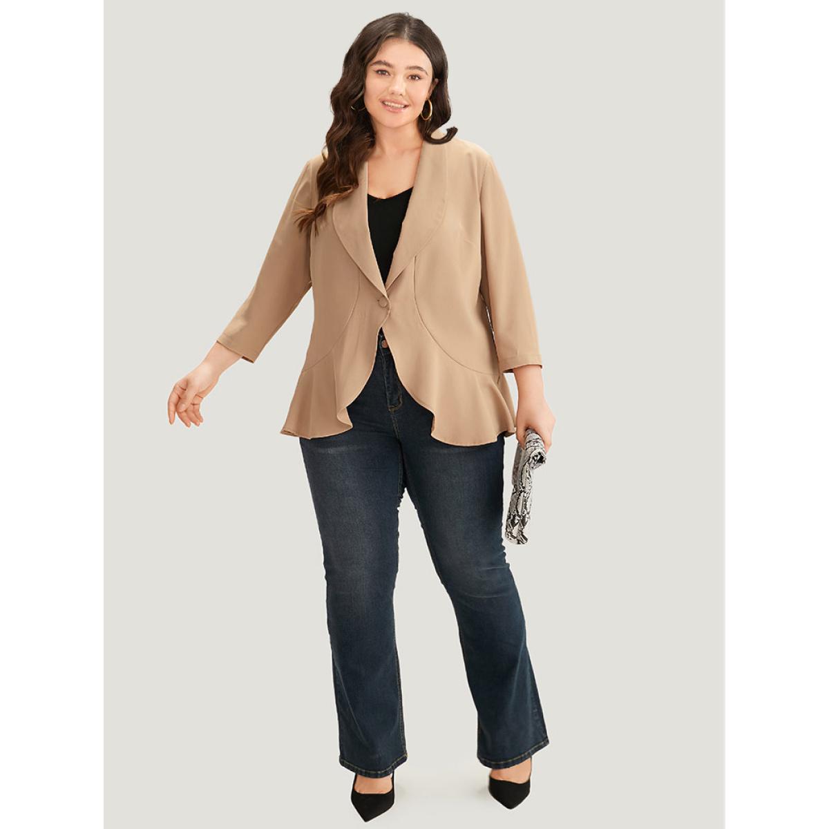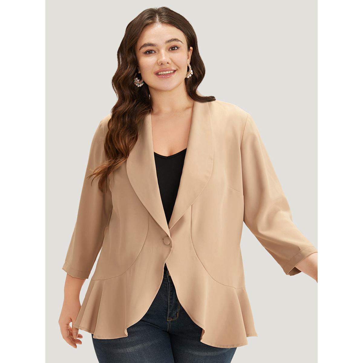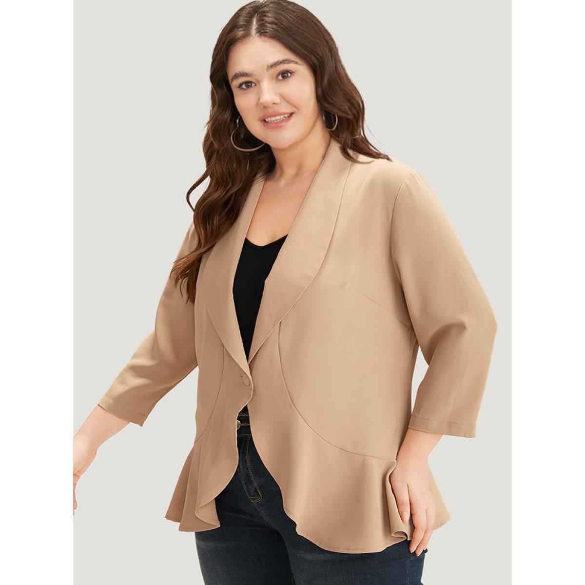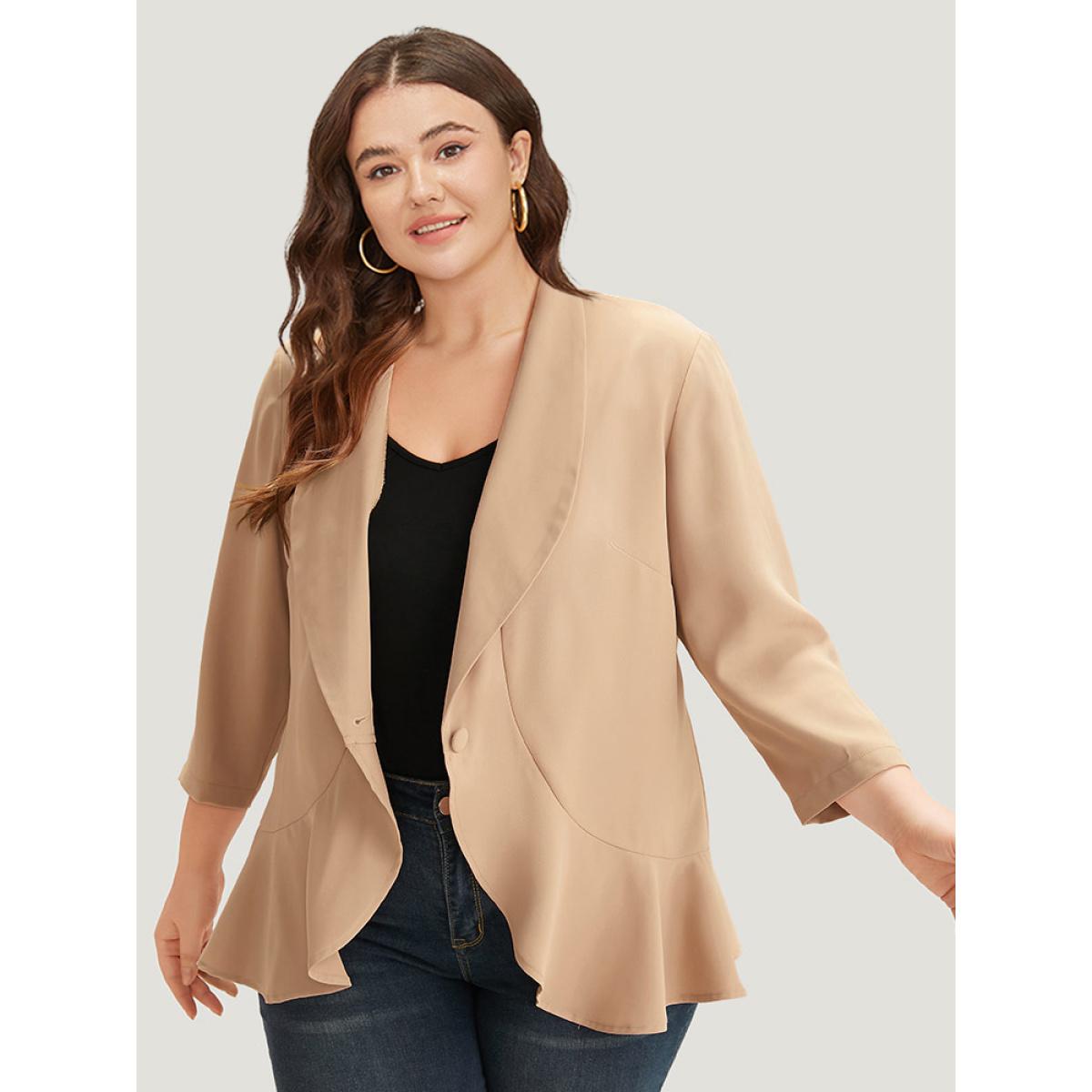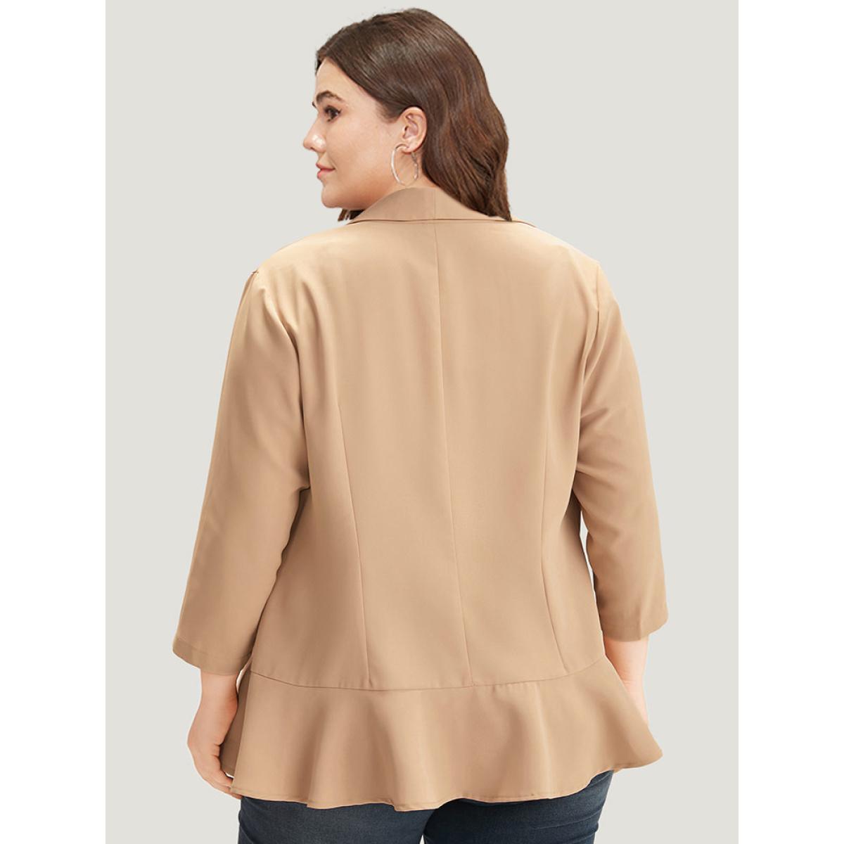 Plus Size Plain Lapel Collar Button Up Ruffle Trim Blazer Tan Women Work Plain Plain Sleeve Elbow-length sleeve Lapel Collar 26/4X Office Blazers BloomChic