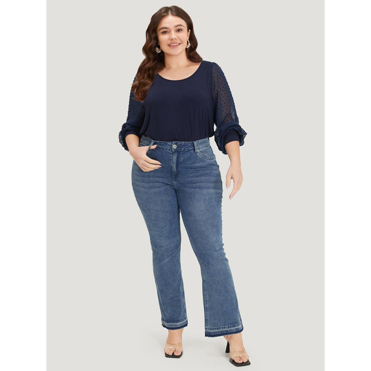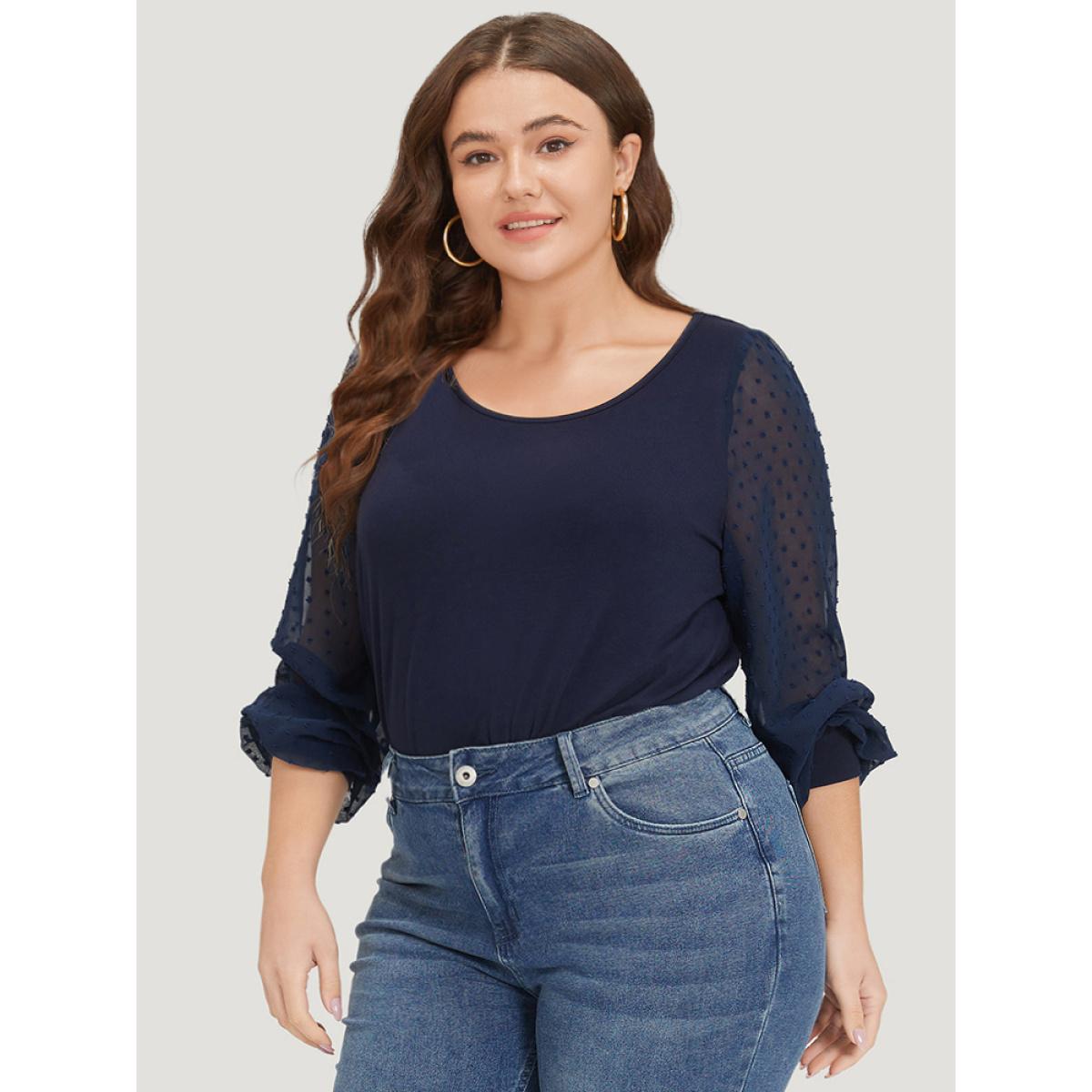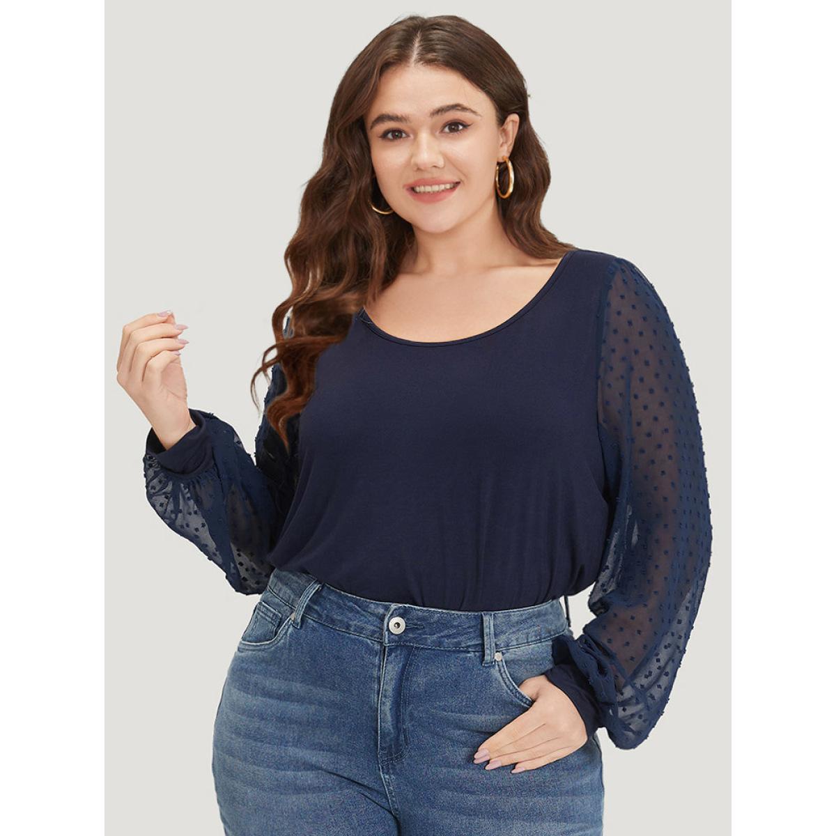Plus Size Plain Mesh Patchwork Lantern Sleeve Crew Neck Bodysuit Women Blue Plain Elastic cuffs Bodysuits BloomChic 30/6X Product Image