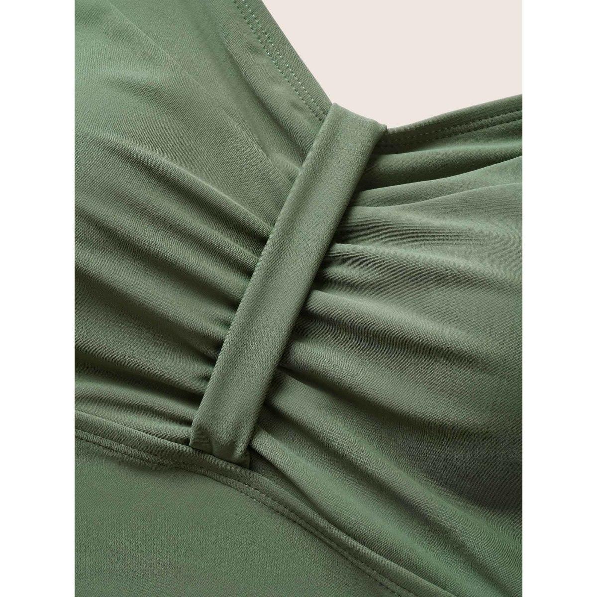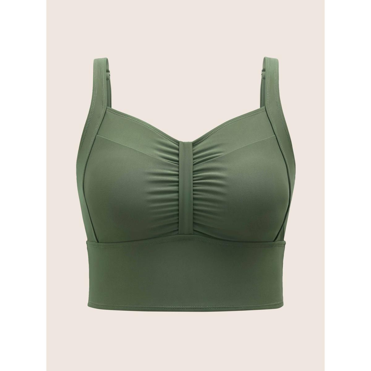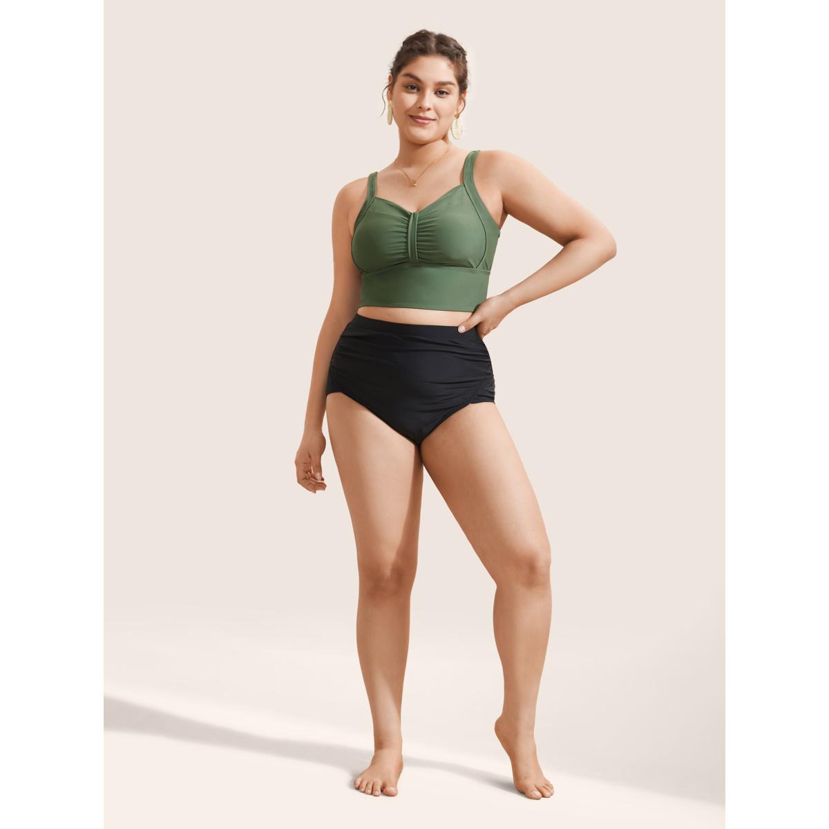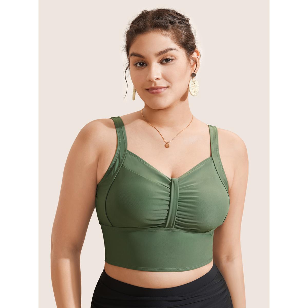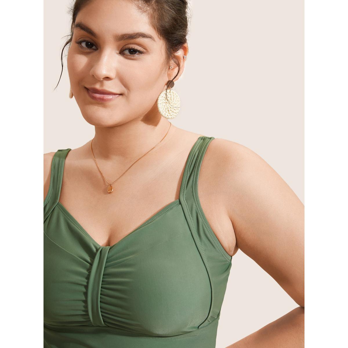 Plus Size Plain Patchwork Ruched Adjustable Straps Swim Top Women's Swimwear ArmyGreen Beach Non High stretch Skinny Heart neckline Curve Swim Tops BloomChic 22-24/3X