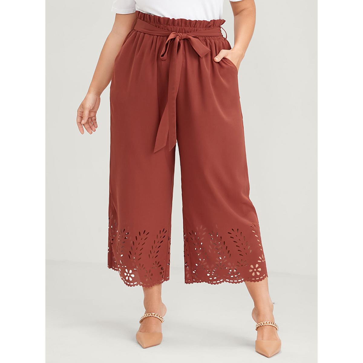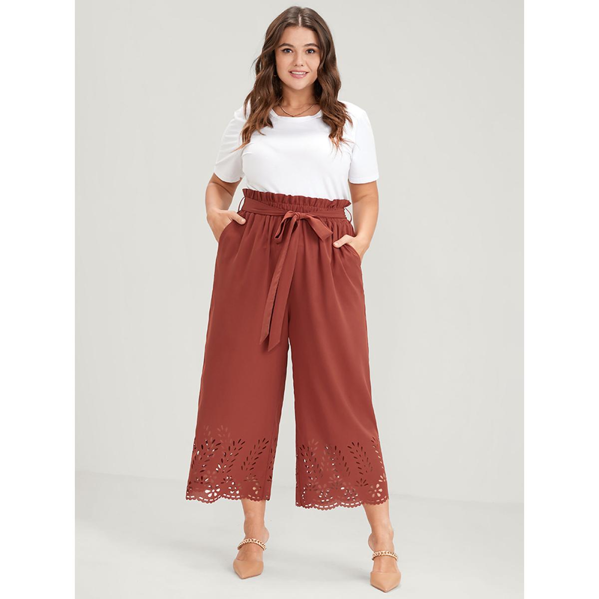Plus Size Plain Pocket Laser Cut Belted Paperbag Waist Pants Women Chocolate Elegant Wide Leg High Rise Dailywear Pants BloomChic 28/5X