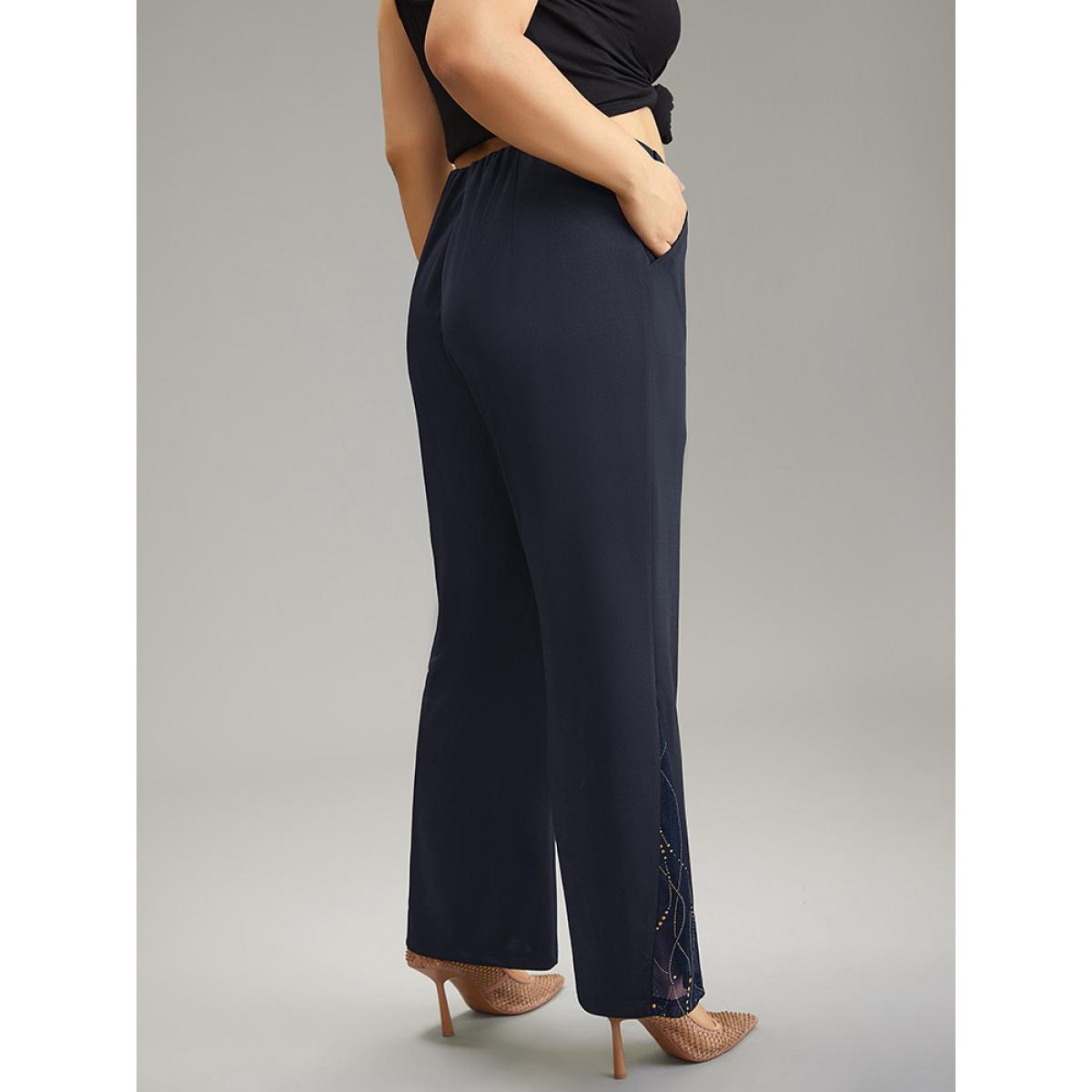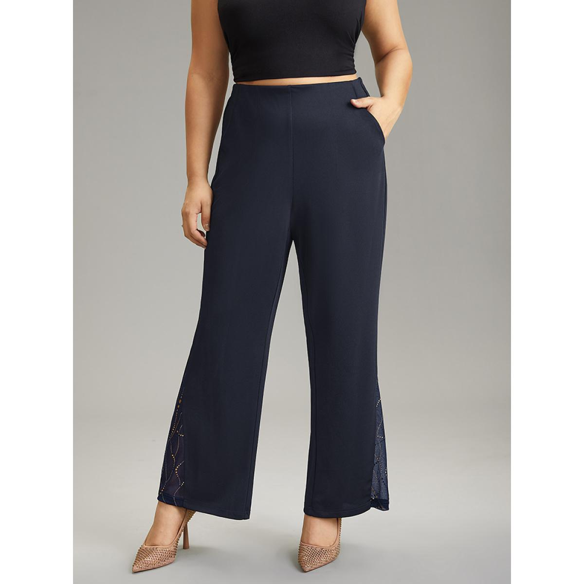 Plus Size Plain Rhinestone Patchwork Mesh Bootcut Pants Women Indigo Glamour Bootcut High Rise Party Pants BloomChic 28/5X Product Image
