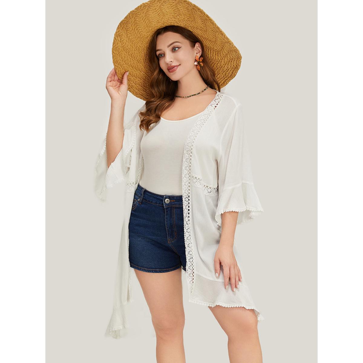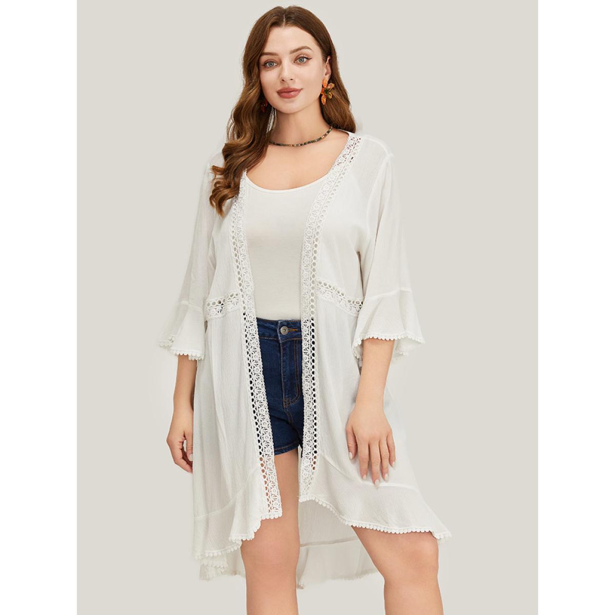 Plus Size Plain Ruffle Sleeve Open Front Eyelet Lace Kimono Women White Vacation Loose Dailywear Kimonos BloomChic 14-16/1X