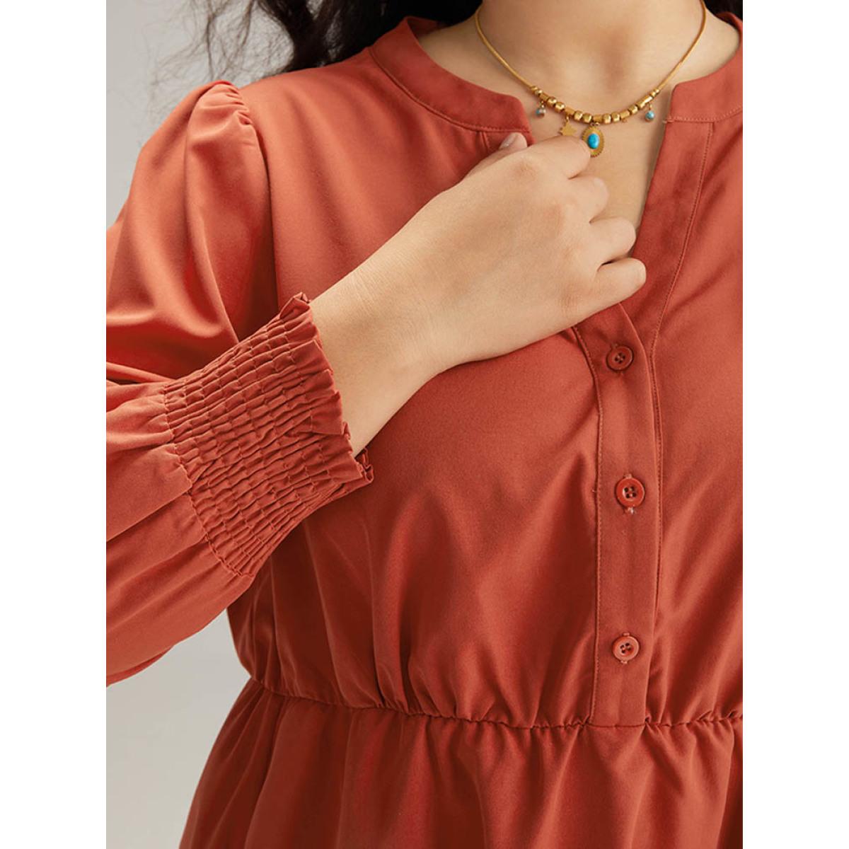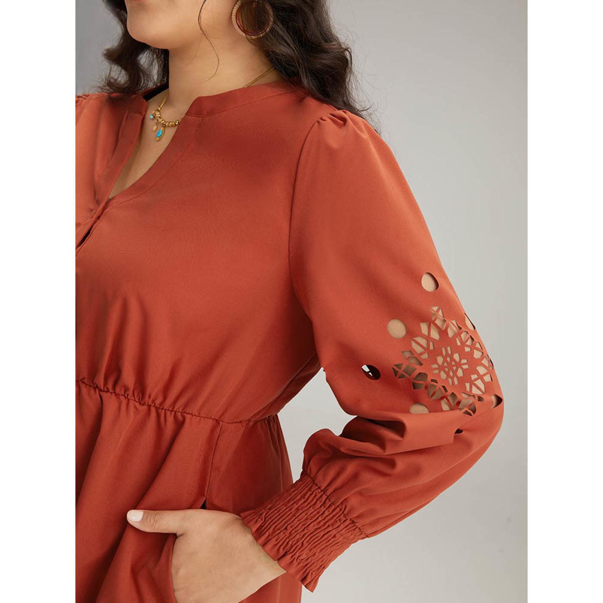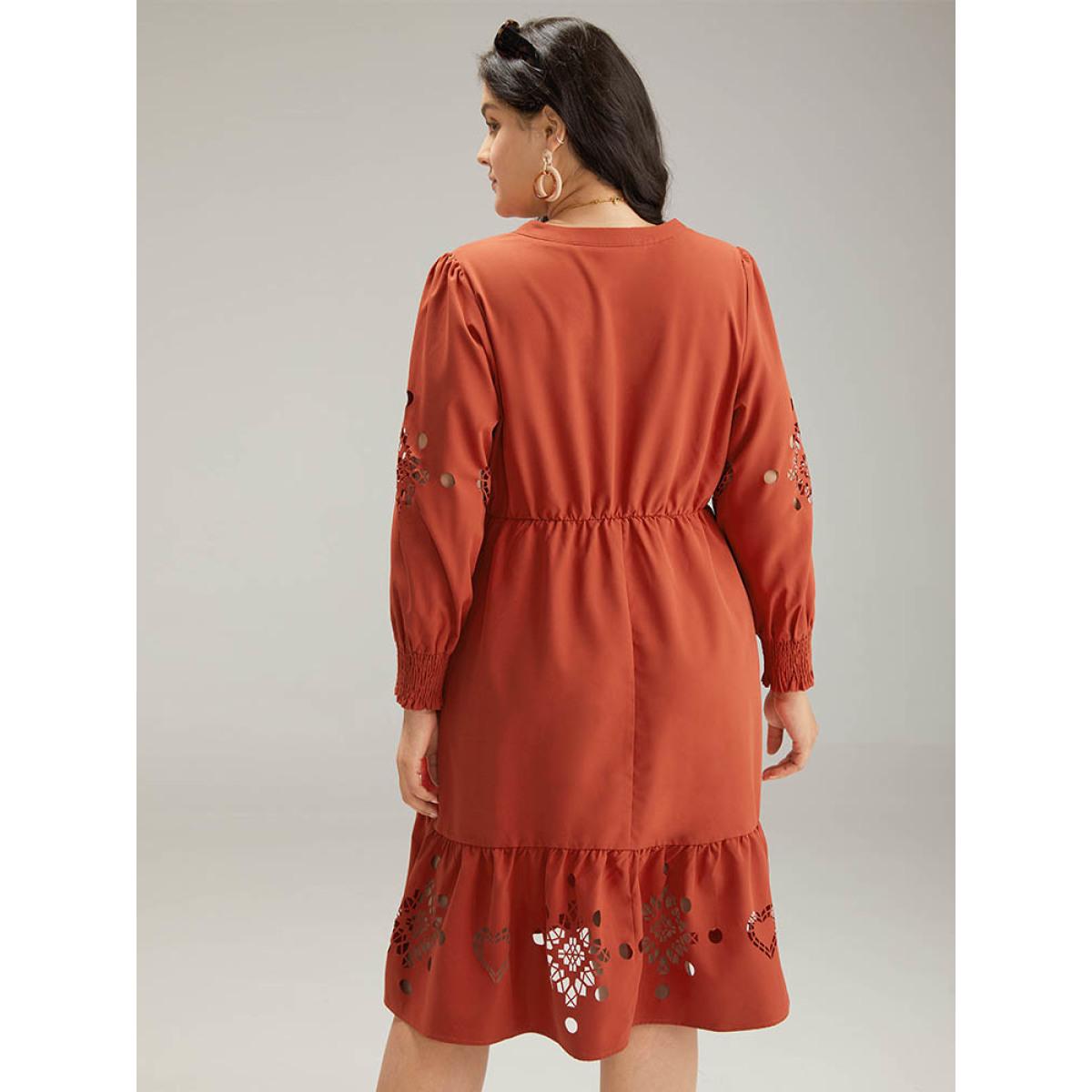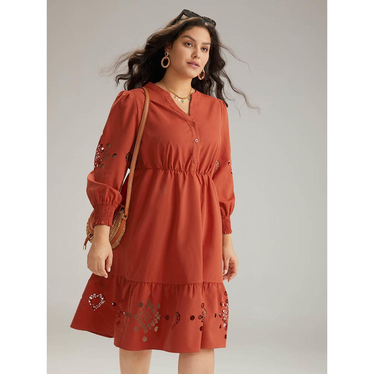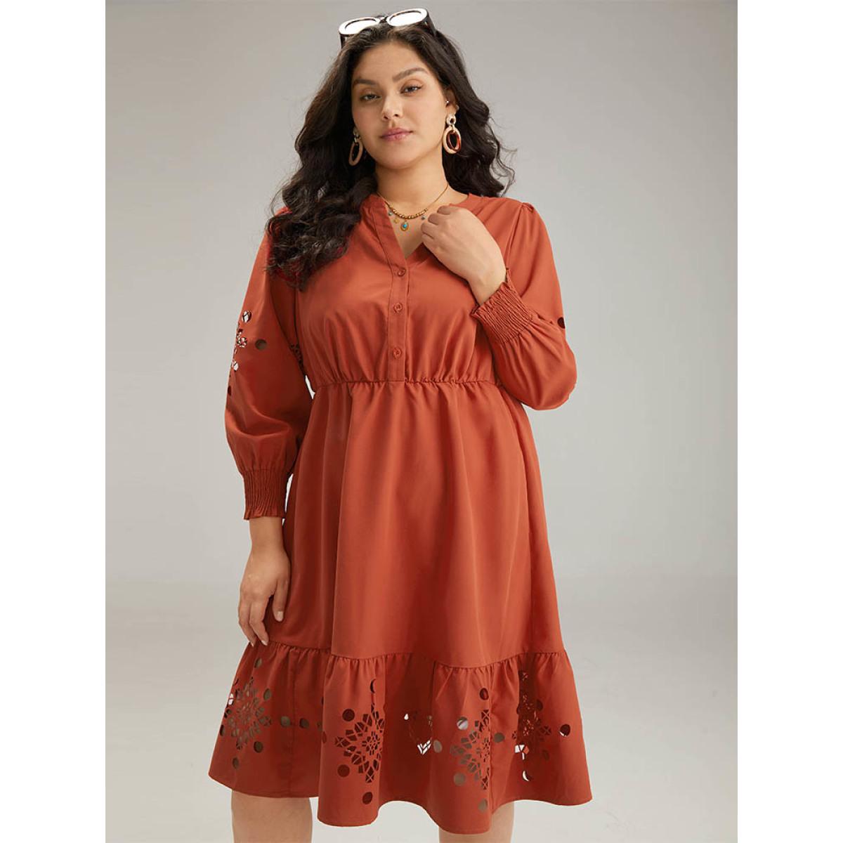 Plus Size Plain Shirred Button Up Laser Cut Dress Maroon Women Vacation Plain Notched collar Long Sleeve Curvy Midi Dress BloomChic 18-20/2X