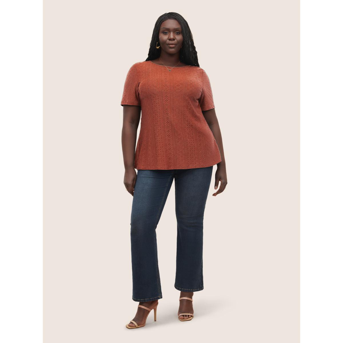 Plus Size Embroidered Button Detail Crew Neck Flutter Sleeve T-shirt Rust Women Elegant Texture Plain Round Neck Dailywear T-shirts BloomChic 28/5X