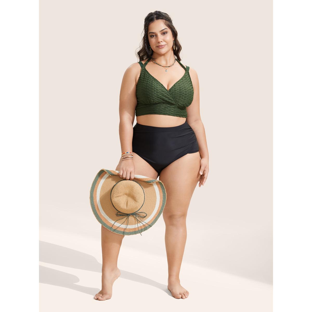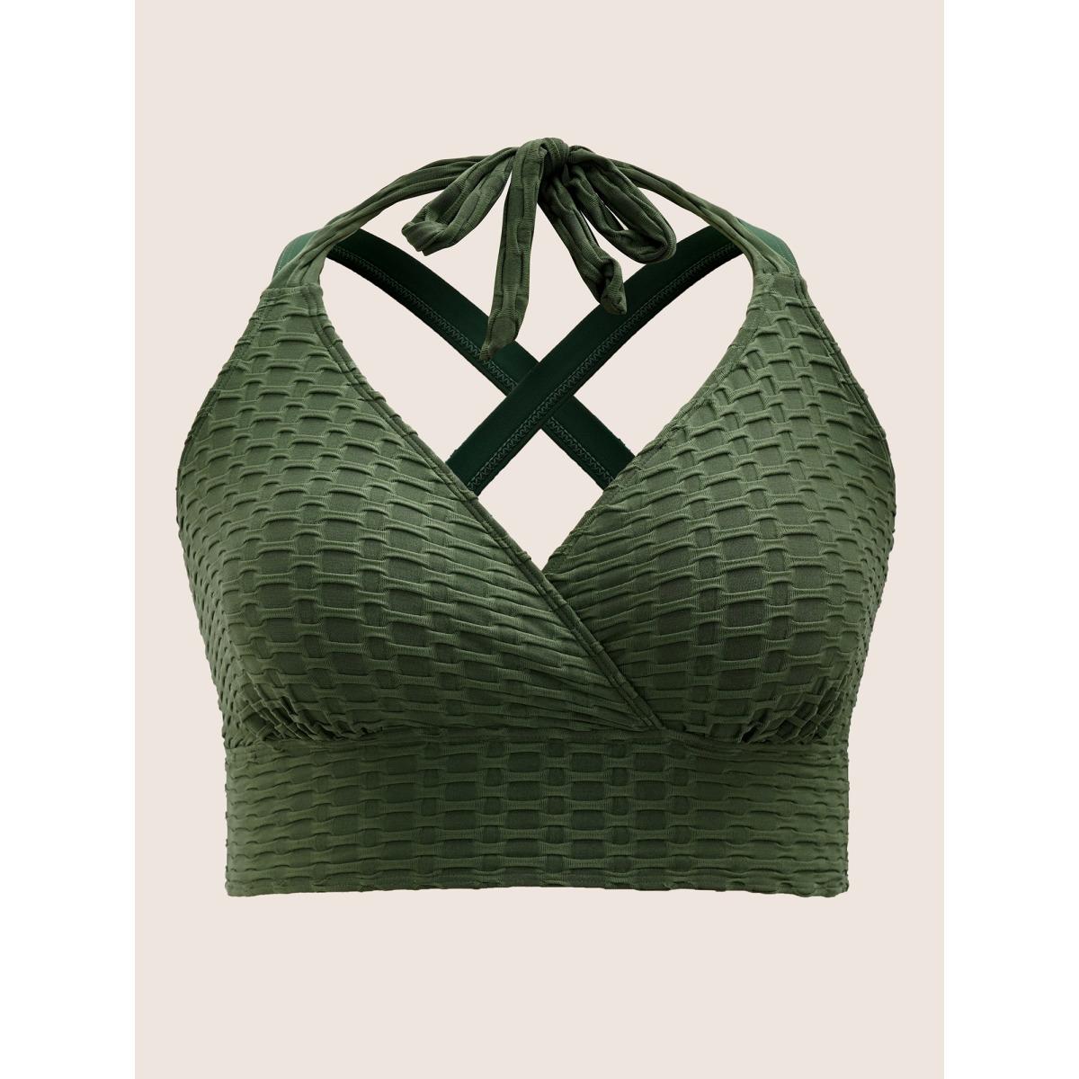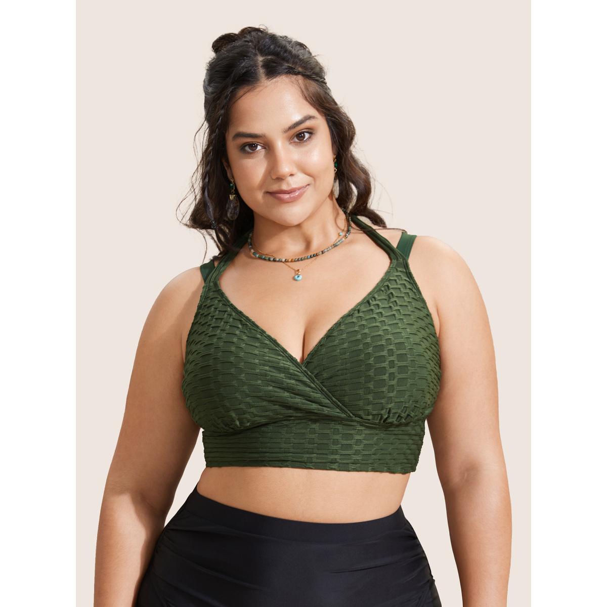 Plus Size Plain Textured Wrap Tie Knot Swim Top Women's Swimwear ArmyGreen Resort Tie knot High stretch Skinny Overlap Collar Curve Swim Tops BloomChic 30/6X