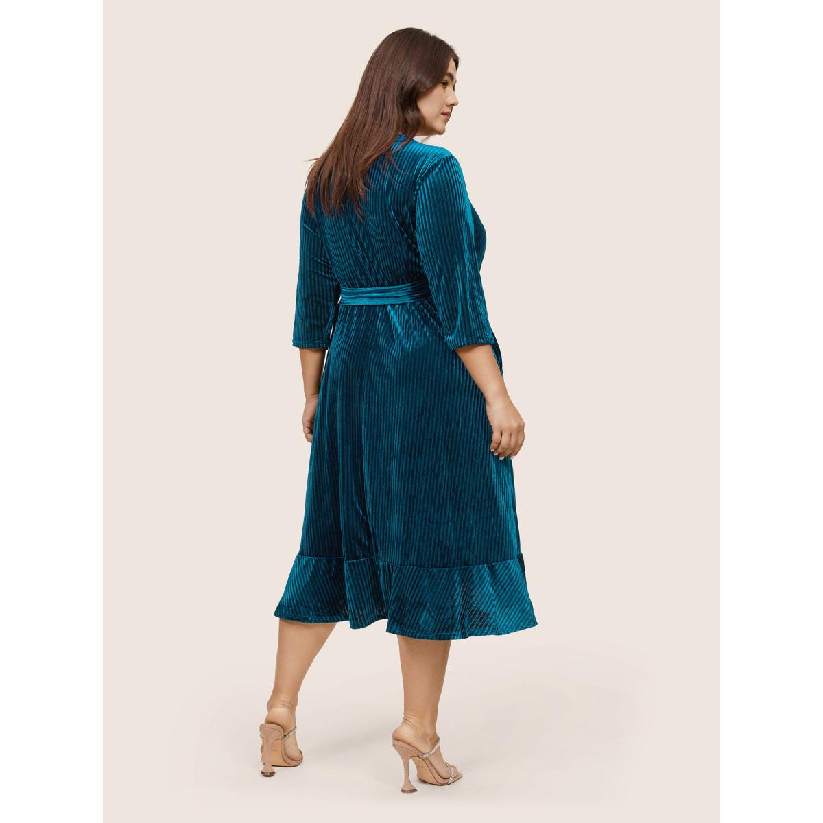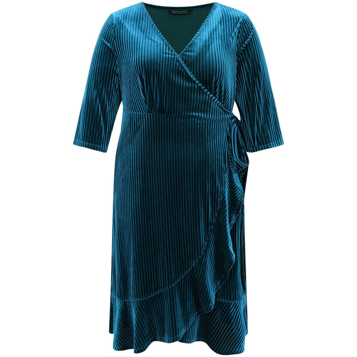 Plus Size Plain Velvet Ties Arc Hem Overlap Collar Dress Cerulean Women Glamour Velvet Overlap Collar Elbow-length sleeve Curvy Midi Dress BloomChic 26/4X