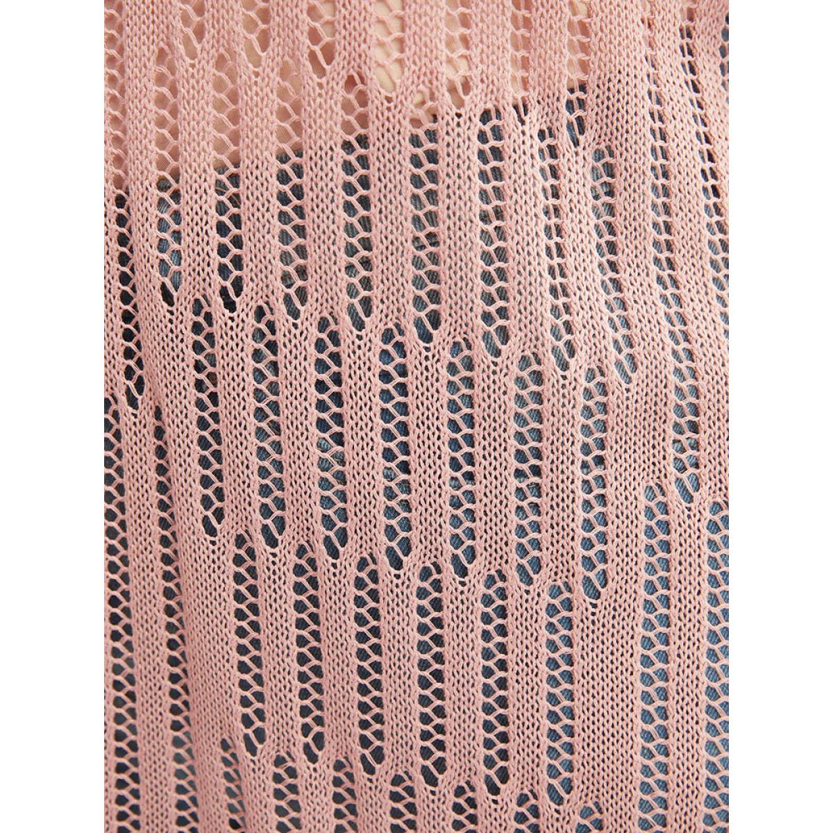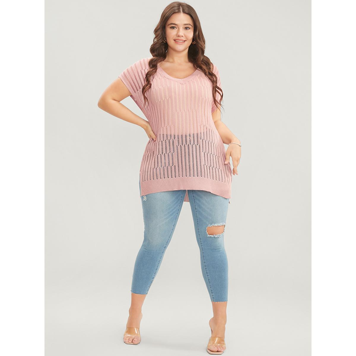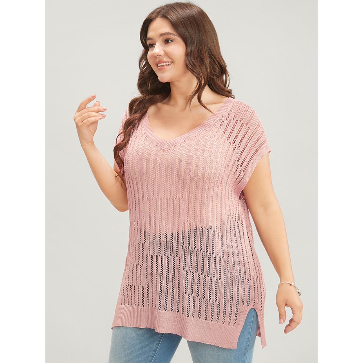 Plus Size Plain Vertical Striped Cut Out Split Hem Knit Top Coral Women Casual Sleeveless V-neck Dailywear Pullovers BloomChic 14-16/1X