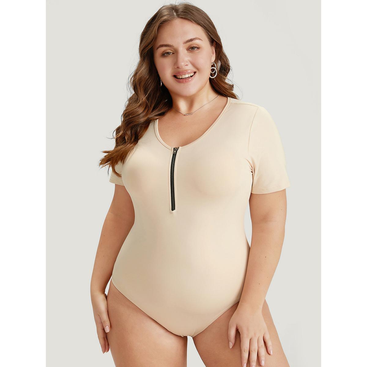 Plus Size Plain Zipper Half Crew Neck Bodysuit Women Champagne Plain Zipper Bodysuits BloomChic 26/4X