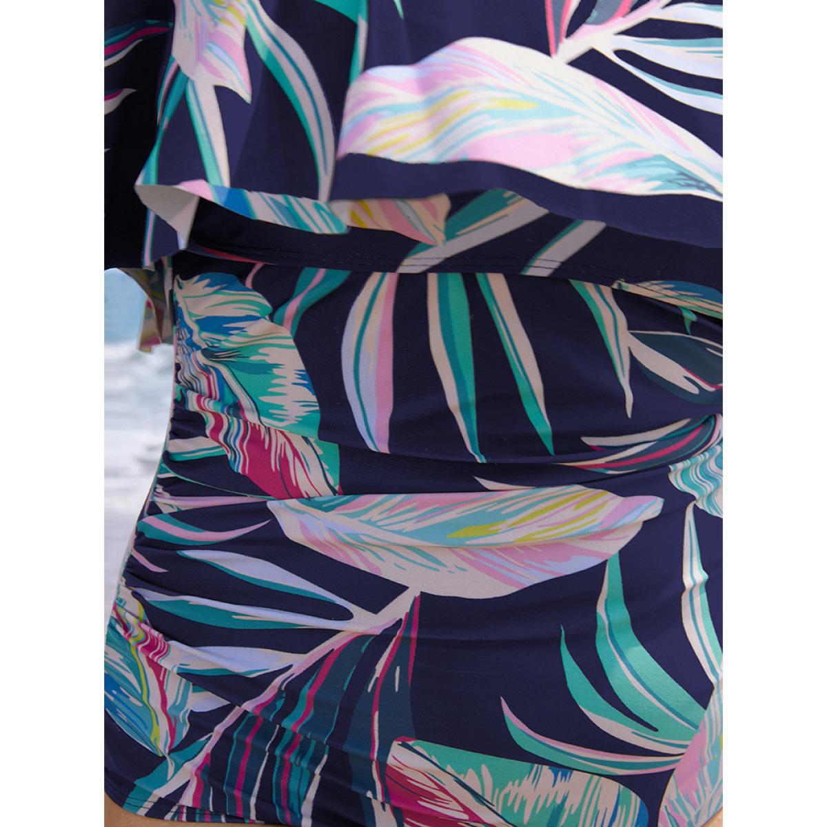 Plus Size Plant Print Cold Shoulder Ruffle Trim One Piece Swimsuit Women's Swimwear DarkBlue Vacation Adjustable Straps Curve Bathing Suits High stretch One Pieces BloomChic 30/6X