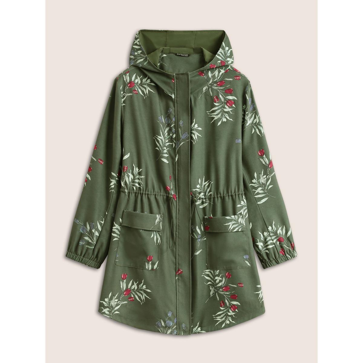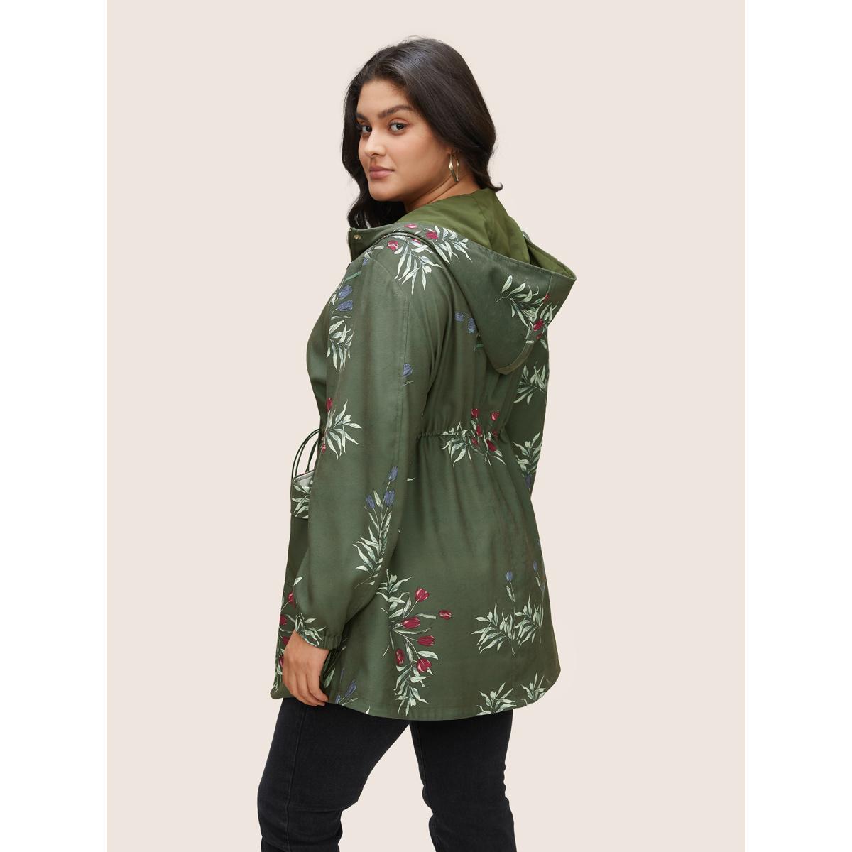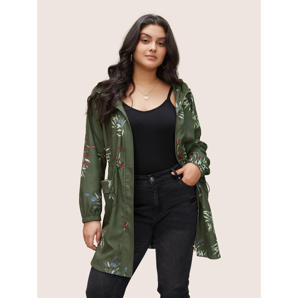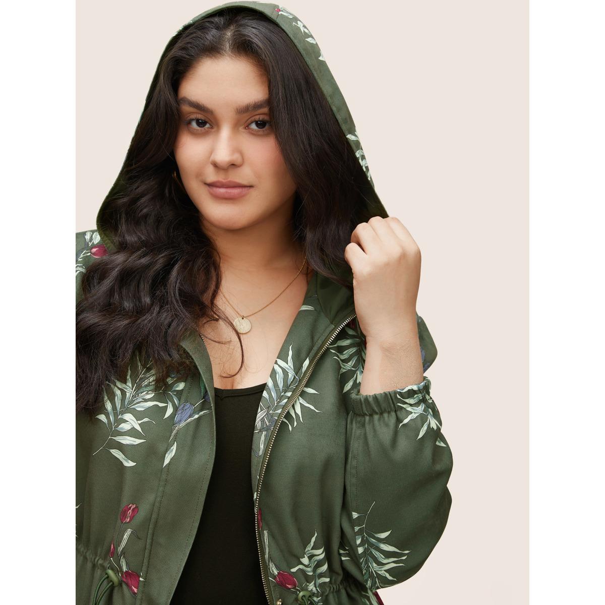Plus Size Plants Drawstring Pocket Zipper Hooded Coat Women ArmyGreen Elegant Elastic cuffs Ladies Everyday Winter Coats BloomChic 22-24/3X