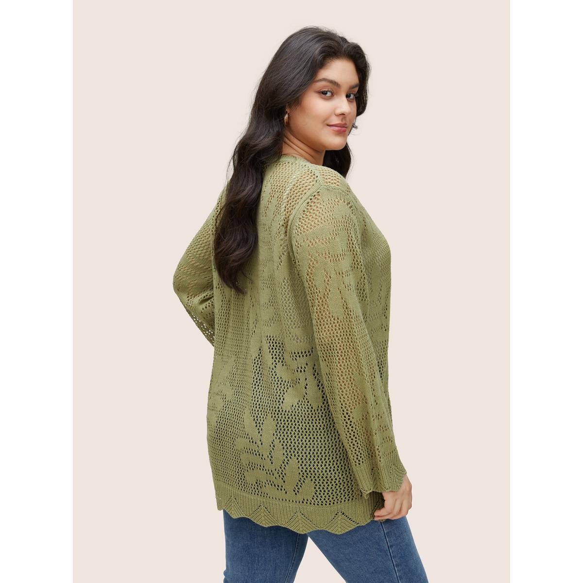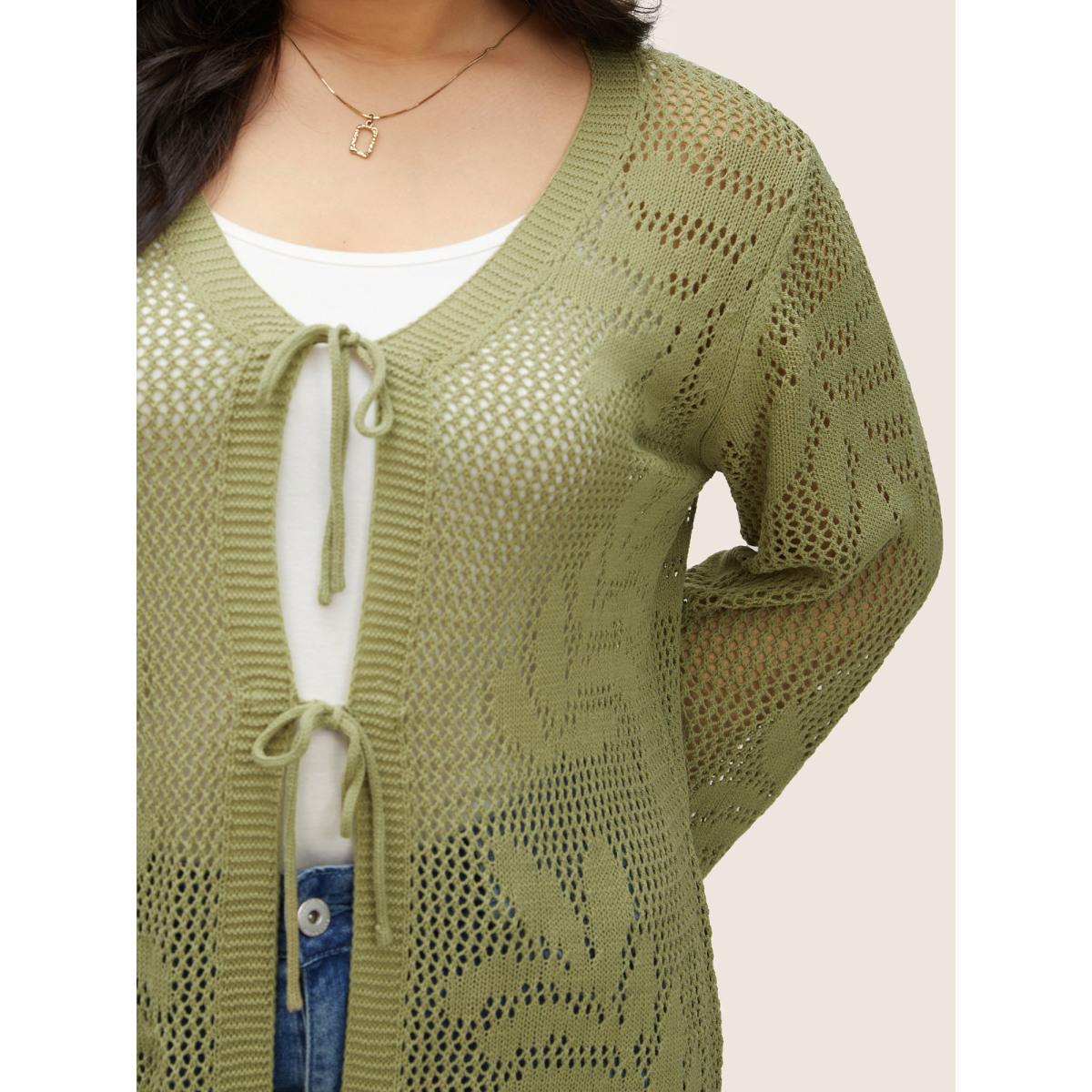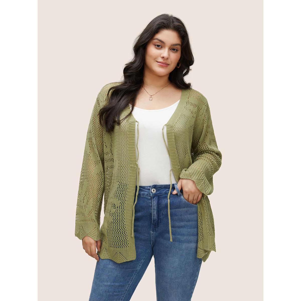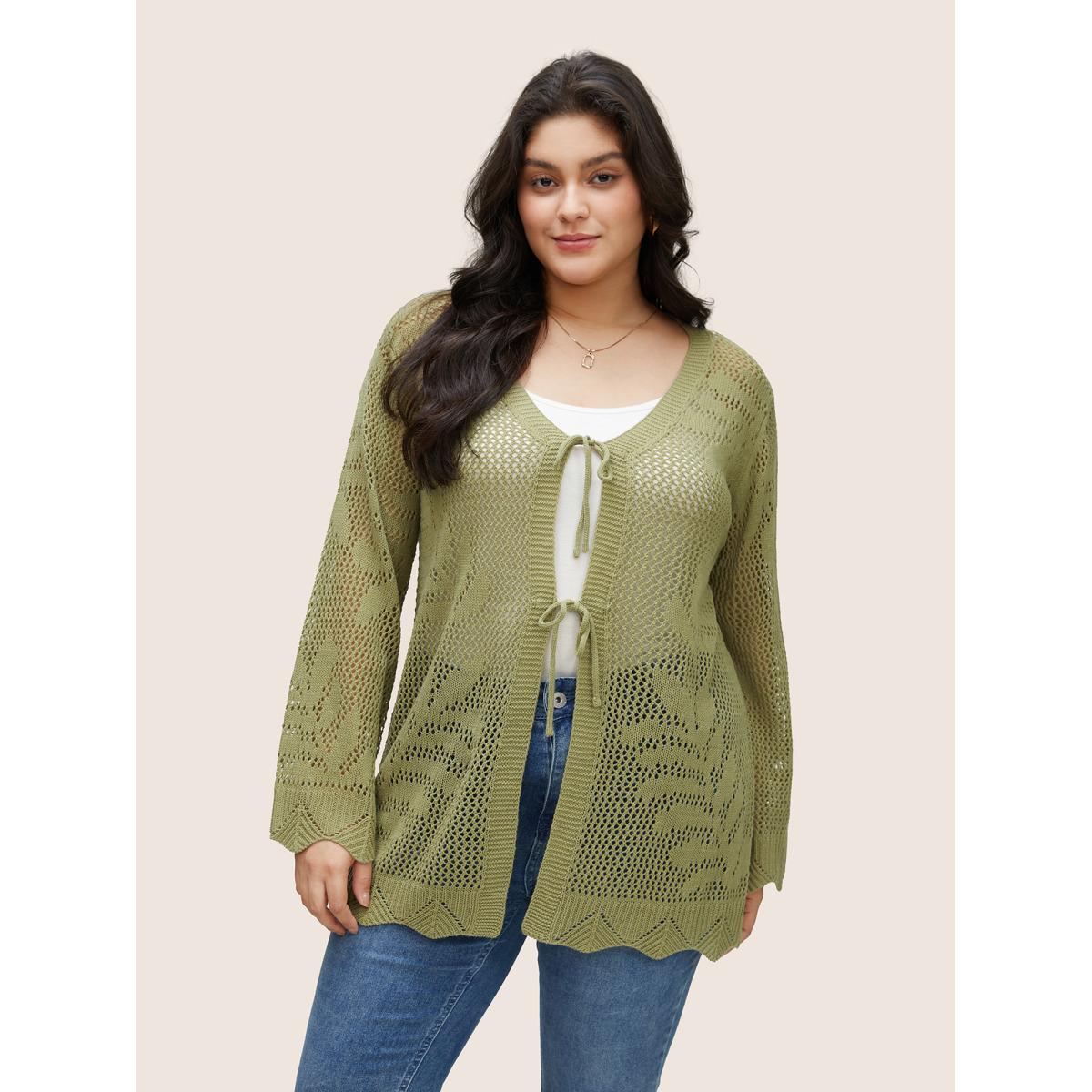 Plus Size Plants Hollow Out Ties Scalloped Trim Cardigan YellowGreen Women Everyday Casual Cover Ups Bloomchic 18-20/2X
