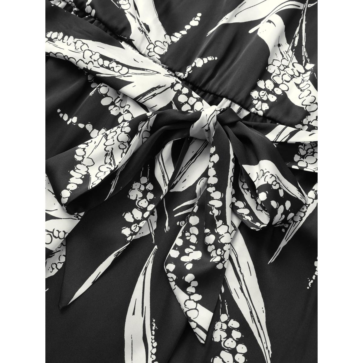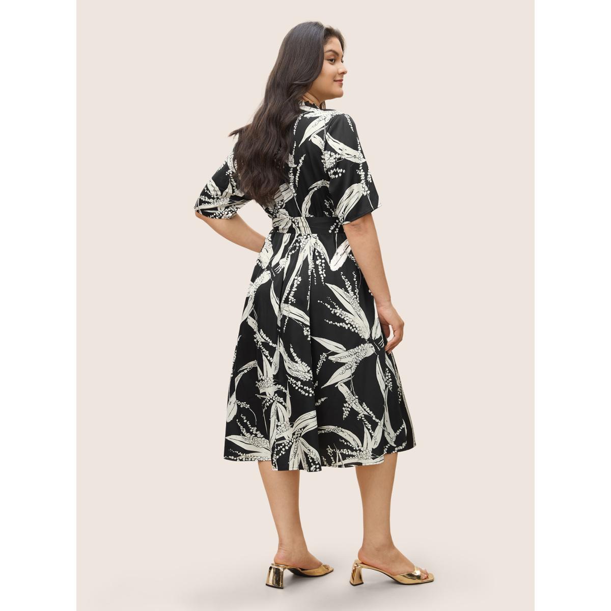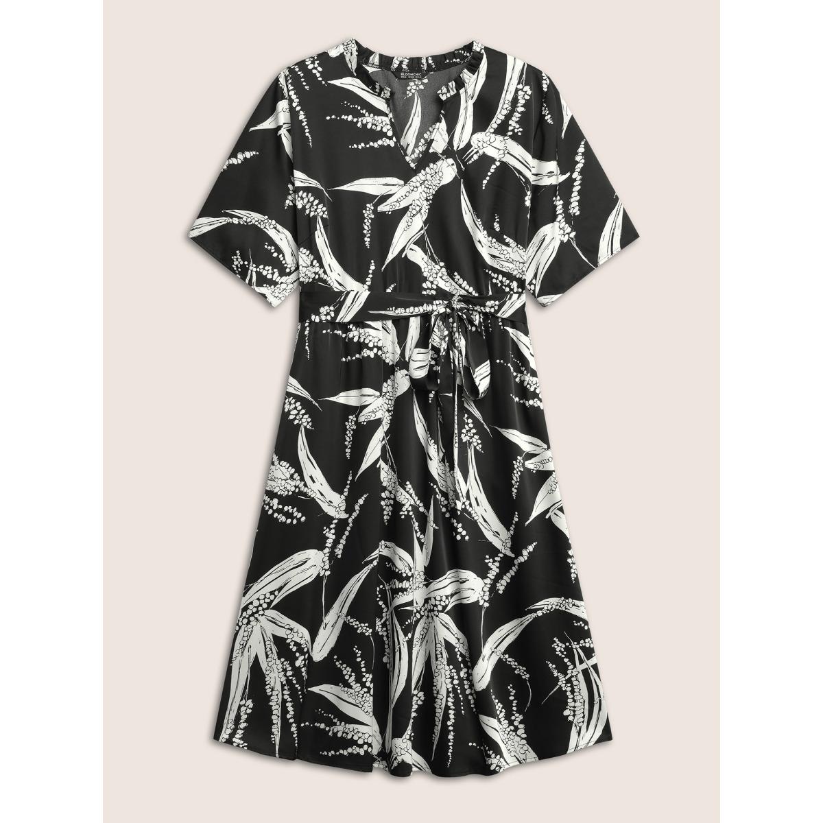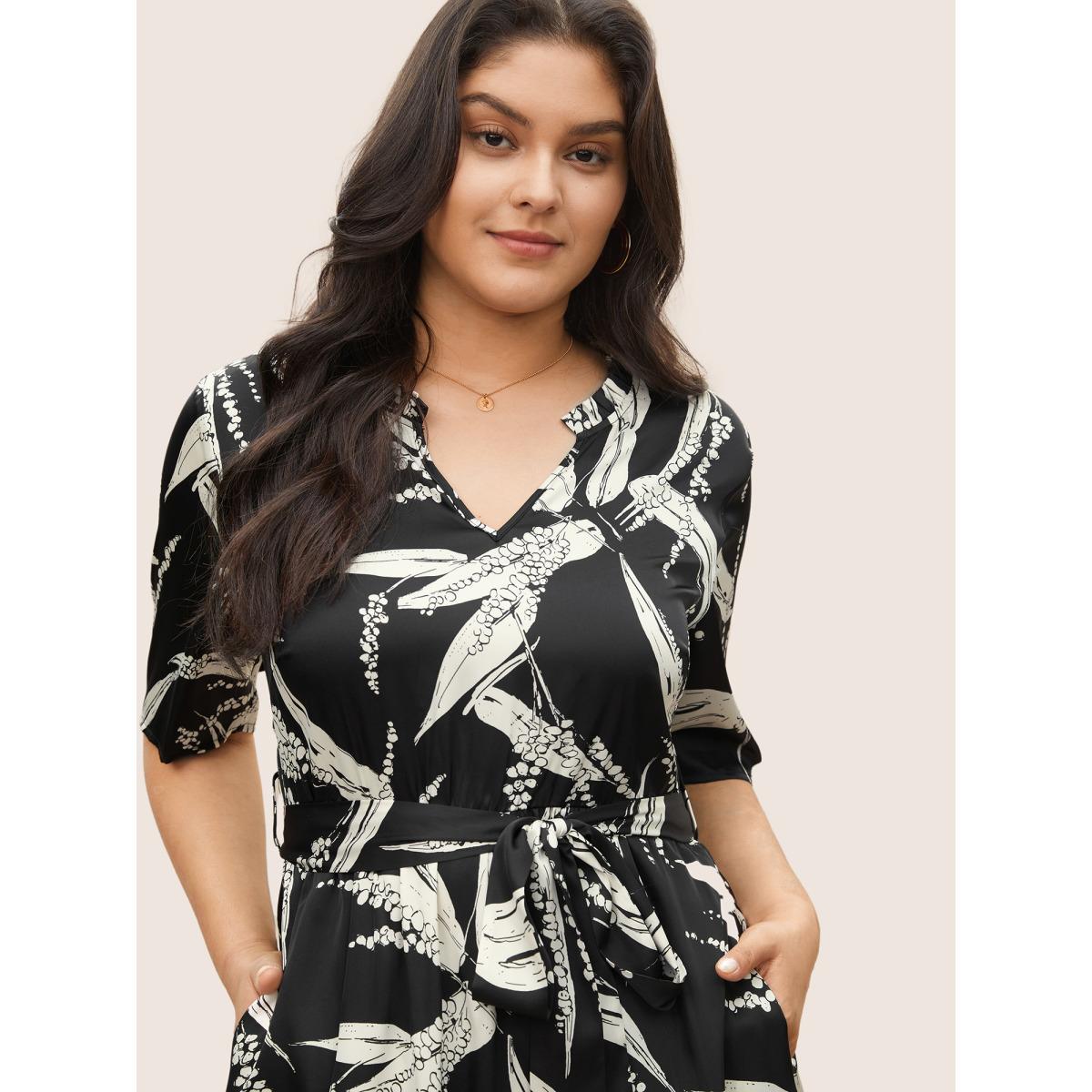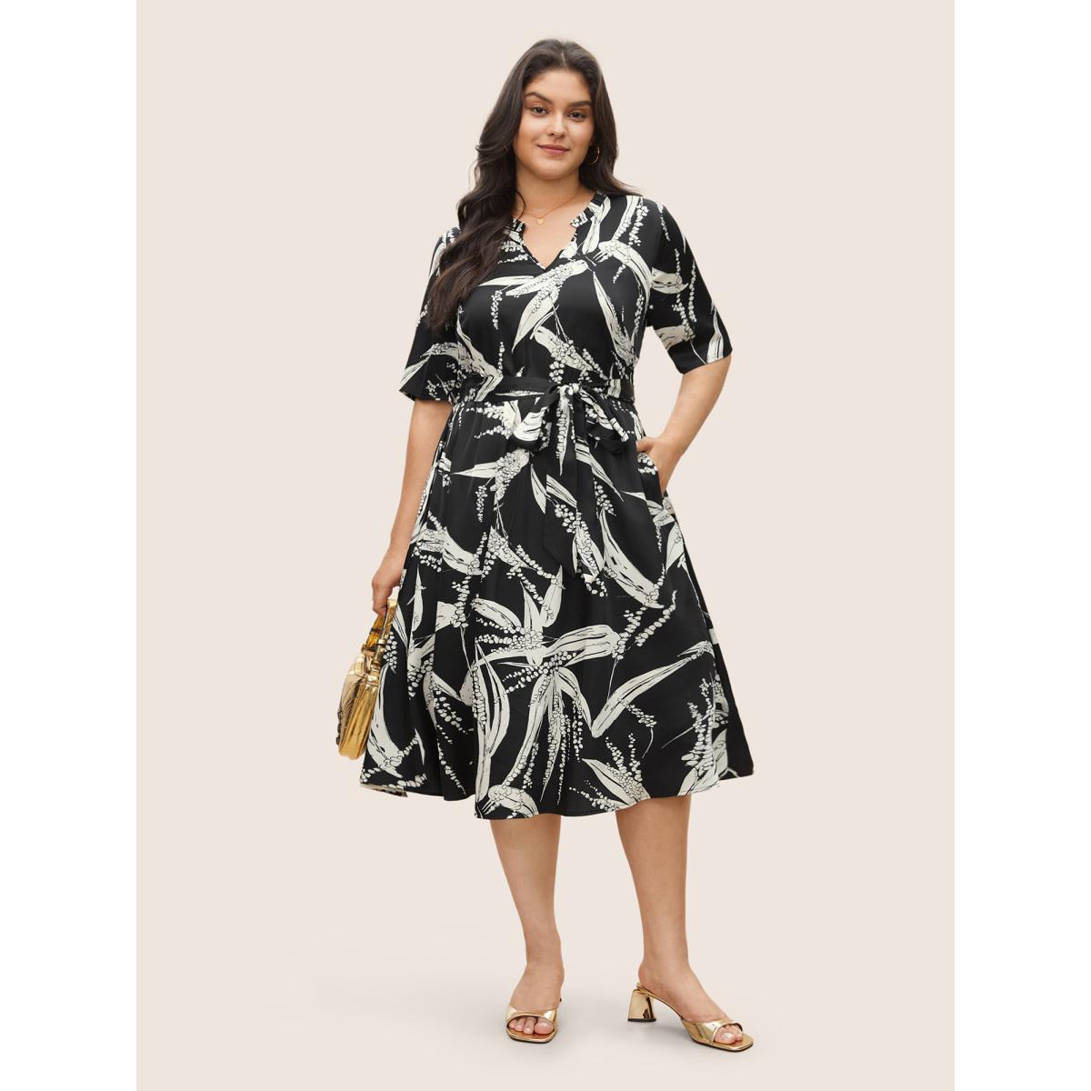 Plus Size Plants Print Notched Belted Pocket Dress Black Women At the Office Non Notched collar Short sleeve Curvy Midi Dress BloomChic 12/L
