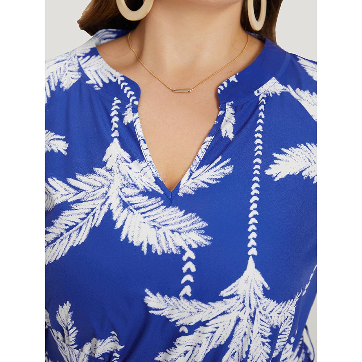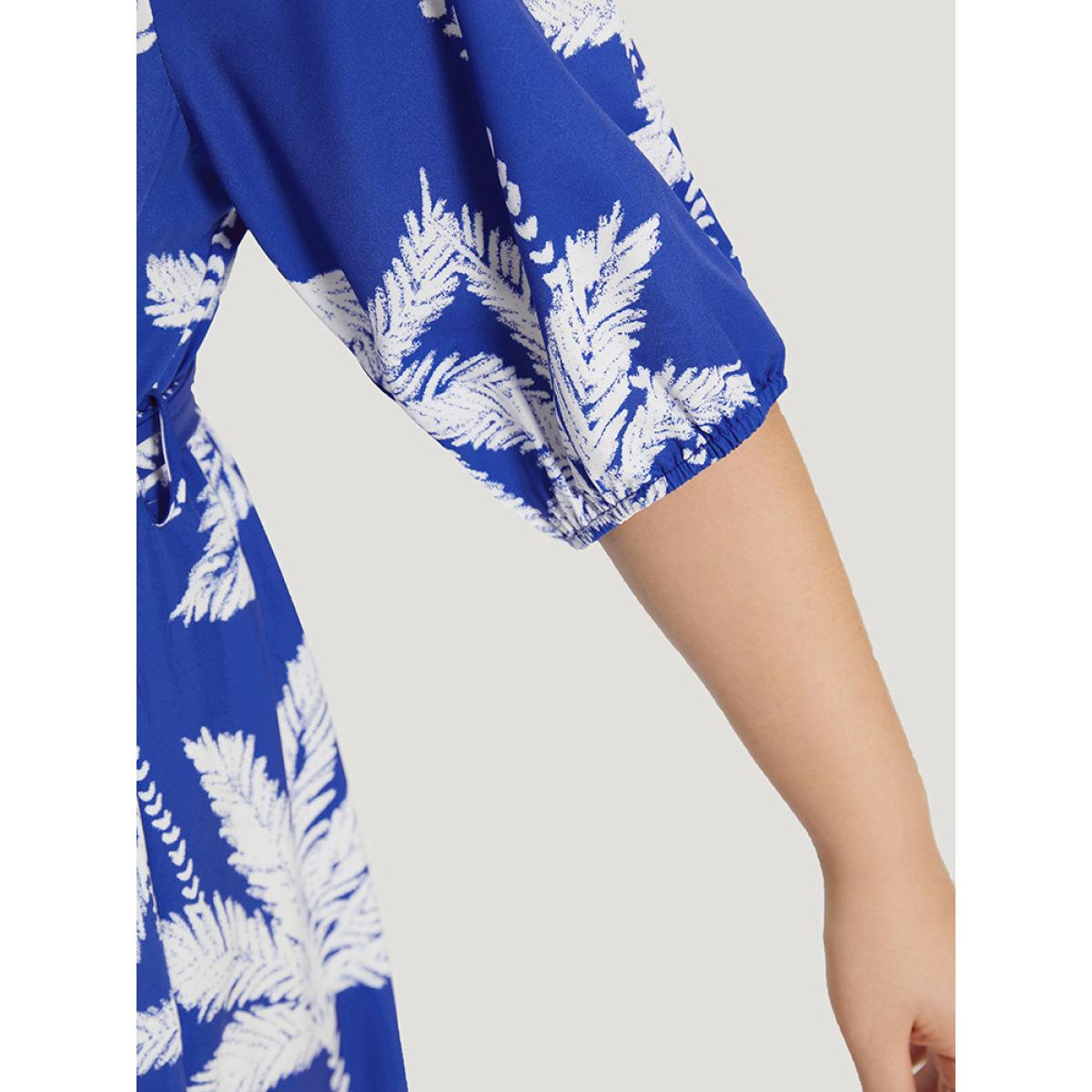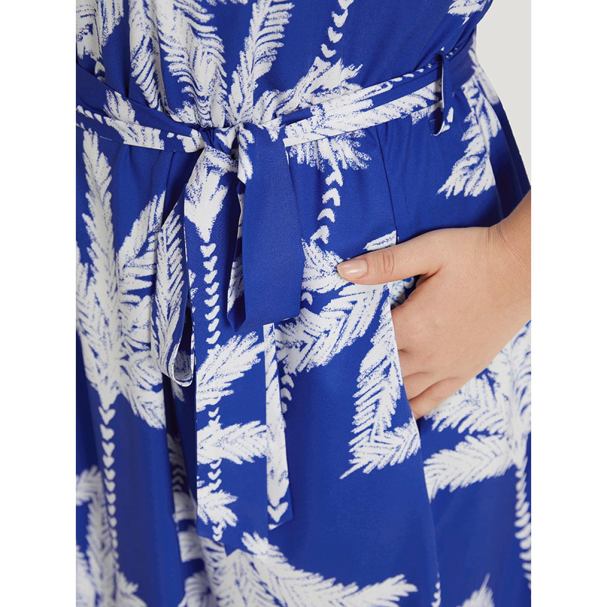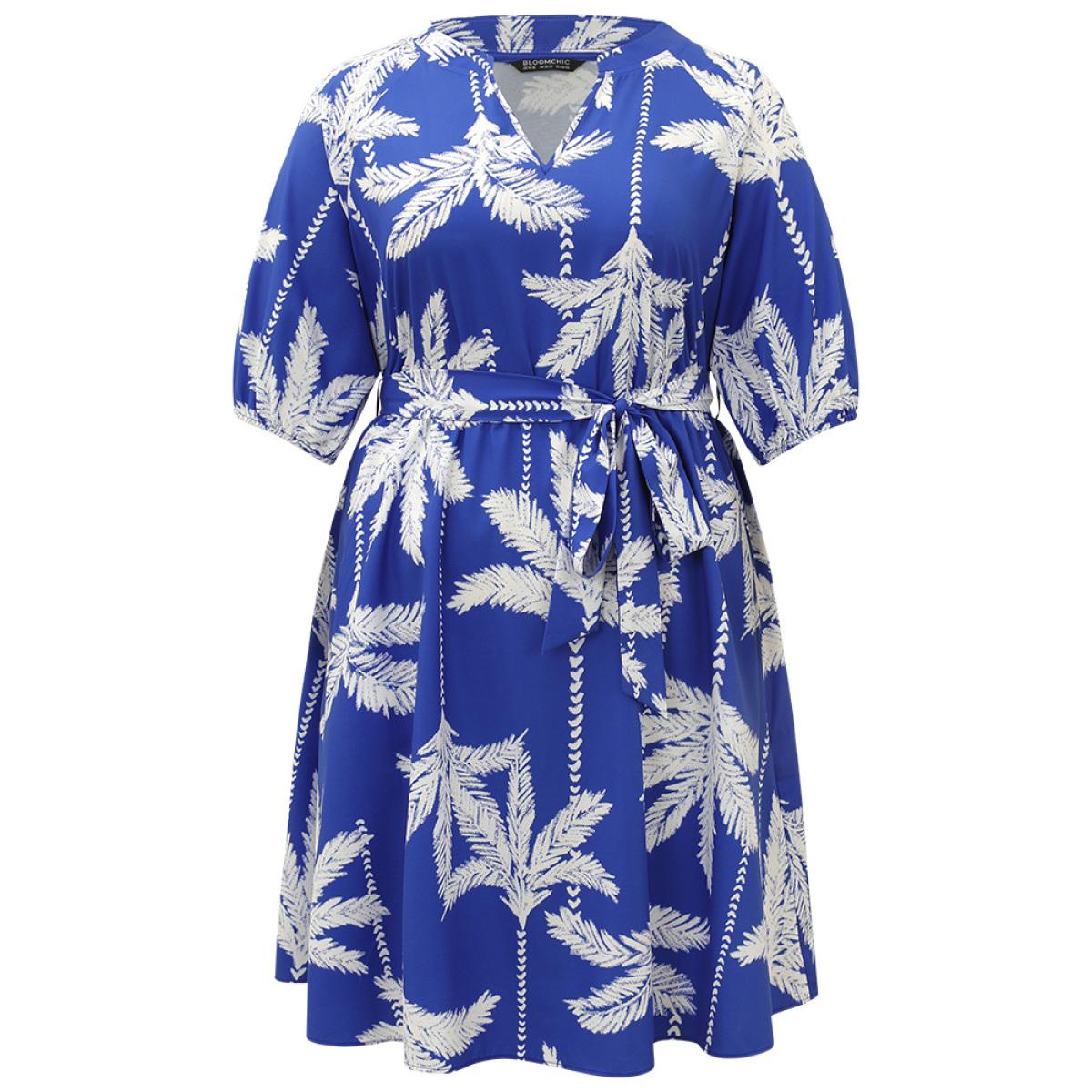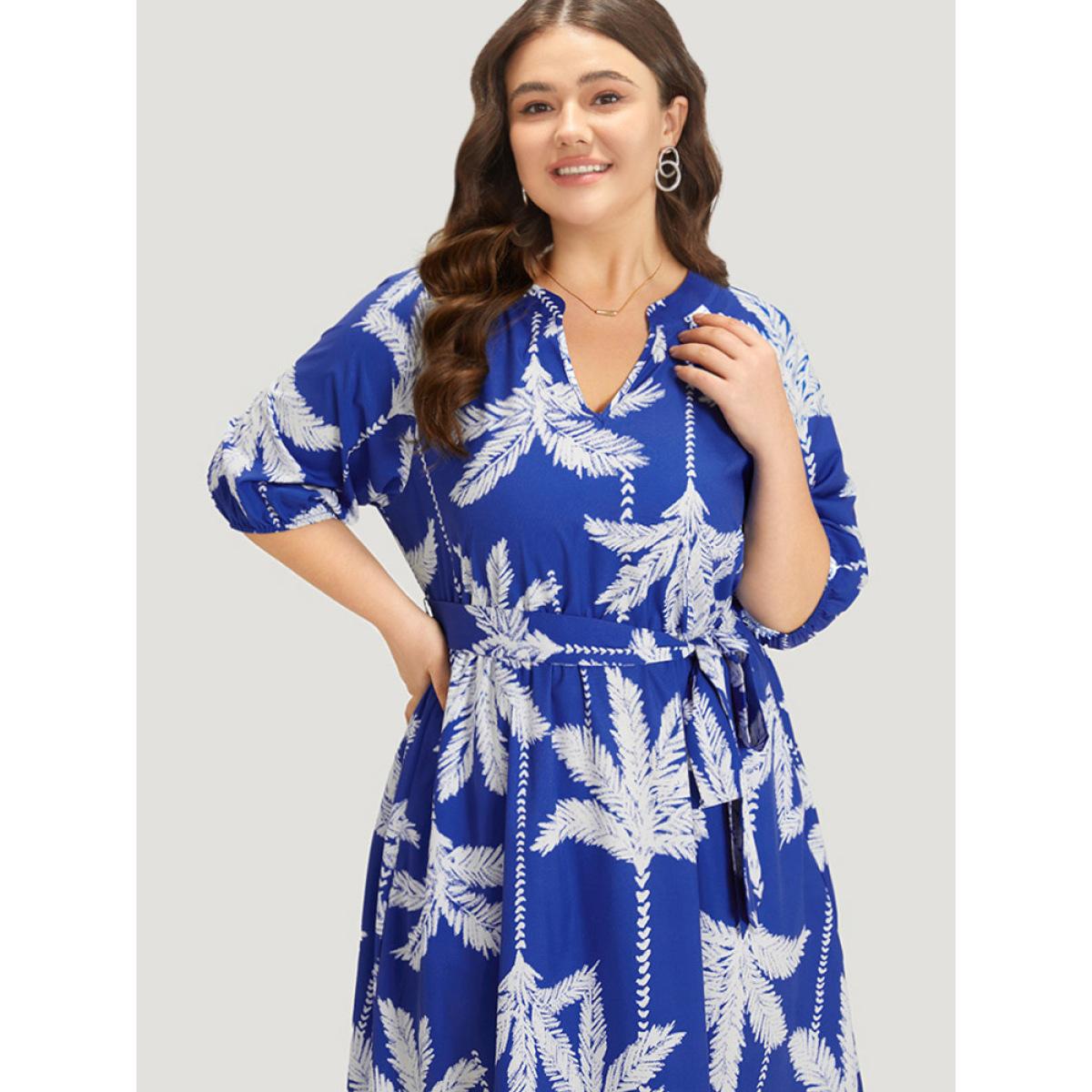 Plus Size Plants Print Notched Pocket Elastic Cuffs Dress Blue Women Vacation Elastic cuffs Notched collar Half Sleeve Curvy Midi Dress BloomChic 14-16/1X