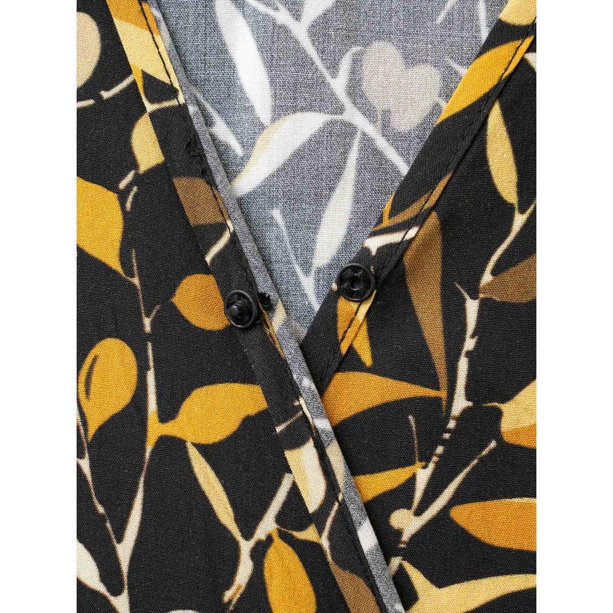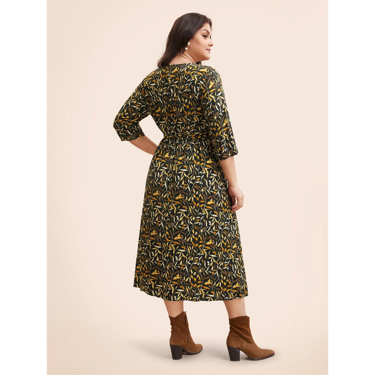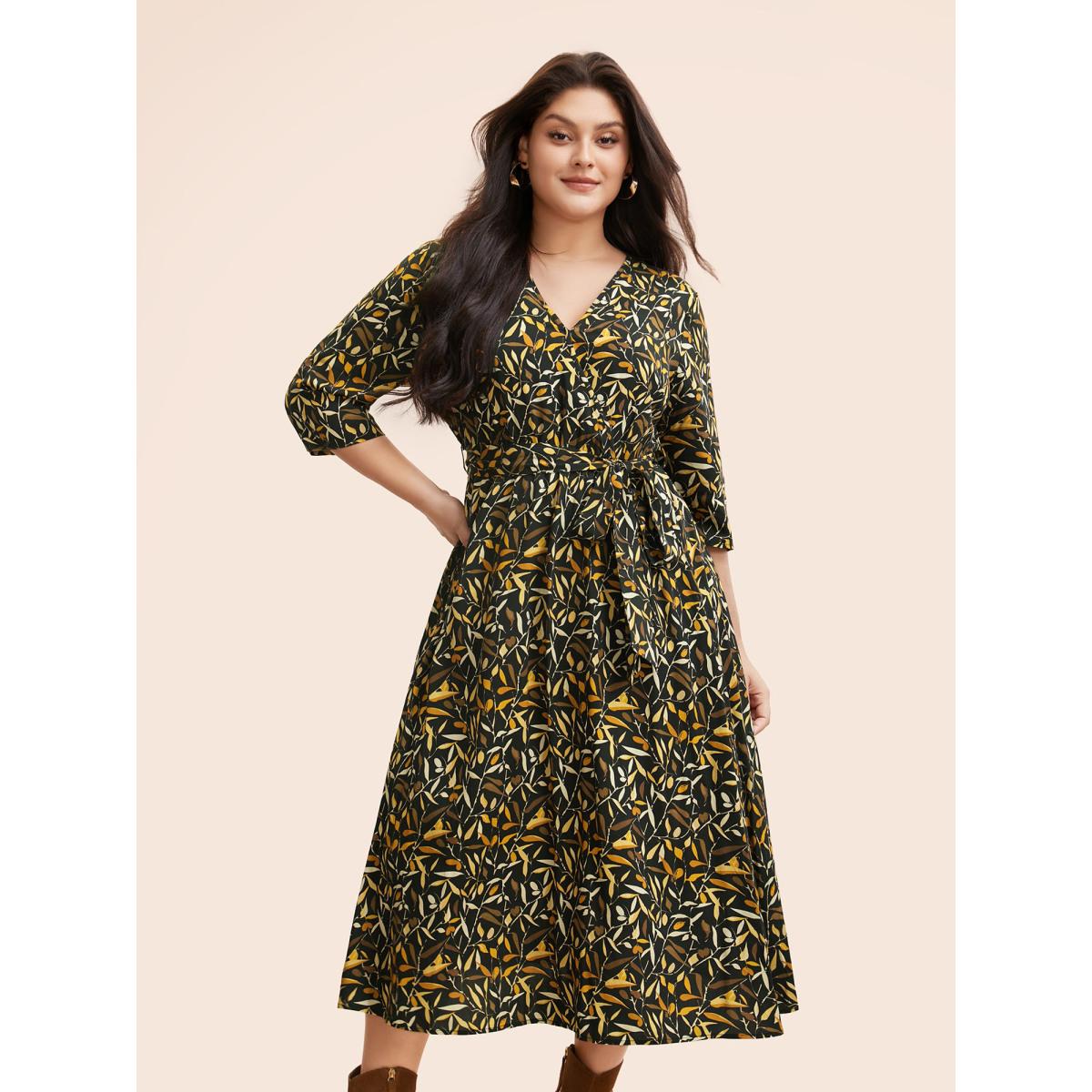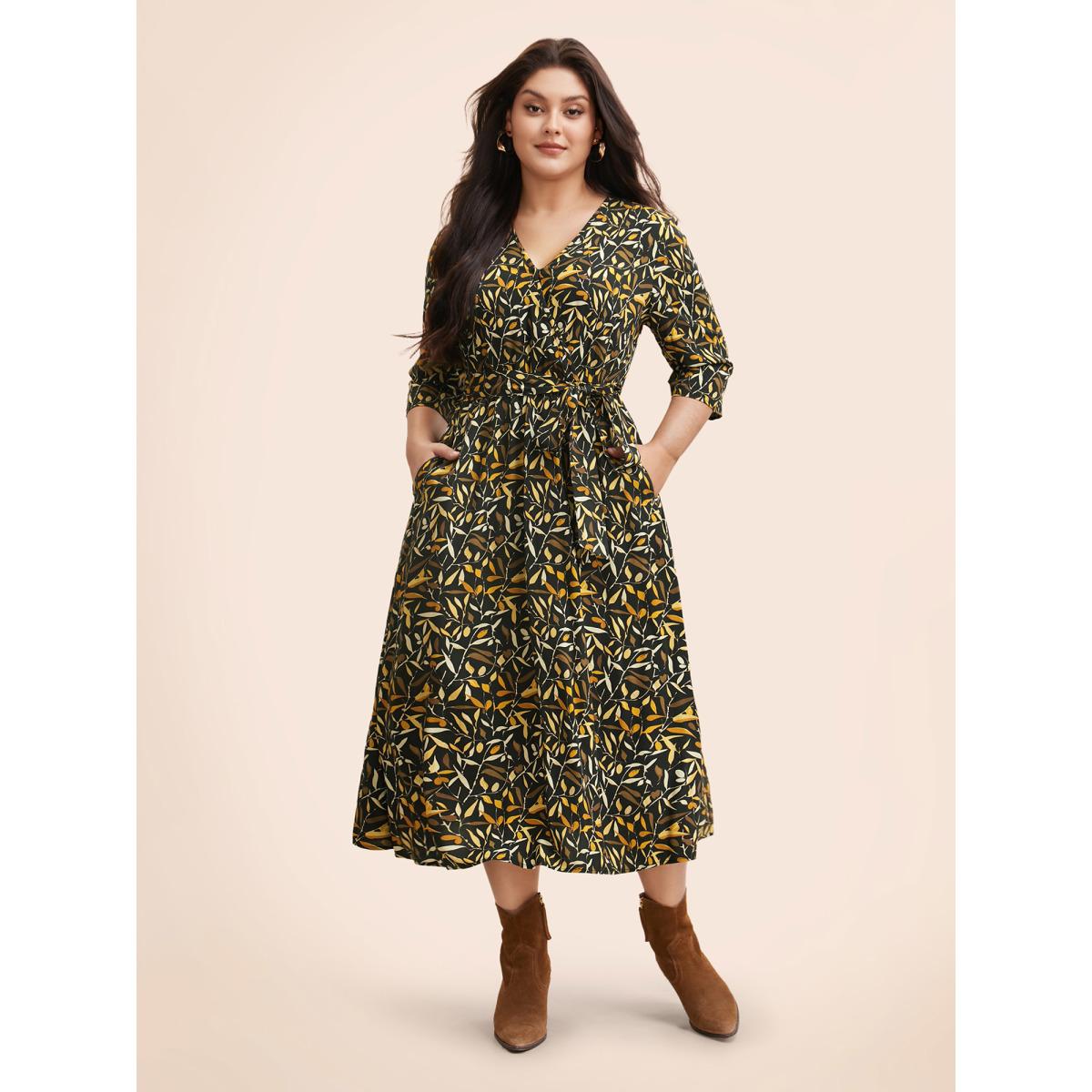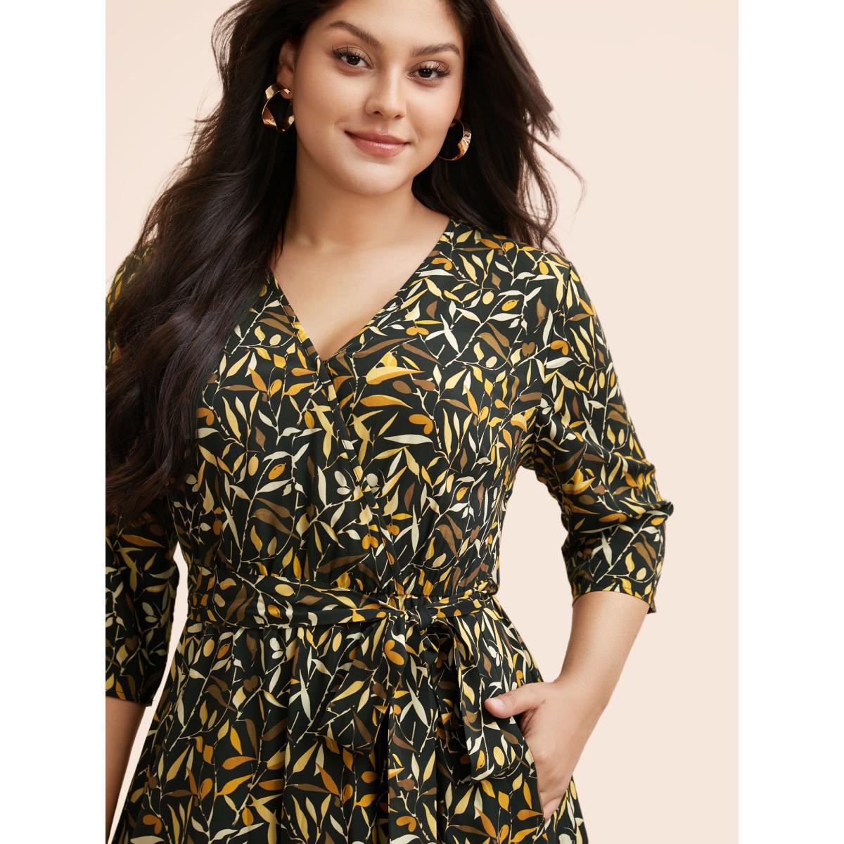 Plus Size Plants Print Overlap Collar Midi Dress Black Women Elegant Belted Overlap Collar Elbow-length sleeve Curvy BloomChic 14-16/1X
