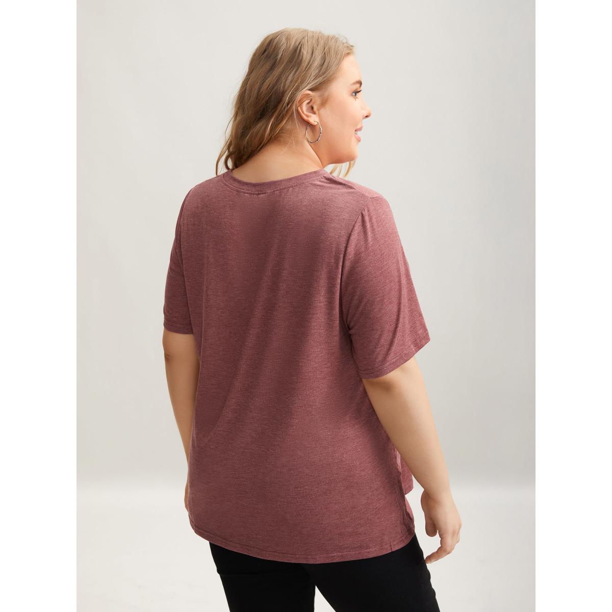 Plus Size Plain Round Neck Button Detail T-shirt Russet Women Casual Plain Plain Round Neck Dailywear T-shirts BloomChic 30/6X