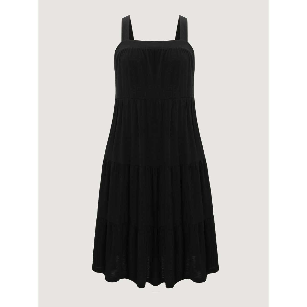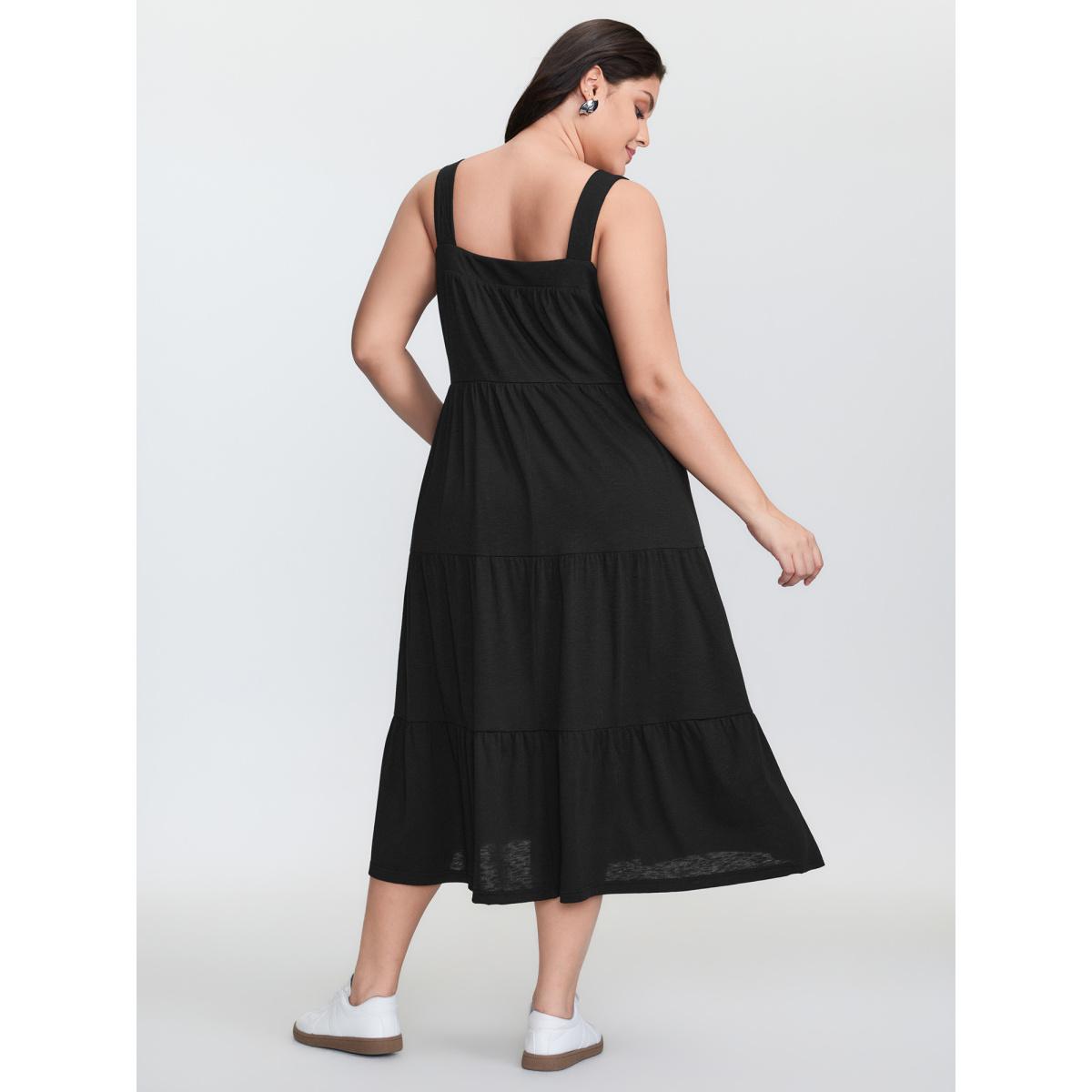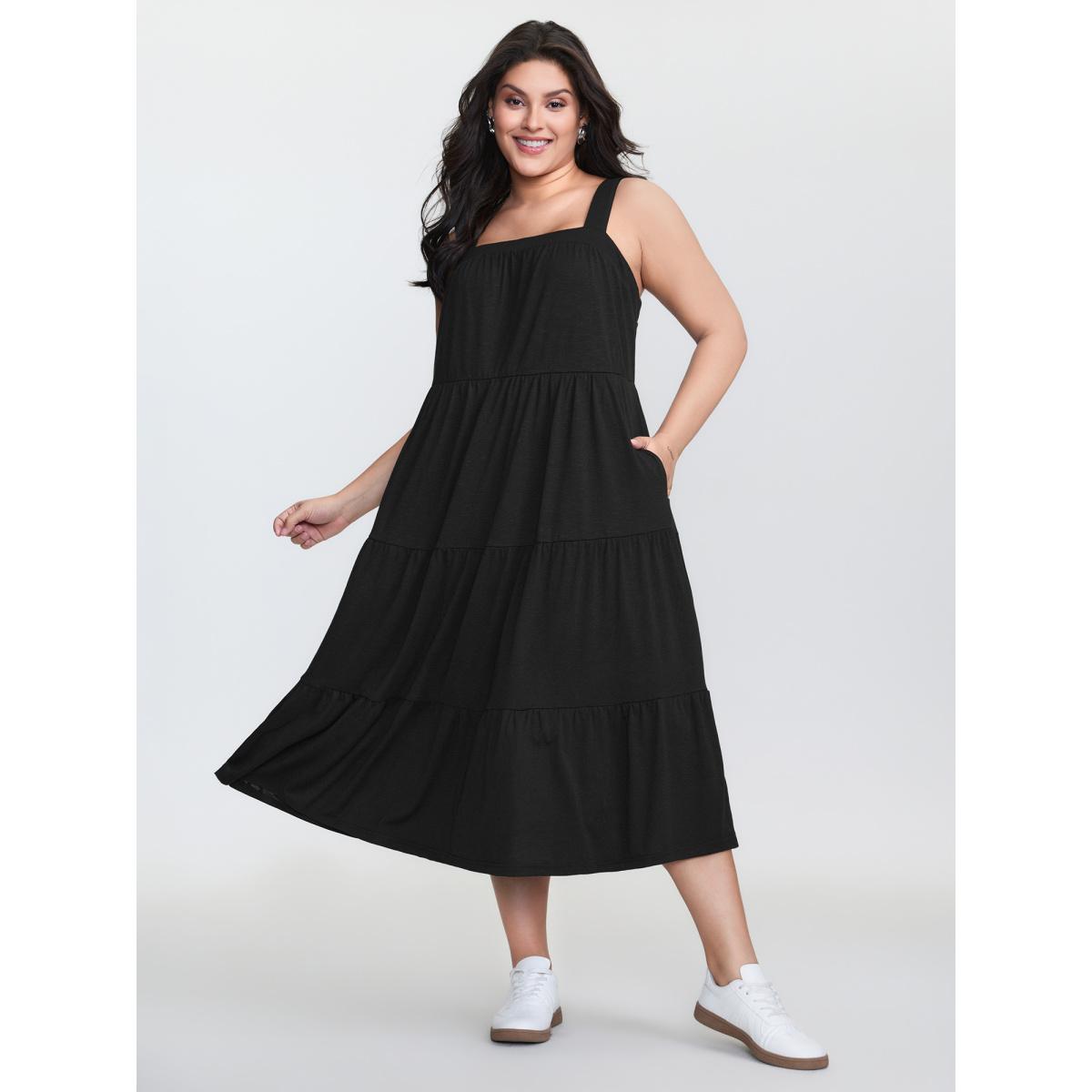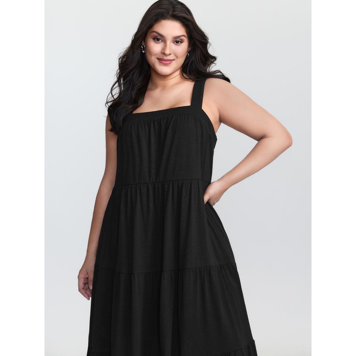 Plus Size Pleated Wide-Straps Plain Midi Dress Black Women Leisure Gathered Square Neck Sleeveless Curvy BloomChic 30/6X